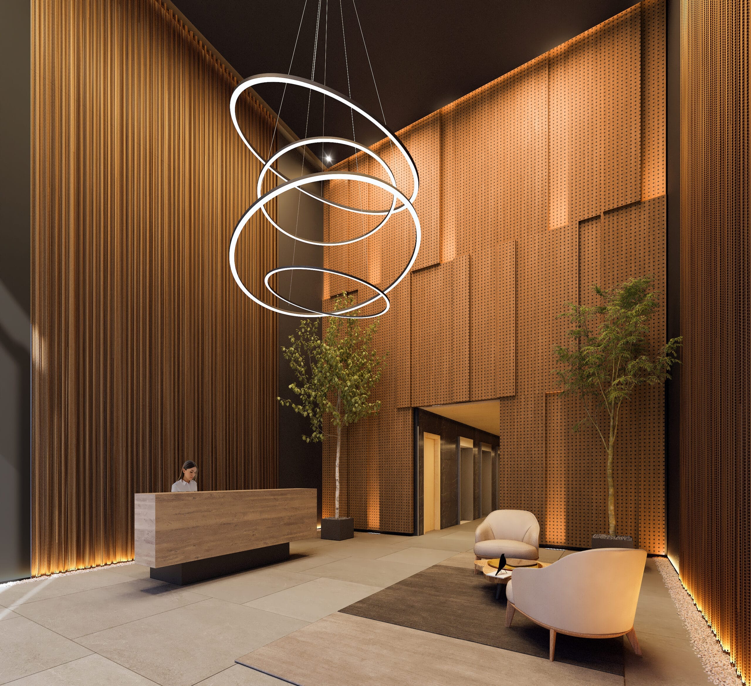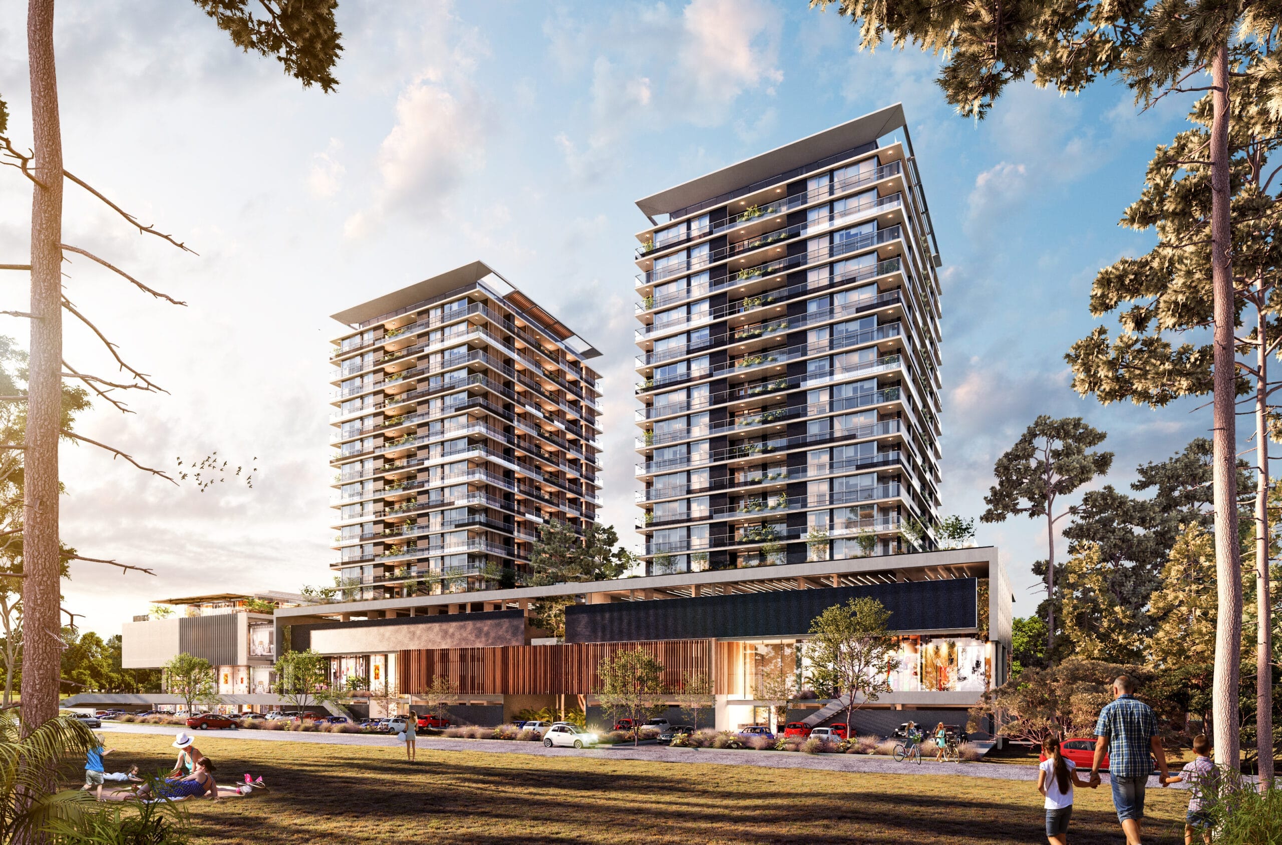 Las torres se componen de un basamento, planta baja comercial, trece pisos que albergan el programa principal según la torre y un último nivel con amenidades. Se ha diseñado una planta tipo con el núcleo de circulaciones y servicios en el centro. Los volúmenes se destacan por su diseño exento, lo que libera las fachadas y optimiza las vistas. El diseño de las fachadas se basa en una modulación que combina ritmos para aberturas, paneles y jardineras que integran la naturaleza en los edificios. Detalles de hormigón y celosías de madera buscan crear un contraste con el uso de vidrio en las fachadas. La expresión de líneas horizontales se refuerza mediante bordes de losa y barandas vidriadas.