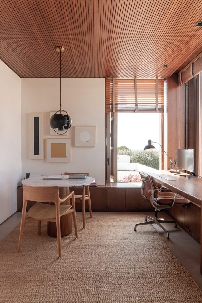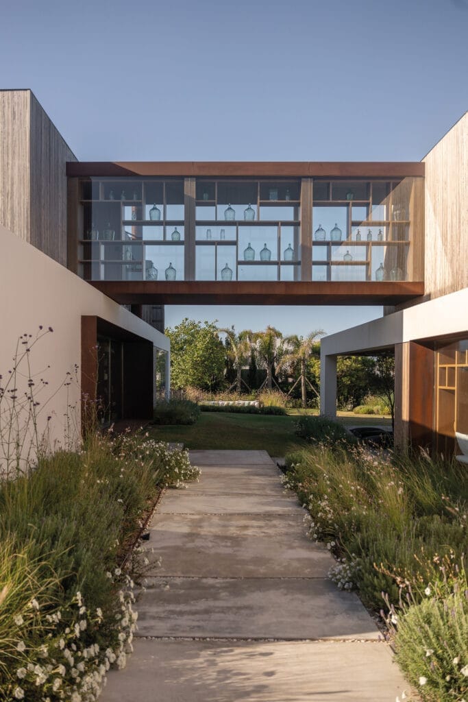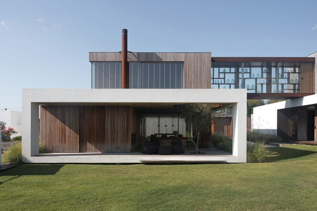 Esta casa es particular por varias razones. Consiste en dos volúmenes que se conectan mediante un puente de acero corten transparente, formando una estructura en forma de “H” que define claramente los distintos espacios destinados para uso social y privado. El ingreso a la casa es imponente y ofrece una vista profunda del entorno, conectando directamente con el jardín. Los volúmenes tienen una apariencia sólida en la planta baja y están revestidos de madera en la planta alta, con grandes ventanales de acero corten que resuelven su contención. Esta combinación de formas y texturas le da personalidad a la casa, y los materiales utilizados resaltan su ubicación y relación con el entorno. E l proyecto se caracteriza por tener un diseño en el que las diferentes partes se encajan entre sí como las piezas de un de un puzzle, la casa se compone de varias secciones, cada una con su propia función y apariencia, que se unen de manera armoniosa y coherente con un diseño innovador y la forma en que se integra en el entorno. Cada parte de la casa tiene una función específica, lo que significa que puede adaptarse a las necesidades de los residentes y ofrecer soluciones personalizadas.
