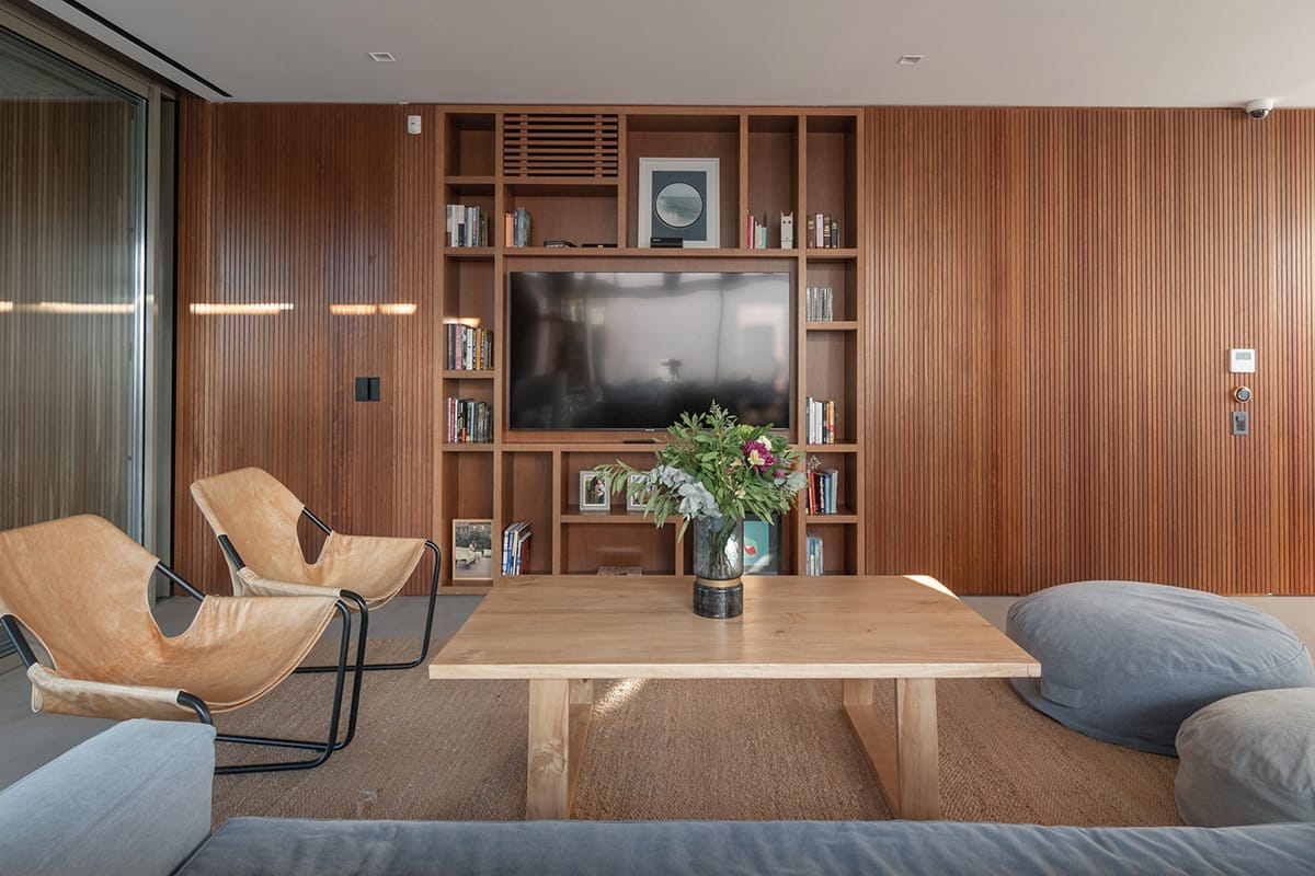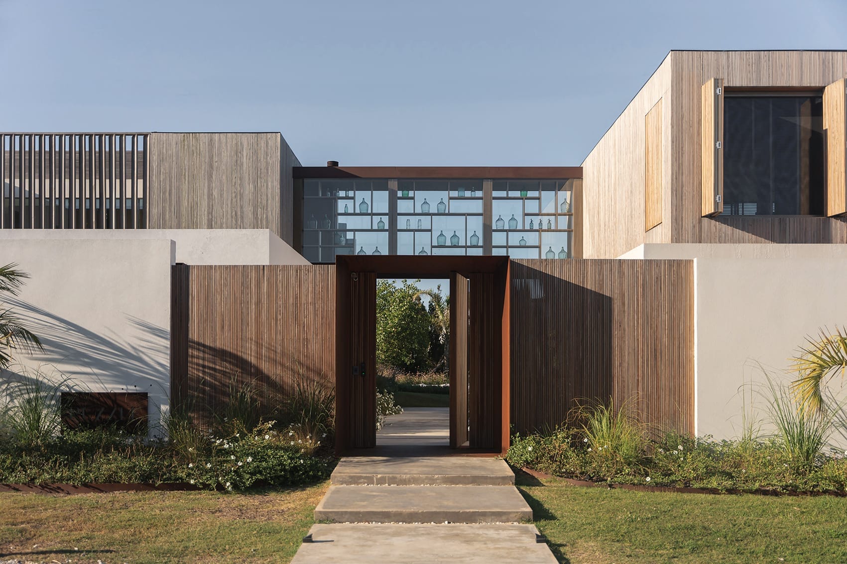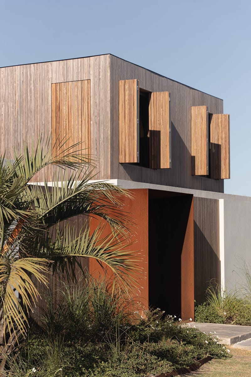 Esta casa es particular por varias razones. Consiste en dos volúmenes que se conectan mediante un puente de acero corten transparente, formando una estructura en forma de “H” que define claramente los distintos espacios destinados para uso social y privado. El ingreso a la casa es imponente y ofrece una vista profunda del entorno, conectando directamente con el jardín. Los volúmenes tienen una apariencia sólida en la planta baja y están revestidos de madera en la planta alta, con grandes ventanales de acero corten que resuelven su contención. Esta combinación de formas y texturas le da personalidad a la casa, y los materiales utilizados resaltan su ubicación y relación con el entorno. E l proyecto se caracteriza por tener un diseño en el que las diferentes partes se encajan entre sí como las piezas de un de un puzzle, la casa se compone de varias secciones, cada una con su propia función y apariencia, que se unen de manera armoniosa y coherente con un diseño innovador y la forma en que se integra en el entorno. Cada parte de la casa tiene una función específica, lo que significa que puede adaptarse a las necesidades de los residentes y ofrecer soluciones personalizadas.