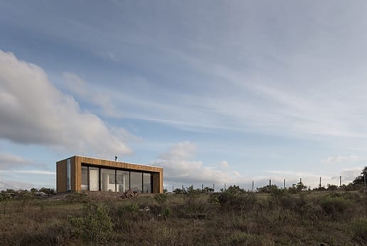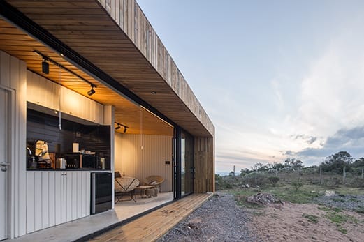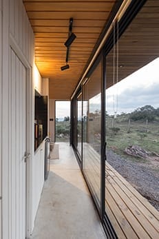 paisaje en su entorno. El diseño se centra en aprovechar la topografía del terreno, utilizando la vivienda como un umbral entre la calle y el paisaje del valle. Se crea una experiencia de transición espacial única, donde la arquitectura funciona como un túnel que invita al usuario a atravesarlo y descubrir una nueva dimensión del paisaje. Esta sensación se logra mediante una espacialidad semi-exterior continua que conecta el living-comedor con el túnel lateral que conduce al refugio. Para garantizar un mantenimiento mínimo y una fácil instalación, se optó por una