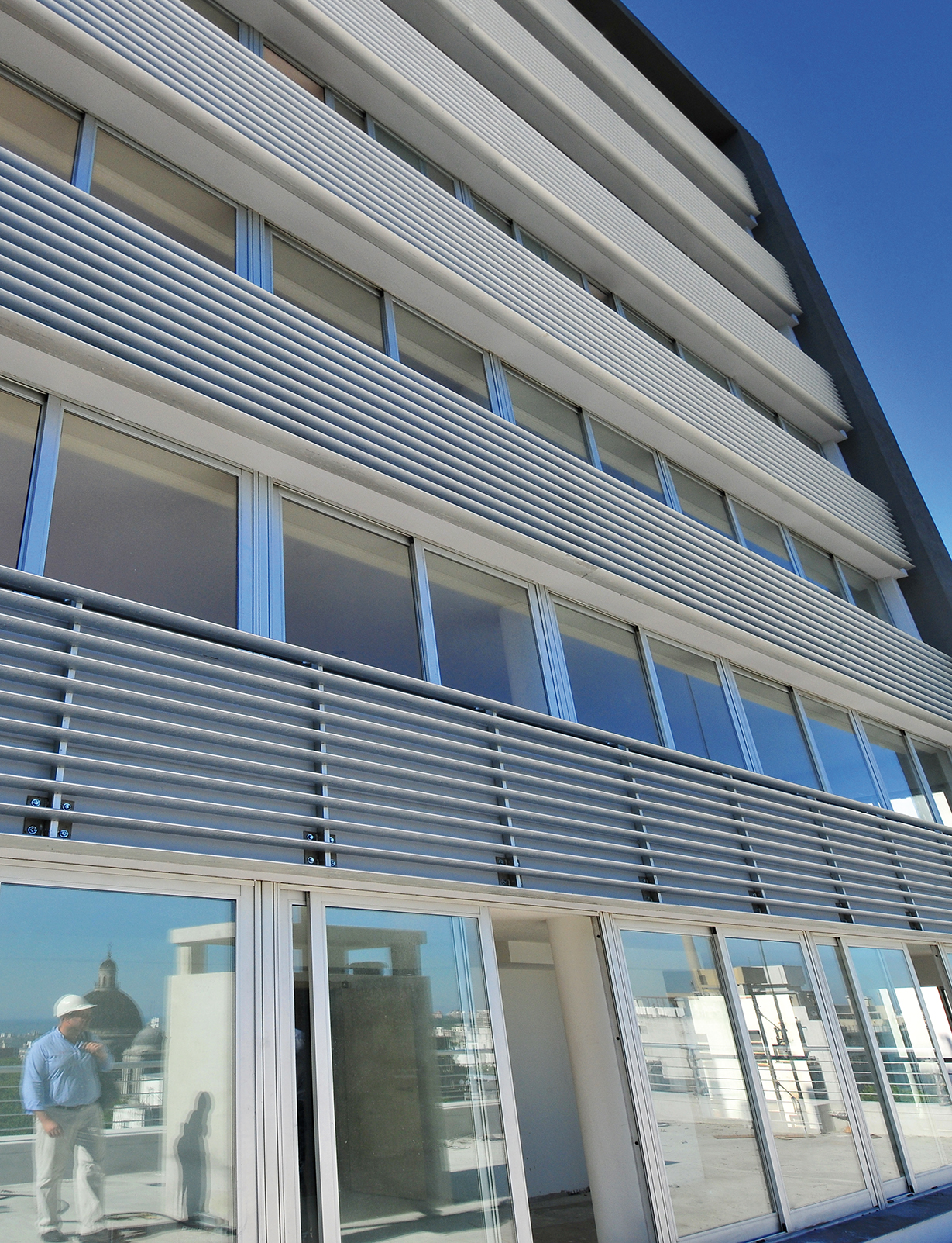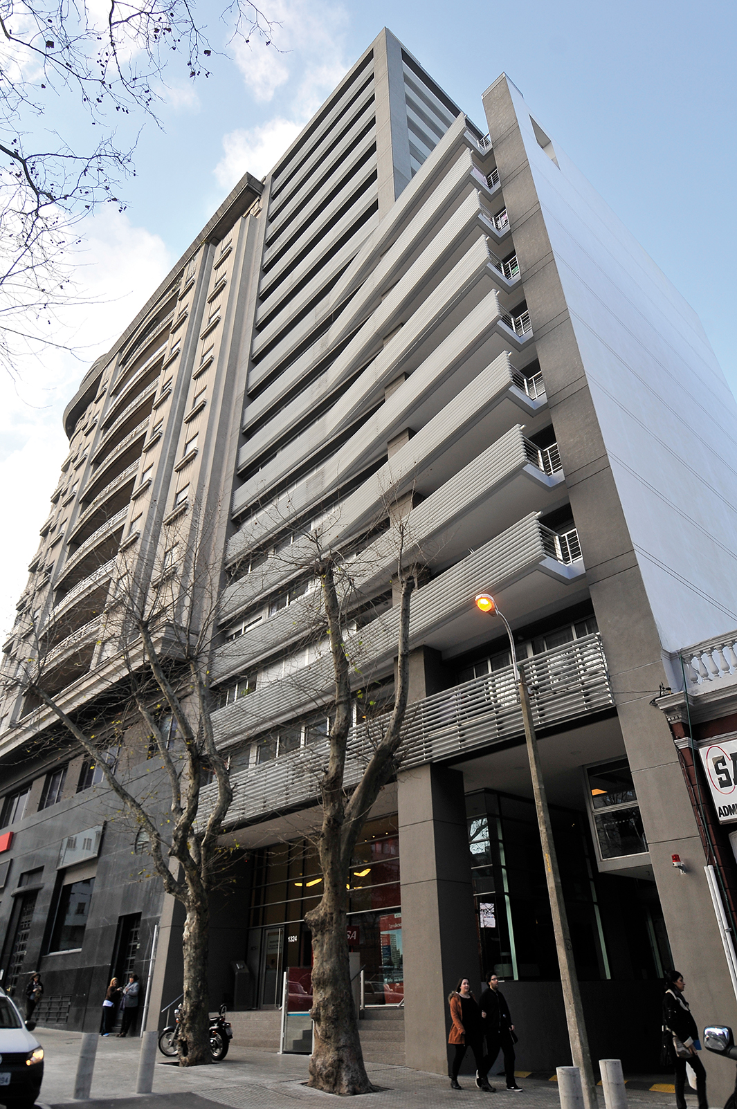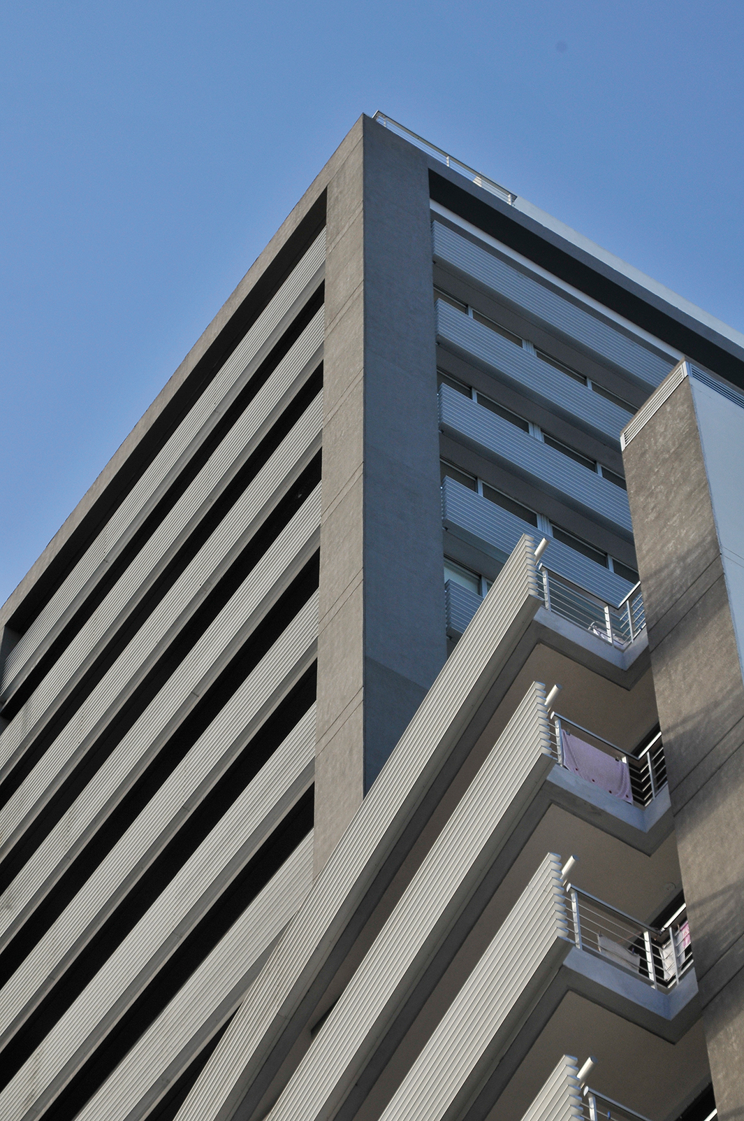 Sobre la fachada, antepechos continuos dibujan una seguidilla de bandas horizontales y tras este primer plano aparece la segunda fachada, acristalada, que posibilita amplias vistas desde todas las unidades de viviendas, a lo largo de todos los niveles de la torre. Además del plano acristalado, la edificación posee una terminación en revoques de hormigón visto, paneles de revestimiento y perfilería en aluminio, detalles que cierran la composición del volumen, complementan su ligereza visual y, en su condición material, apoyan la respuesta de una arquitectura consecuente con el propósito de adaptarse al ritmo de un estilo de vida contemporáneo.