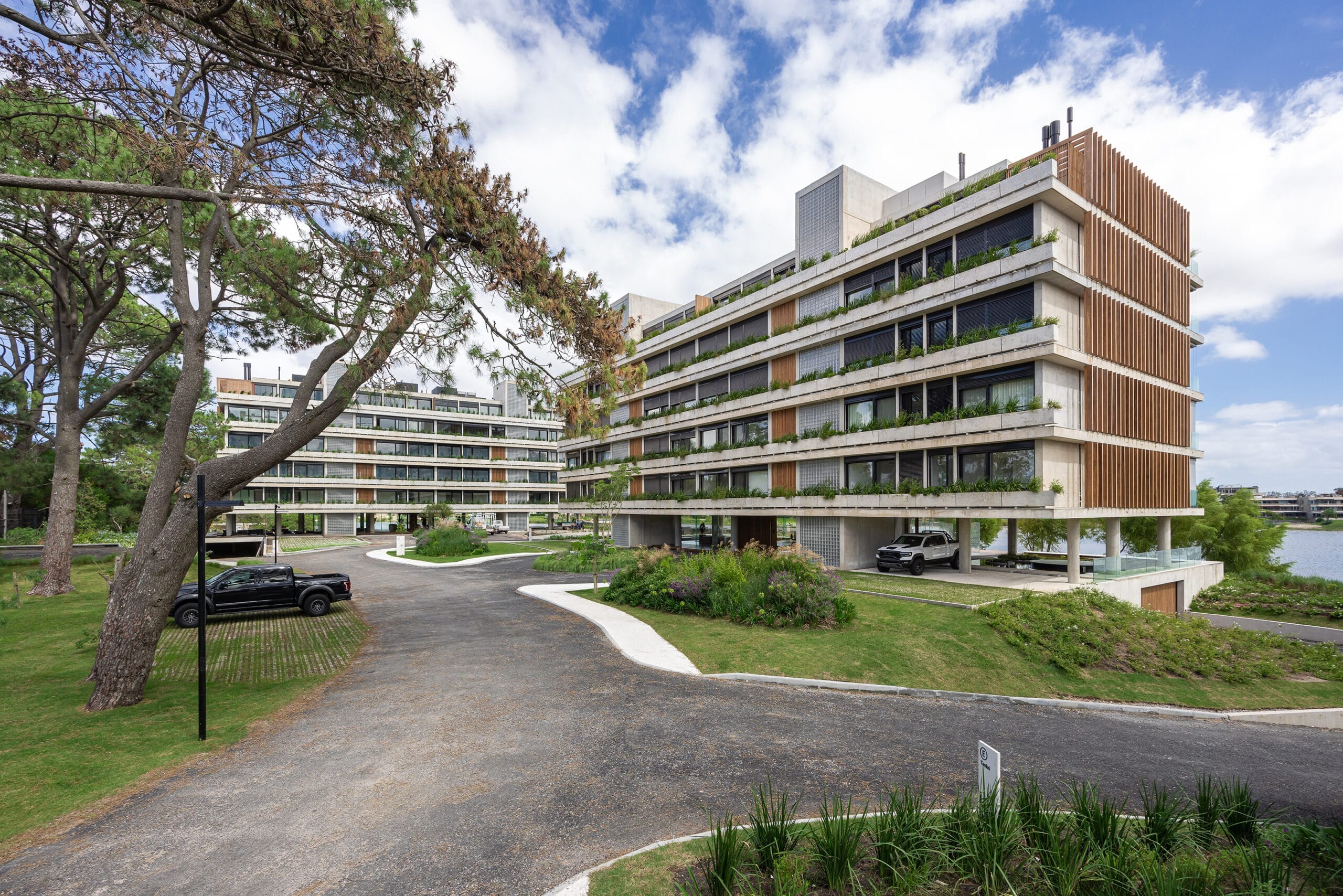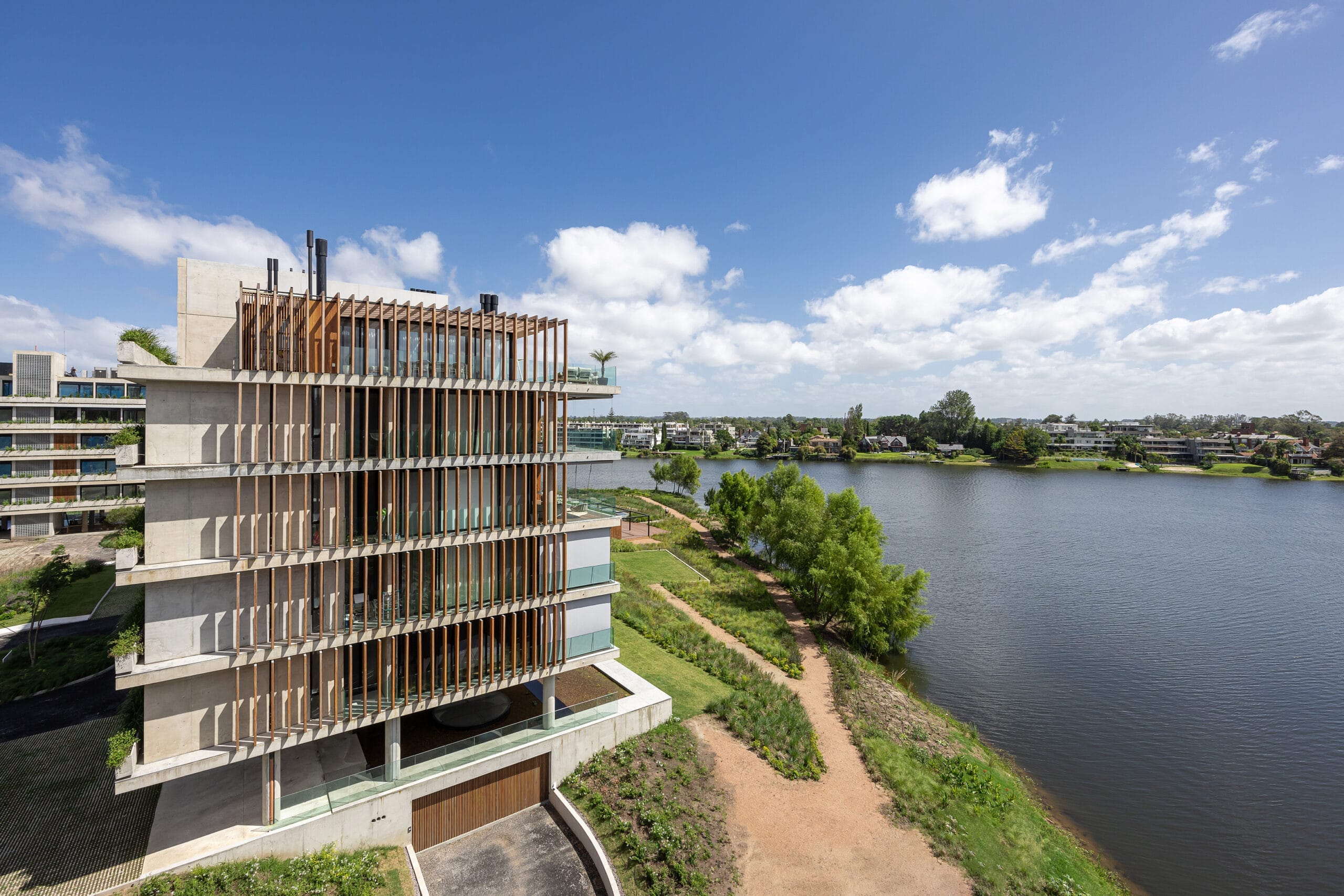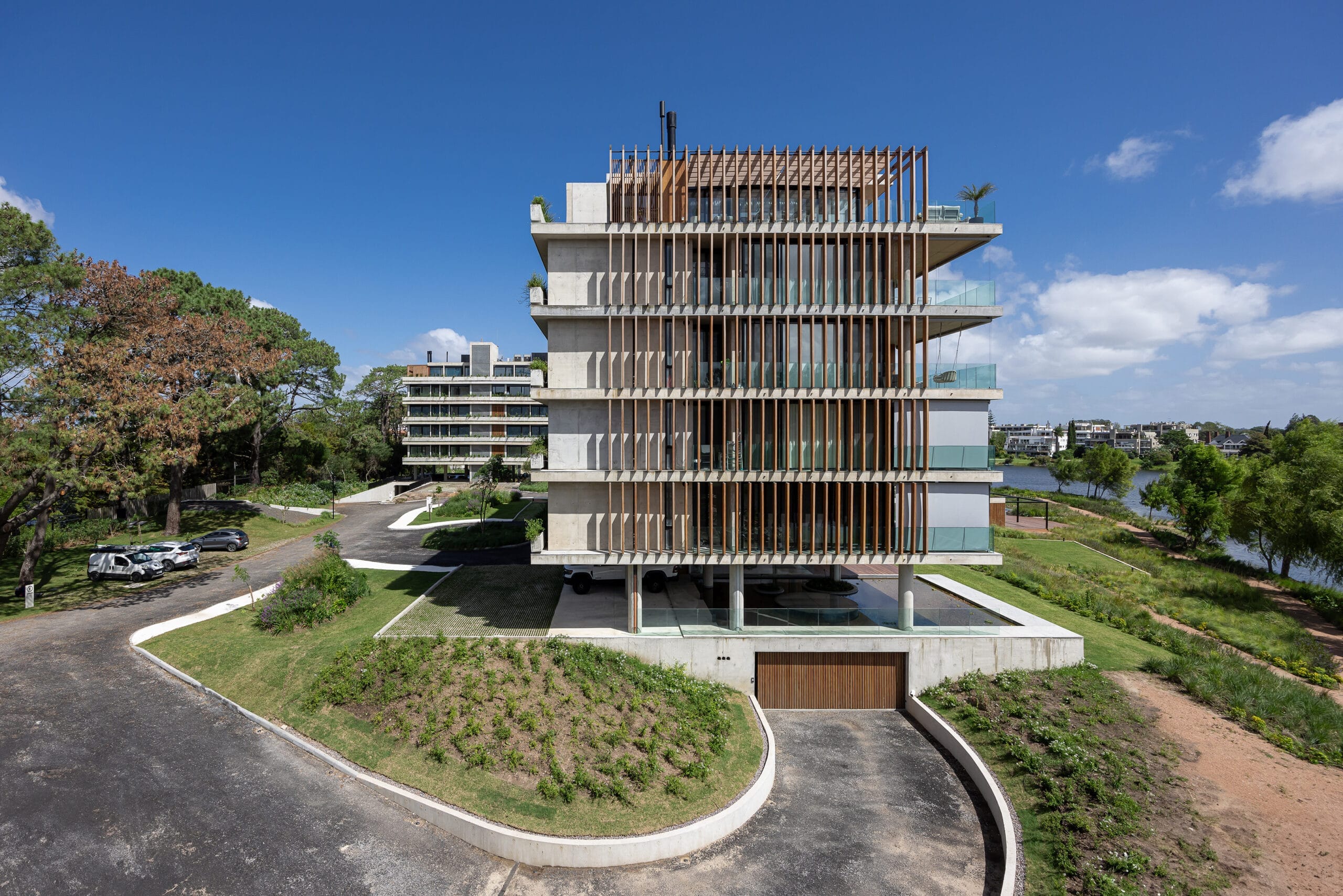 El proyecto se desarrolla en un predio con cualidades paisajísticas únicas, ubicado en el Lago de La Caleta en la zona de mayor expansión residencial al este de Montevideo.