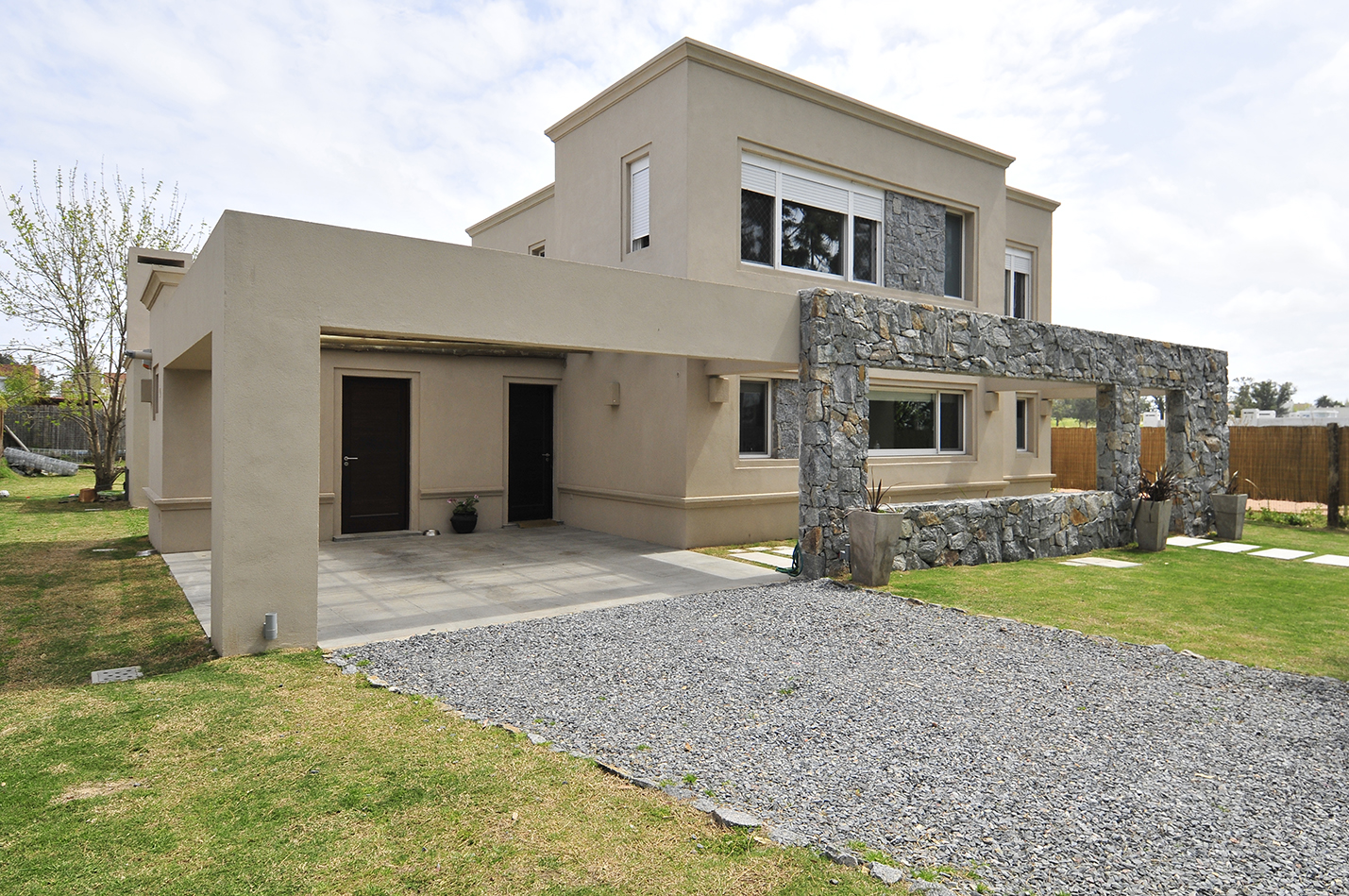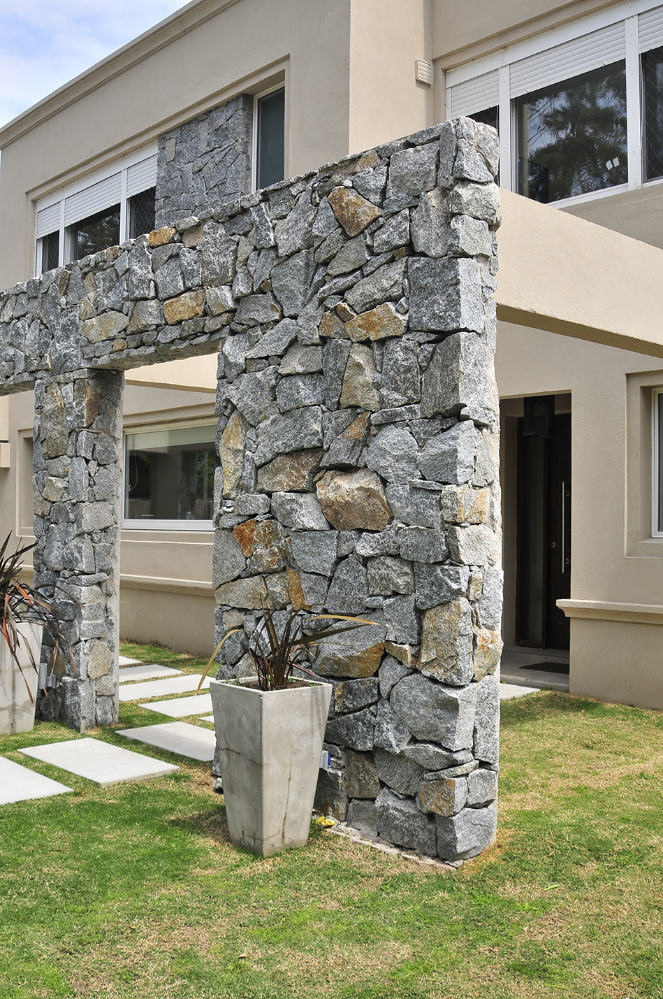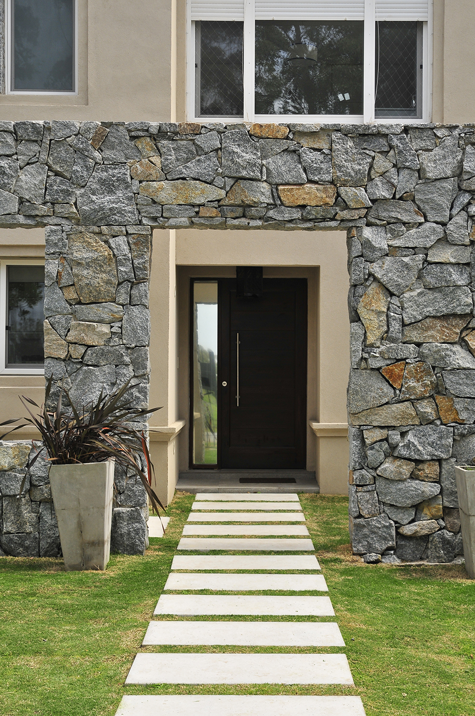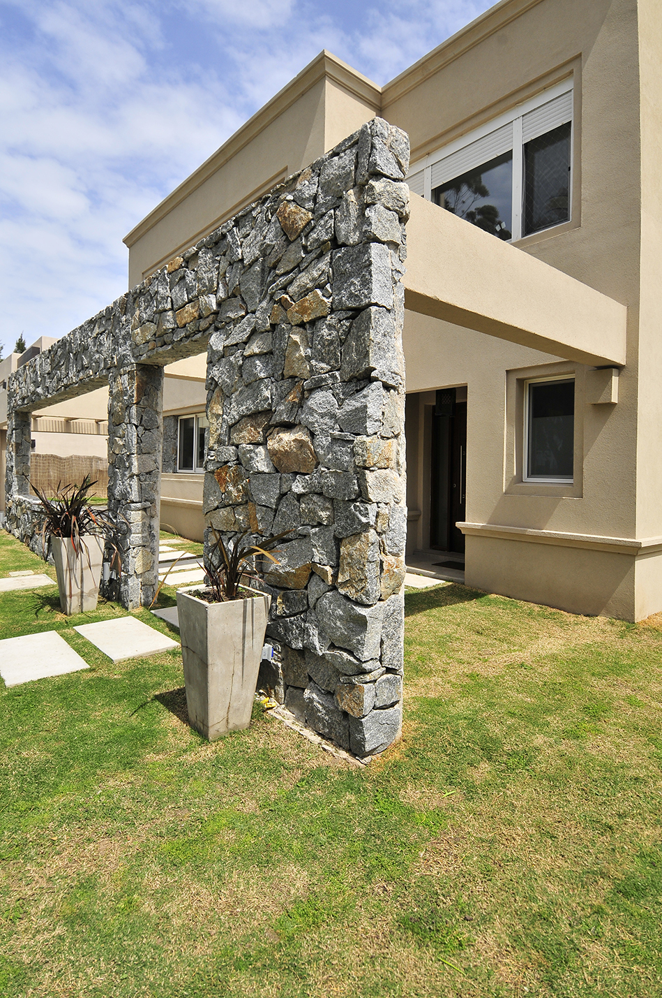 En esta vivienda unifamiliar los arquitectos buscan un lenguaje ecléctico moderno, generando espacios abiertos y ambientes luminosos sin dejar de lado la tradición. De esta manera se insertan detalles rústicos dentro de un estilo de volúmenes modernos con molduras, realizando una mezcla que los caracteriza. Como en varias de sus viviendas proyectadas, el volumen del acceso se realza mediante el uso de materiales rústicos y naturales, como la piedra utilizada para revestir el acceso y el recurso del atrio como patio que precede a la entrada, generando un espacio para el ritual del encuentro previo al ingreso a la privacidad del hogar.