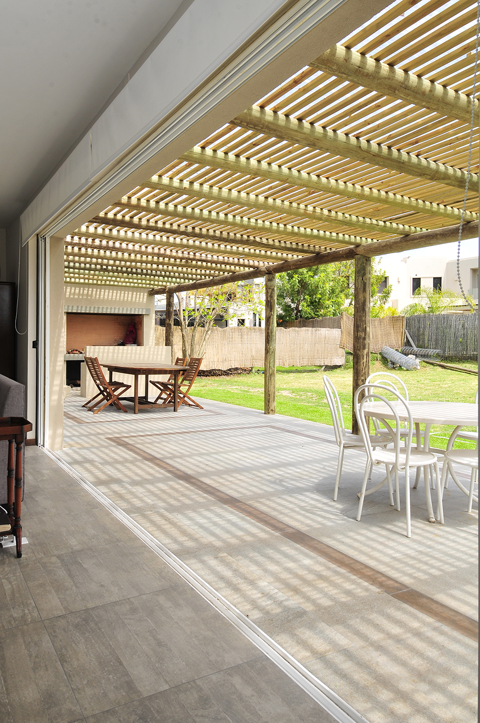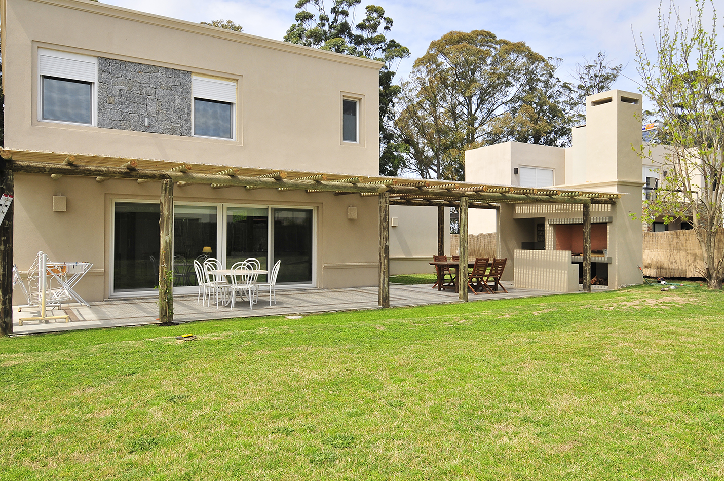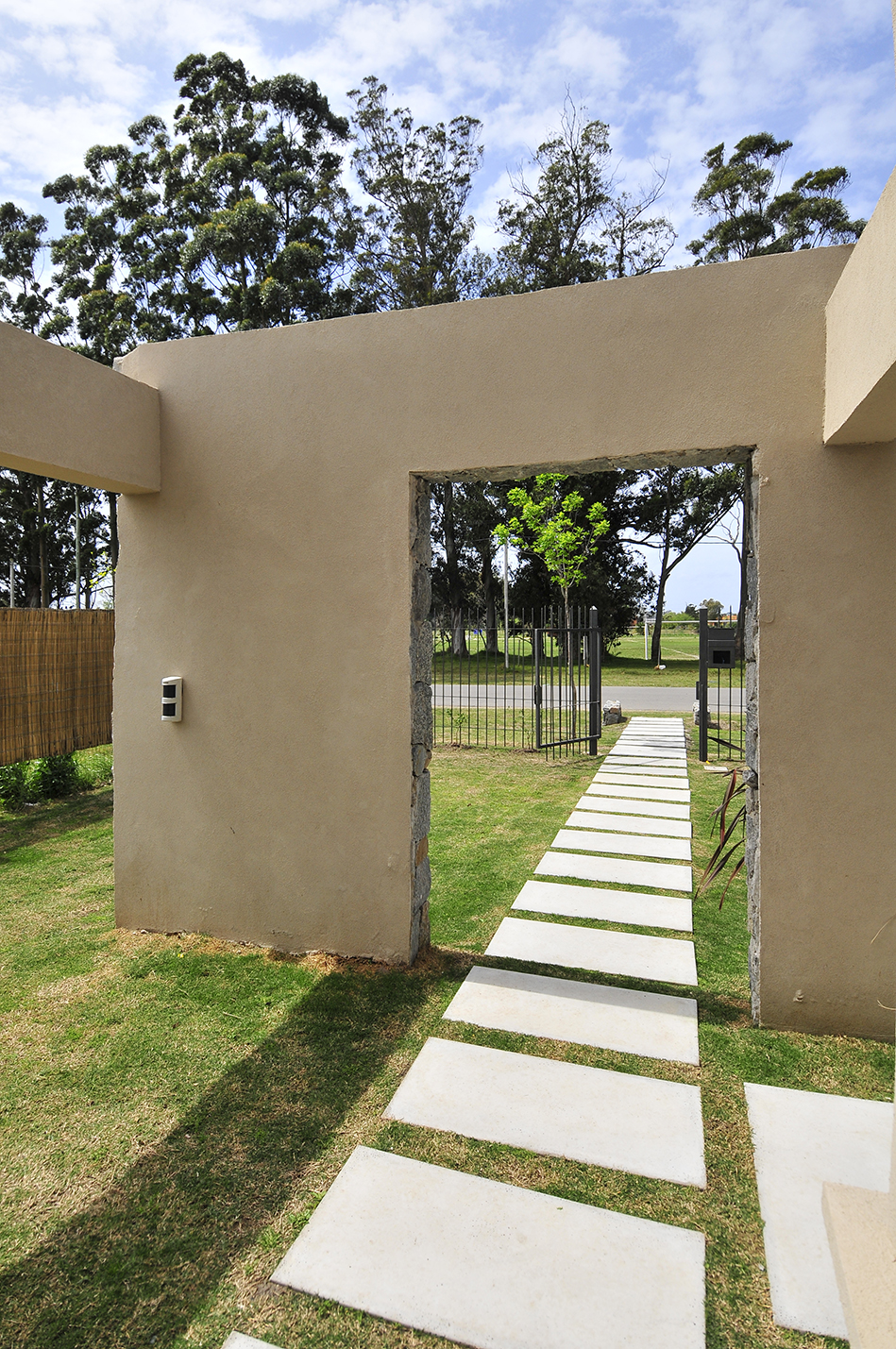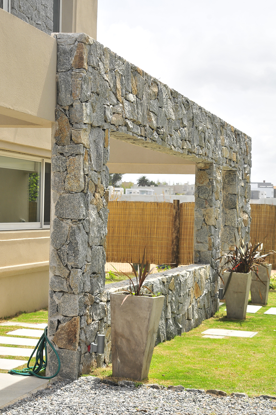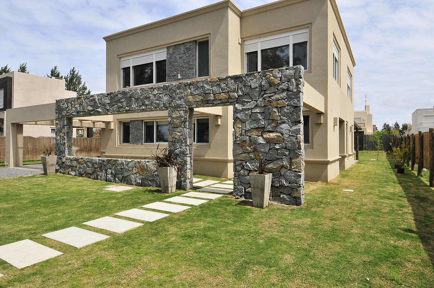 En esta vivienda unifamiliar los arquitectos buscan un lenguaje ecléctico moderno, generando espacios abiertos y ambientes luminosos sin dejar de lado la tradición. De esta manera se insertan detalles rústicos dentro de un estilo de volúmenes modernos con molduras, realizando una mezcla que los caracteriza. Como en varias de sus viviendas proyectadas, el volumen del acceso se realza mediante el uso de materiales rústicos y naturales, como la piedra utilizada para revestir el acceso y el recurso del atrio como patio que precede a la entrada, generando un espacio para el ritual del encuentro previo al ingreso a la privacidad del hogar.