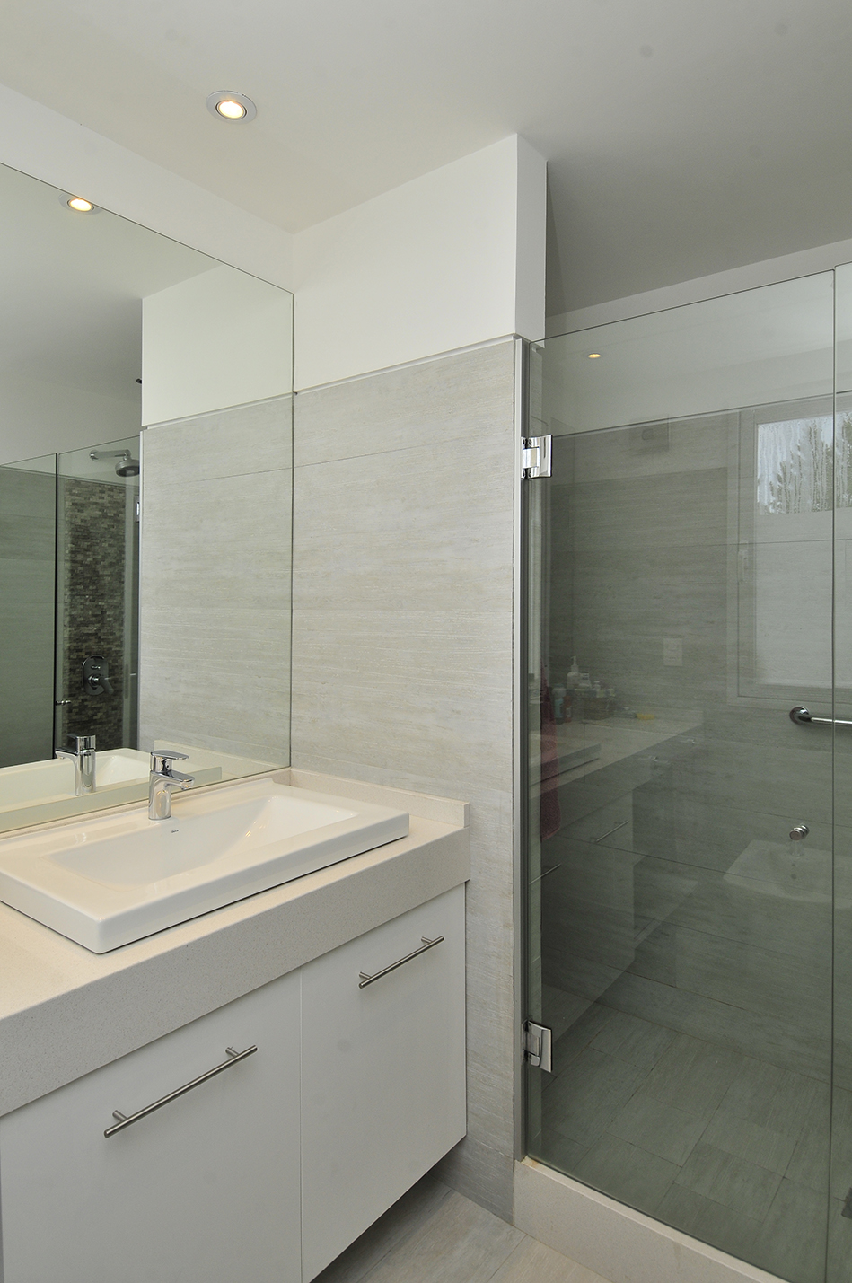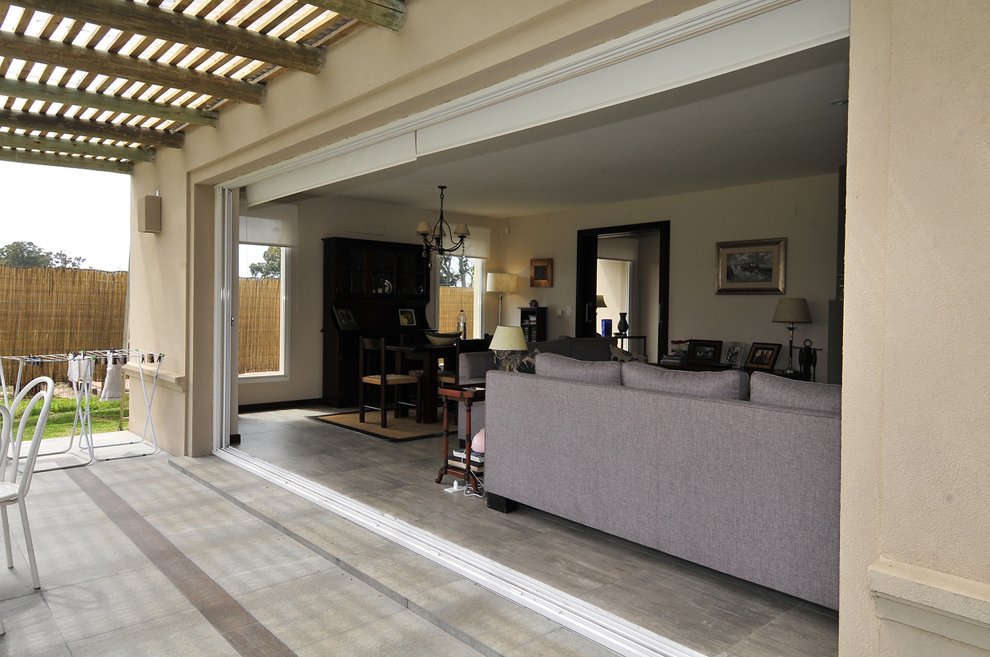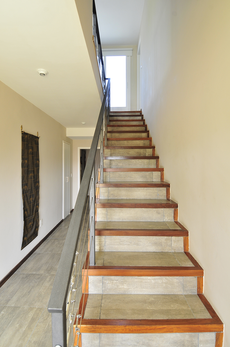 El interior se caracteriza por ser neutro, despojado, con pavimento de microcemento en tonos de beige y paredes de revoque pintado en tonos similares, donde destacan detalles de rusticidad como la estufa en hormigón visto y elementos en madera. Los baños se resuelven en tonos neutros con detalles en piedra, mesada de microcemento y pisos claros. En cuanto a la solución constructiva, se proyecta en construcción tradicional de muros dobles de ladrillo combinado con viguetas y bovedillas para los planos horizontales.