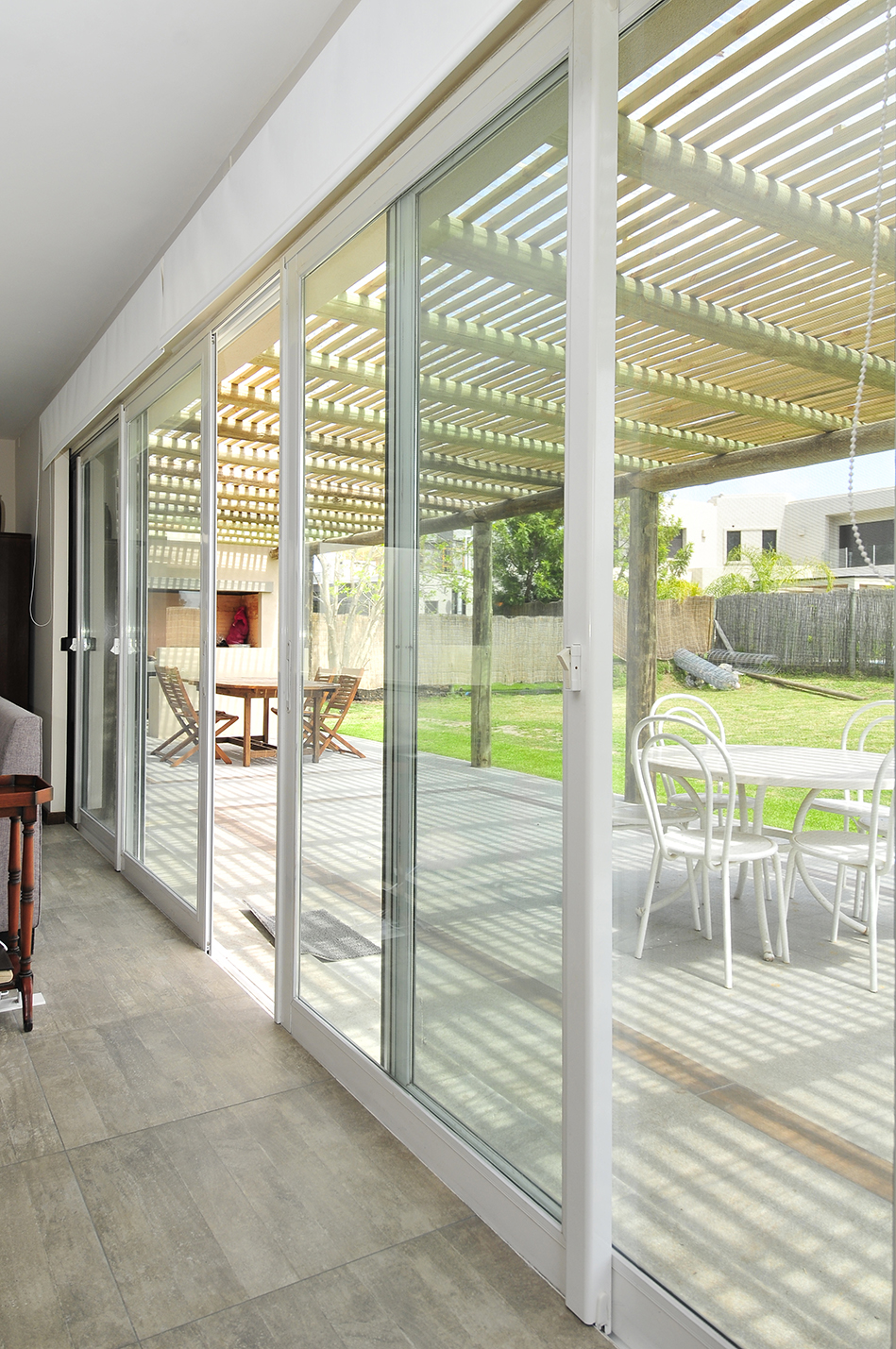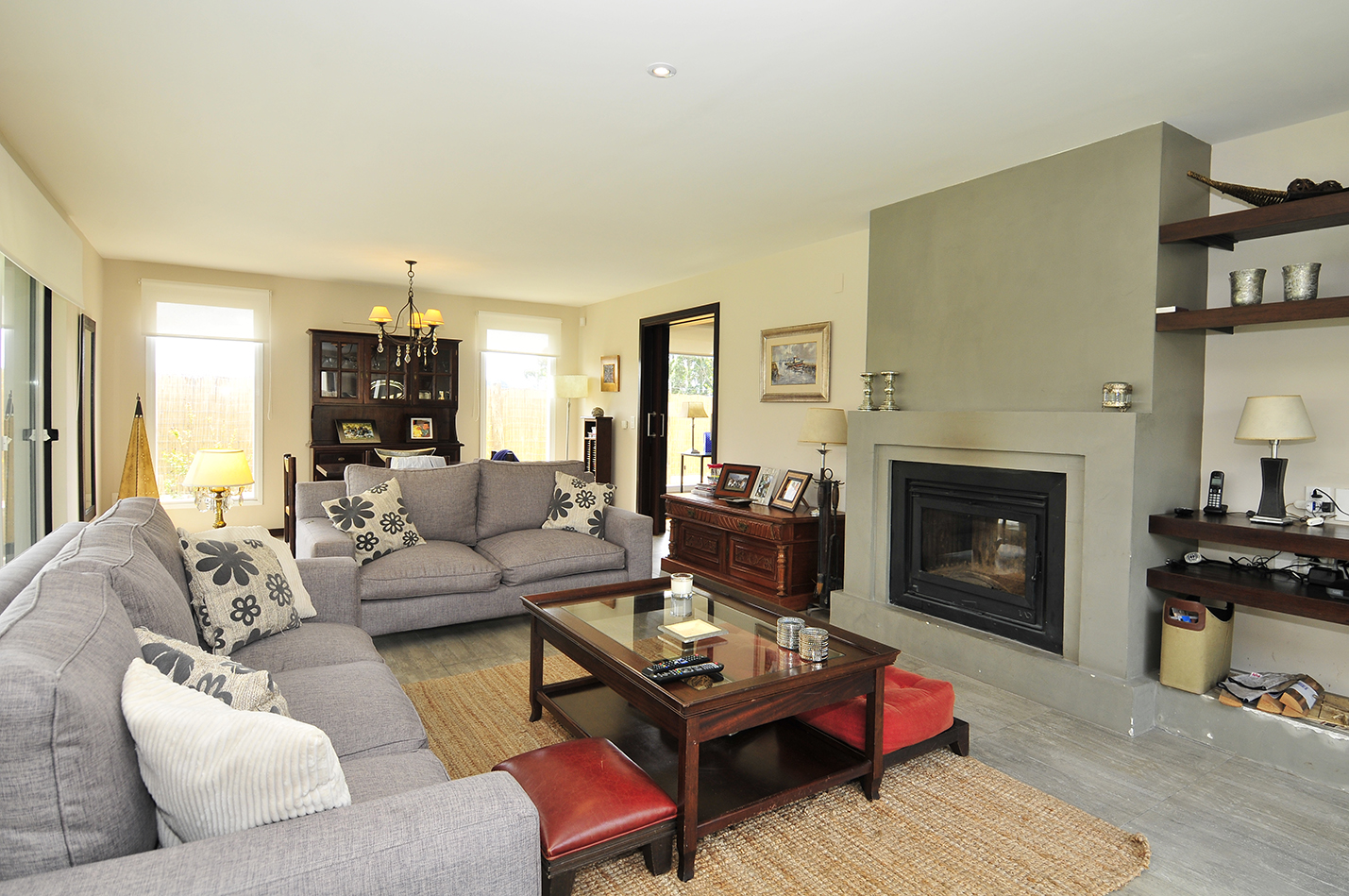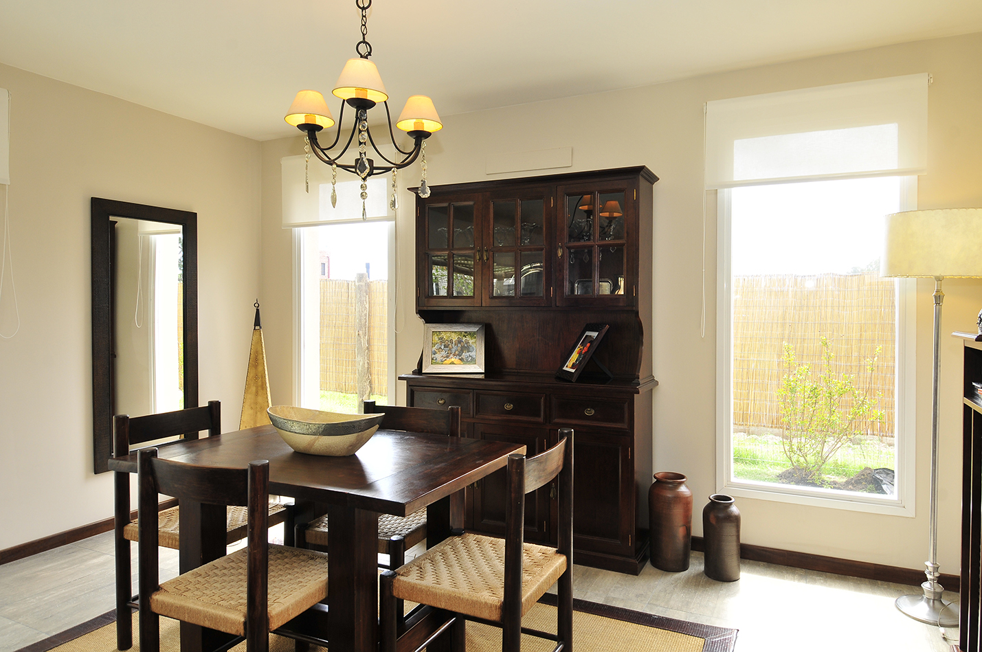 El interior se caracteriza por ser neutro, despojado, con pavimento de microcemento en tonos de beige y paredes de revoque pintado en tonos similares, donde destacan detalles de rusticidad como la estufa en hormigón visto y elementos en madera. Los baños se resuelven en tonos neutros con detalles en piedra, mesada de microcemento y pisos claros. En cuanto a la solución constructiva, se proyecta en construcción tradicional de muros dobles de ladrillo combinado con viguetas y bovedillas para los planos horizontales.