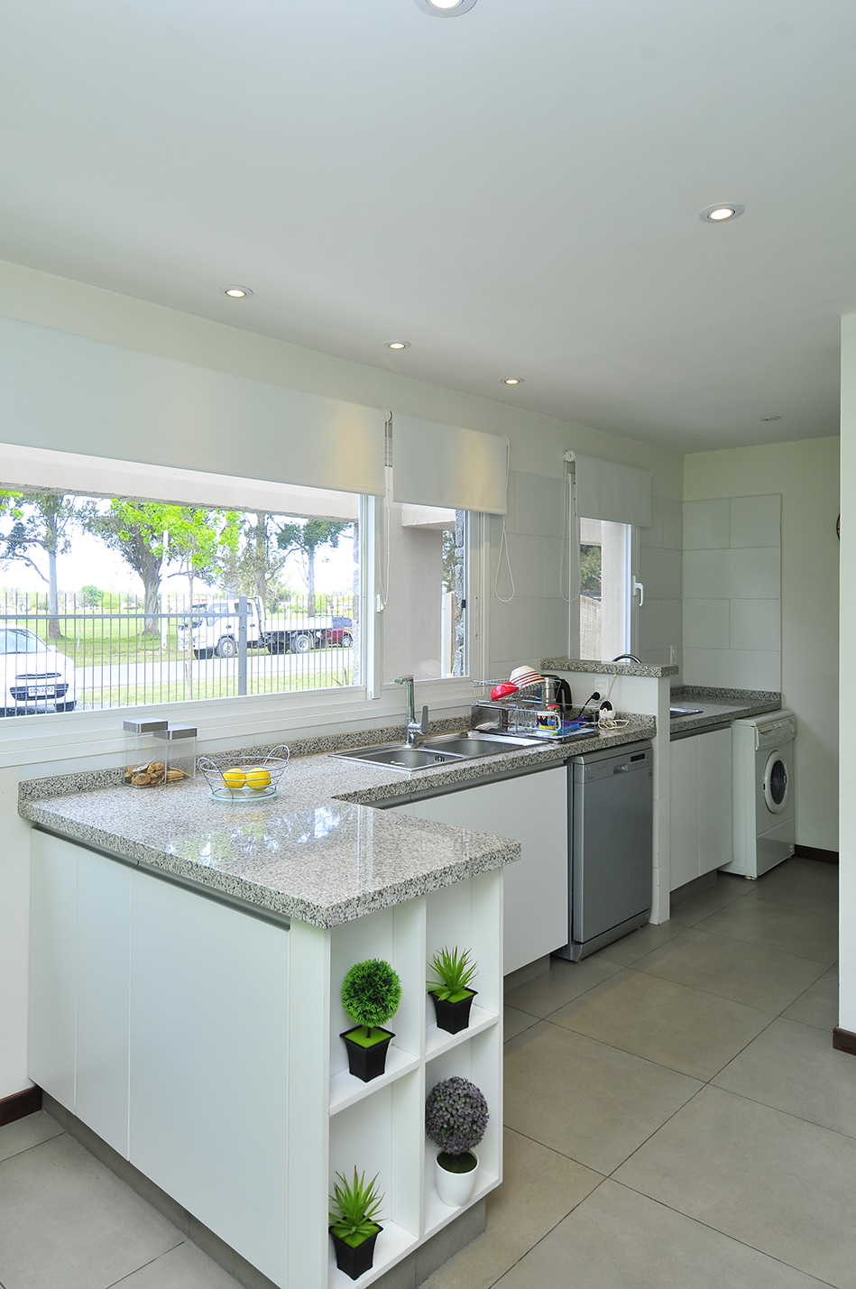 Para esta vivienda se resuelven dos dormitorios en planta alta, uno de ellos en suite y un baño; actualmente están realizando la ampliación agregando una nueva habitación. En planta baja se encuentra un dormitorio de huéspedes con toilette, un dormitorio de servicio, cocina con desayunador y el estar comedor desde donde se accede al parrillero techado, brindando luminosidad mediante con un amplio ventanal que integra el estar al patio, dando privacidad hacia el frente. De esta manera se genera un vínculo con el jardín el cual es bastante amplio con presencia de desniveles, por lo que la vivienda queda elevada.