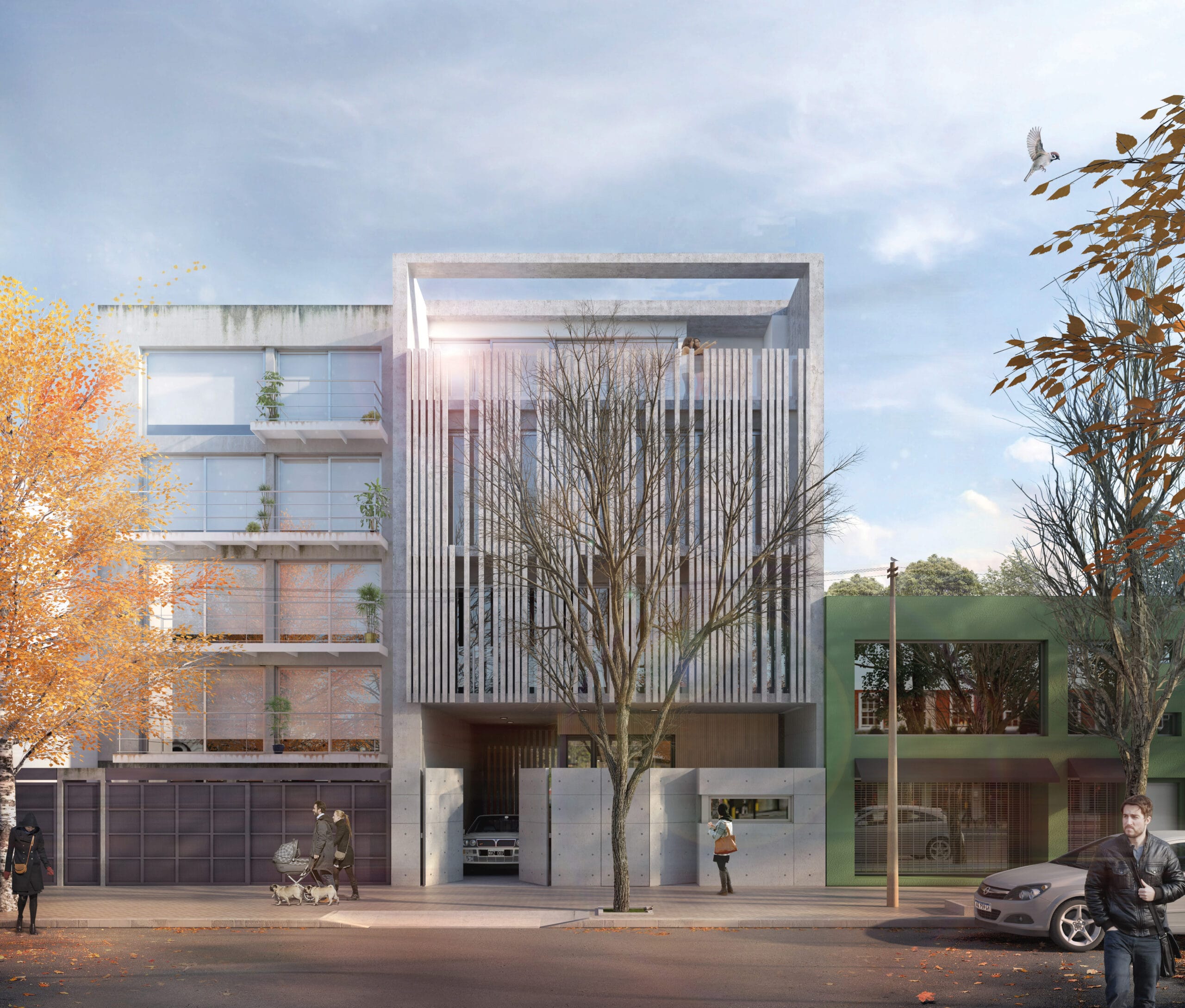 Los apartamentos se organizan buscando la optimización de los espacios, obteniendo el máximo aprovechamiento de las áreas, priorizando la iluminación natural y las vistas. La expresión del edificio de ladrillo, ventanales continuos y la levedad de los balcones, buscan conjugar una imagen compacta y  transparente, contenedora de espacios vitales confortables.
