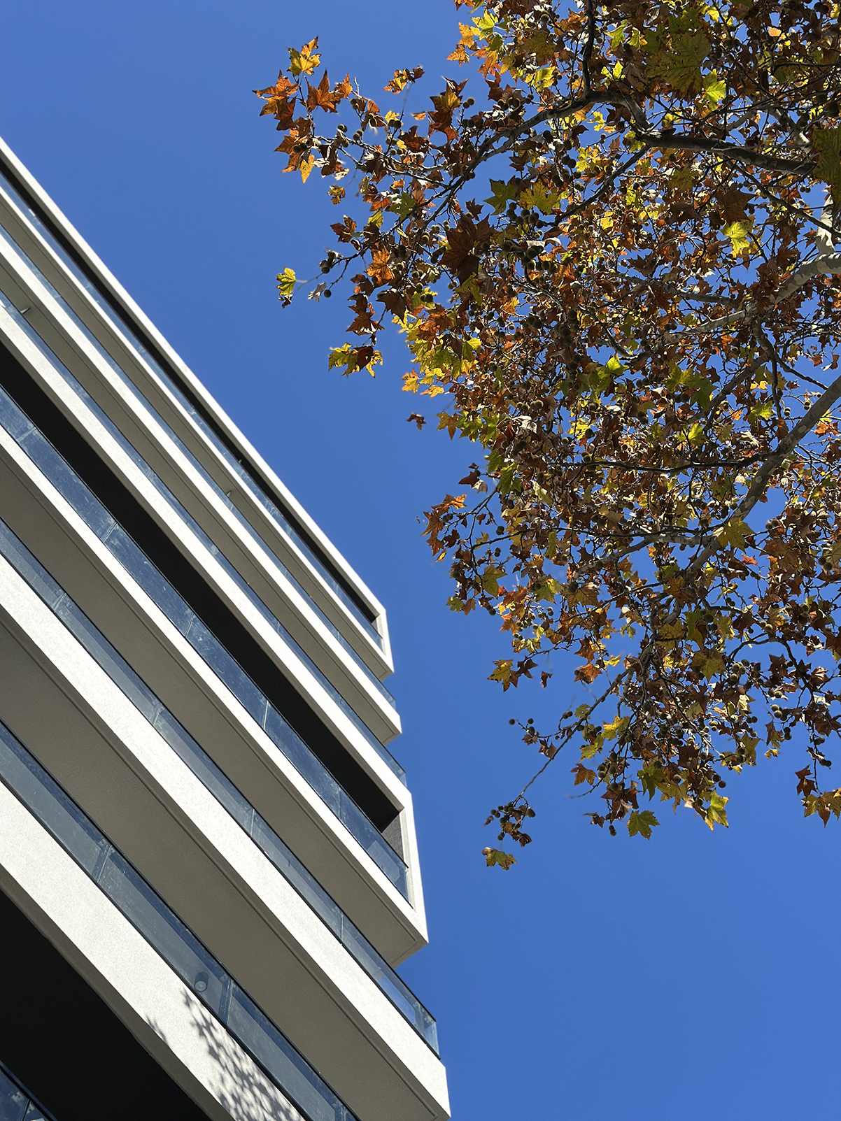 La respuesta vino de los balcones. La vieja casa, con su fachada de balcones salientes, nos dio la clave: trabajar con volúmenes continuos, con cajas y bandejas que se proyectan hacia afuera, como ecos reinterpretados de aquellos gestos centenarios. El edificio, entonces, no copia ni parodia, pero dialoga. Toma todo el frente del terreno y lo articula en un juego de planos que avanza y retrocede, que se anima a salir hacia la calle como la casa lo hizo en su tiempo, cuando el balcón era símbolo de presencia urbana y sociabilidad.