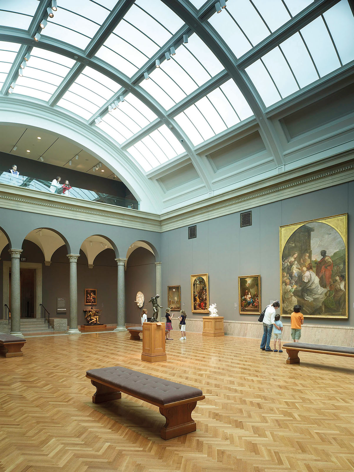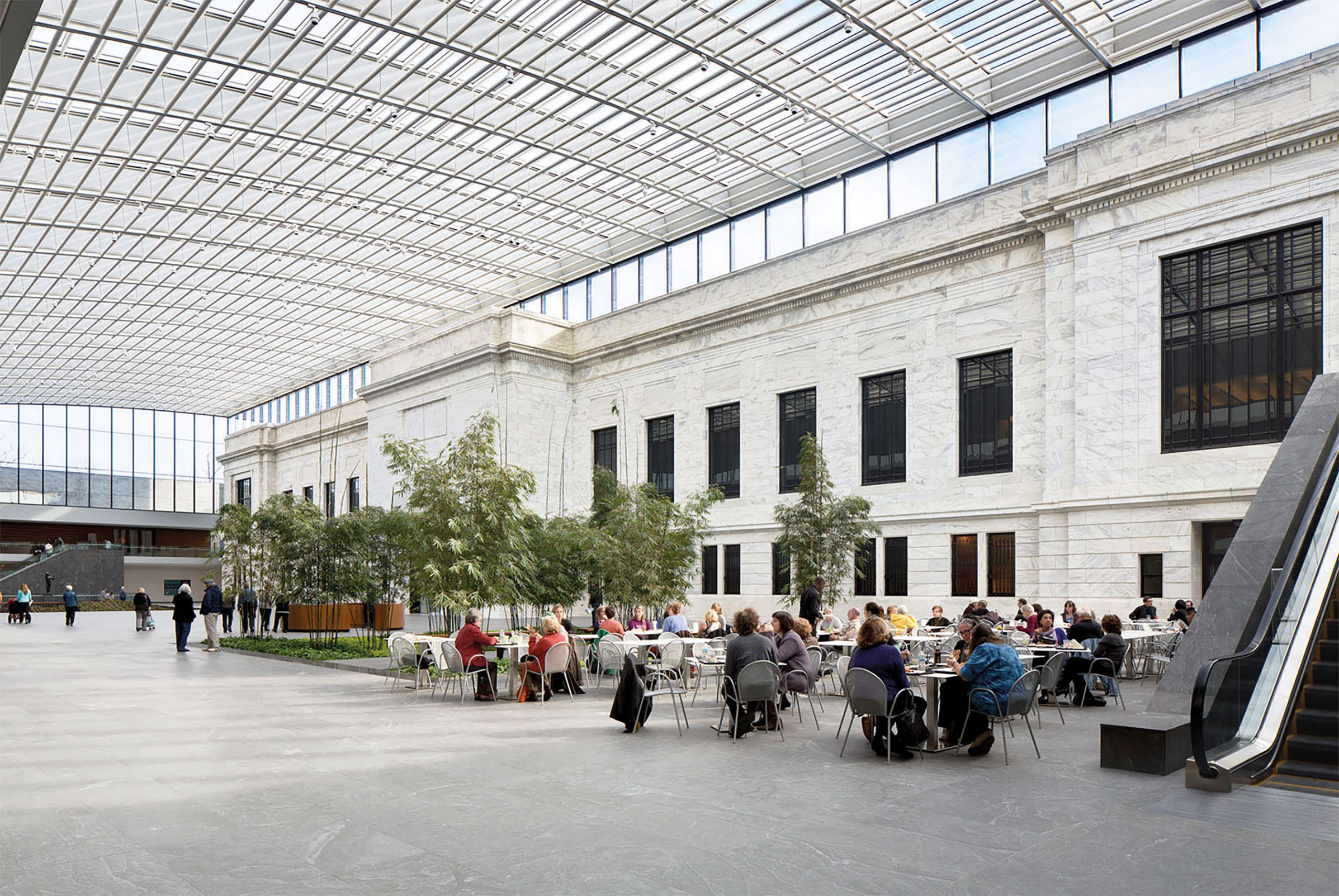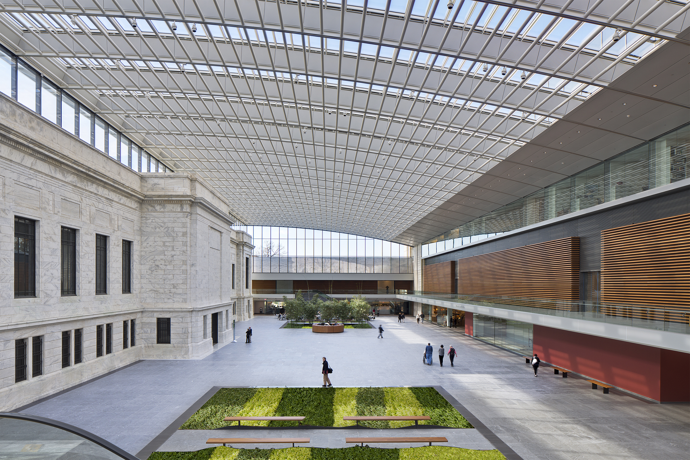 La propuesta de Viñoly afronta ese desorden sin negarlo, pero tampoco aceptándolo como destino. Su proyecto de expansión y renovación restituye protagonismo al edificio de 1916, concibiéndolo como una joya —un núcleo precioso— engarzado en un anillo continuo de nuevos espacios expositivos que incorpora y resignifica la intervención de Breuer. Las adiciones menores fueron demolidas para dar lugar a una operación más ambiciosa y, al mismo tiempo, más clara: reorganizar el museo alrededor de una gran plaza central cubierta, luminosa, generosa. Esta nueva piazza interior, bañada por la luz natural que atraviesa una cubierta suavemente curva de vidrio y acero, se convierte en el verdadero corazón del museo. Libre de columnas, abierta, hospitalaria, no es solo un espacio de paso, sino un lugar de encuentro. El paisajismo interior y la presencia constante del día invitan al visitante a internarse en el centro del edificio, a orientarse sin esfuerzo. Cafés, restaurante y tienda acompañan esta experiencia, reforzando la idea del museo como espacio cívico, no como recinto hermético. A ambos lados, nuevas alas de galerías —al este y al oeste— enmarcan la piazza y se afinan progresivamente hacia el edificio histórico. Allí culminan en salas completamente vidriadas y pasarelas peatonales que permiten ver, sin obstáculos, los laterales del pabellón de 1916. No hay aquí un gesto de subordinación ni de competencia: lo nuevo se aproxima con respeto, consciente de su papel mediador.
