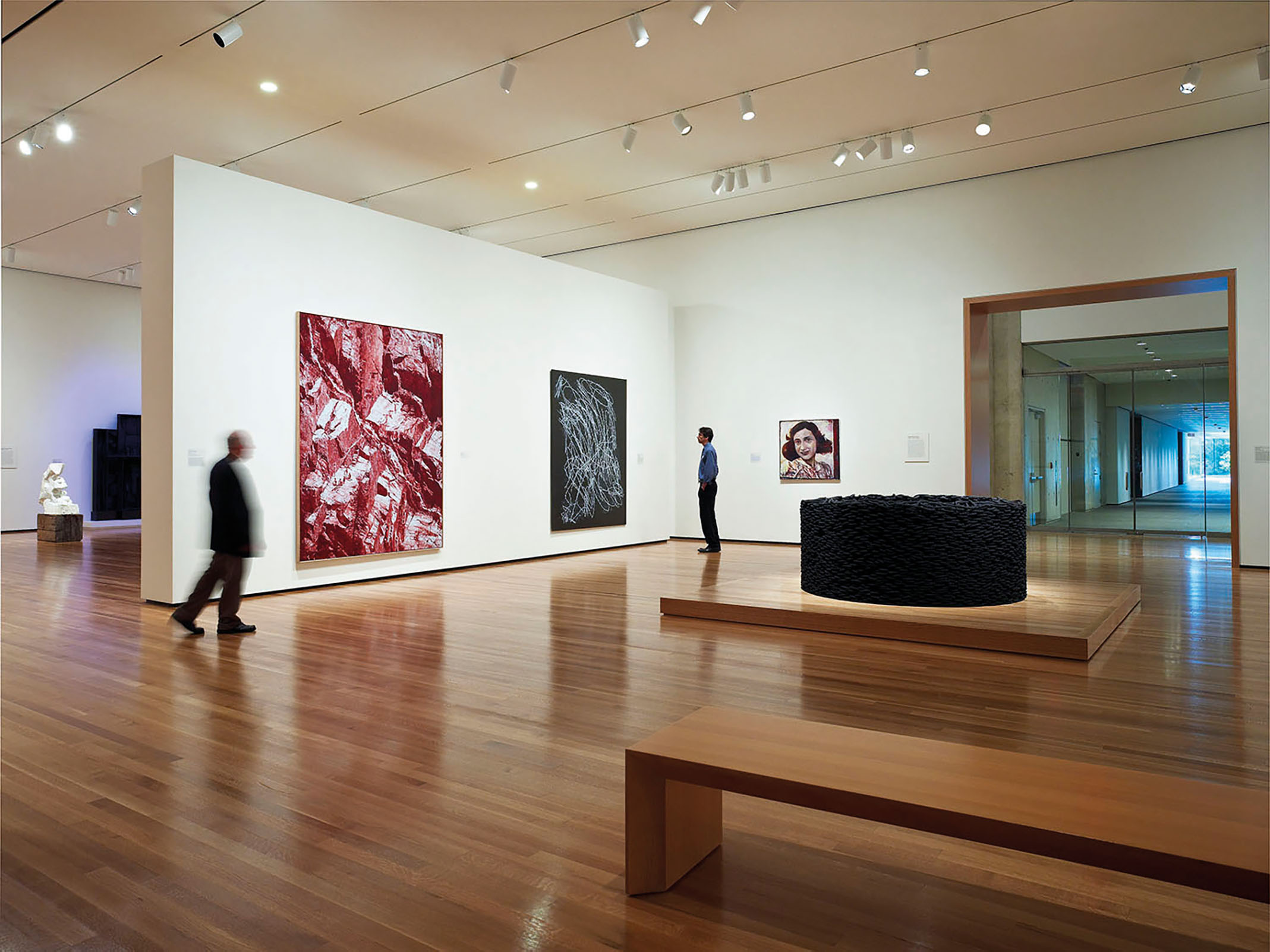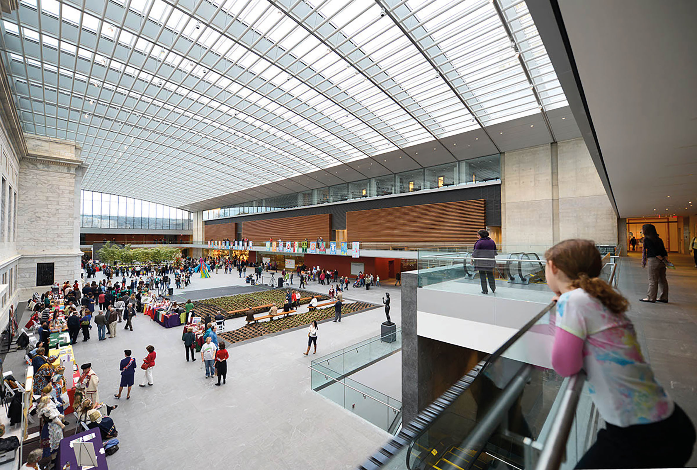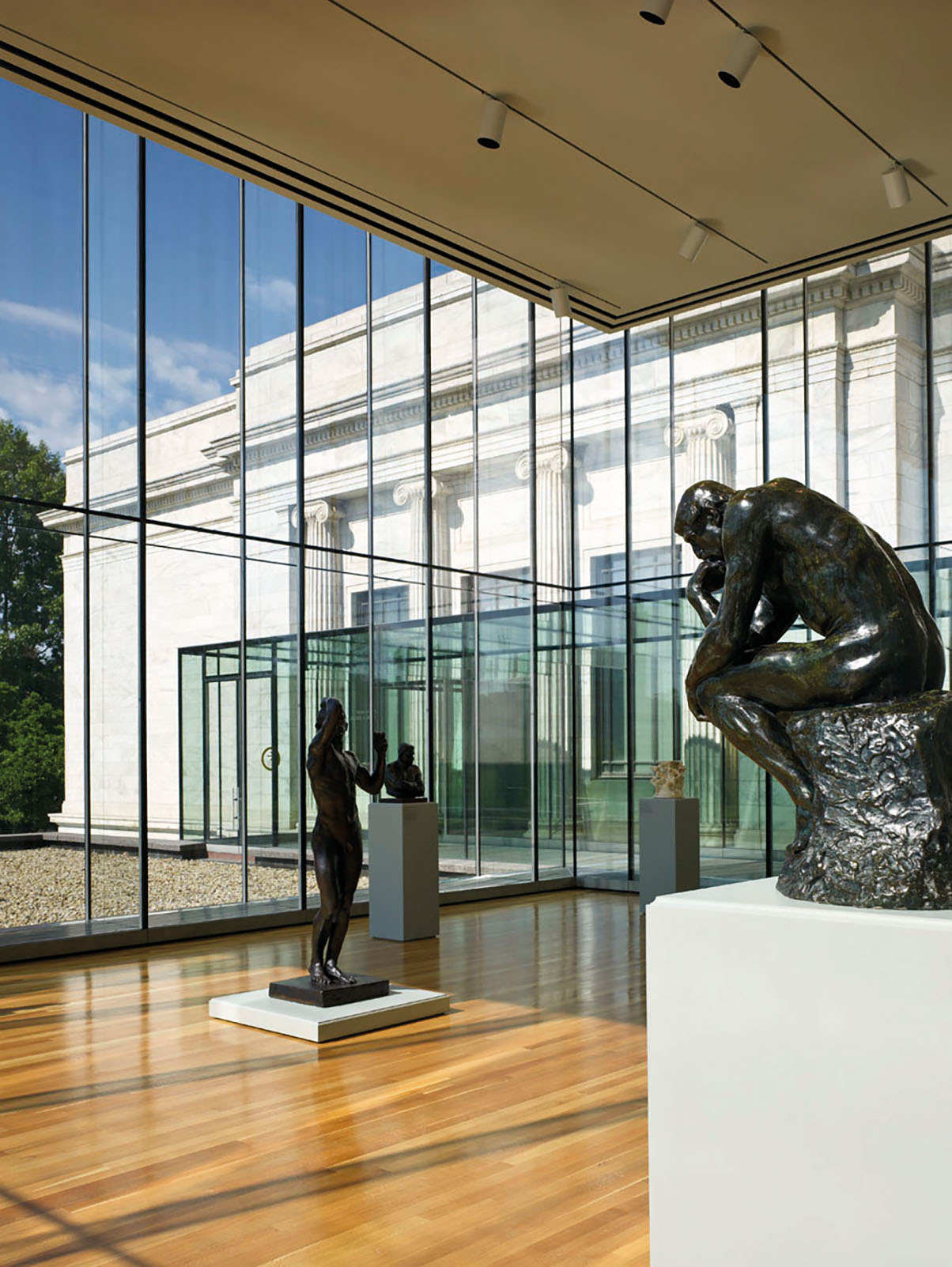 La propuesta de Viñoly afronta ese desorden sin negarlo, pero tampoco aceptándolo como destino. Su proyecto de expansión y renovación restituye protagonismo al edificio de 1916, concibiéndolo como una joya —un núcleo precioso— engarzado en un anillo continuo de nuevos espacios expositivos que incorpora y resignifica la intervención de Breuer. Las adiciones menores fueron demolidas para dar lugar a una operación más ambiciosa y, al mismo tiempo, más clara: reorganizar el museo alrededor de una gran plaza central cubierta, luminosa, generosa. Esta nueva piazza interior, bañada por la luz natural que atraviesa una cubierta suavemente curva de vidrio y acero, se convierte en el verdadero corazón del museo. Libre de columnas, abierta, hospitalaria, no es solo un espacio de paso, sino un lugar de encuentro. El paisajismo interior y la presencia constante del día invitan al visitante a internarse en el centro del edificio, a orientarse sin esfuerzo. Cafés, restaurante y tienda acompañan esta experiencia, reforzando la idea del museo como espacio cívico, no como recinto hermético. A ambos lados, nuevas alas de galerías —al este y al oeste— enmarcan la piazza y se afinan progresivamente hacia el edificio histórico. Allí culminan en salas completamente vidriadas y pasarelas peatonales que permiten ver, sin obstáculos, los laterales del pabellón de 1916. No hay aquí un gesto de subordinación ni de competencia: lo nuevo se aproxima con respeto, consciente de su papel mediador.