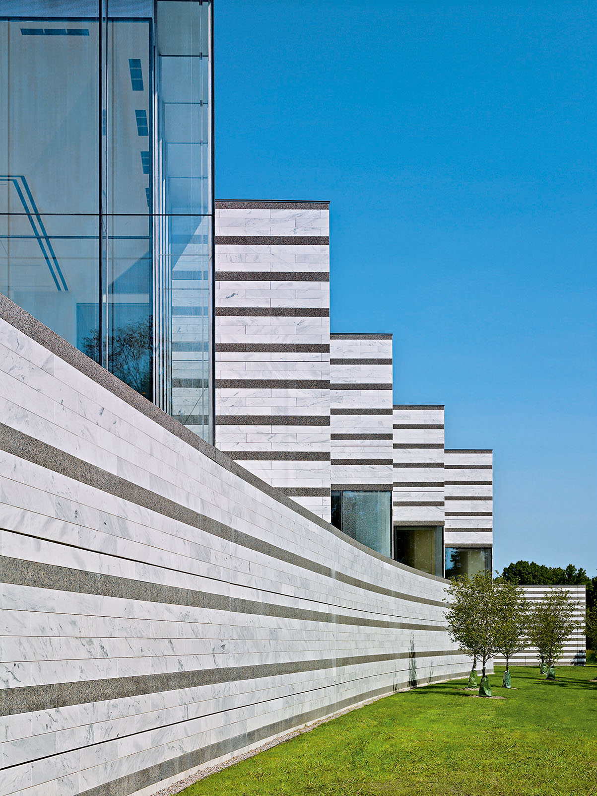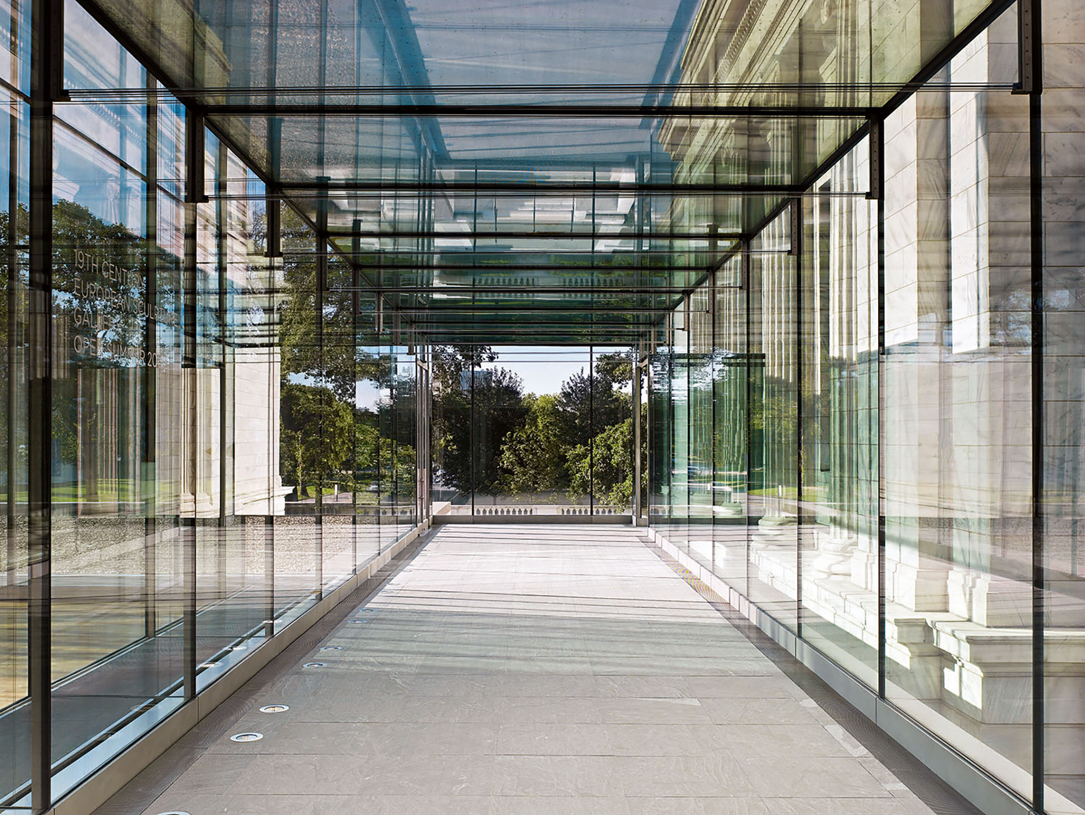 El tratamiento exterior de estas alas refuerza esa intención. La alternancia de bandas de granito y mármol en el revestimiento de piedra establece un diálogo sutil entre dos lenguajes aparentemente irreconciliables: el clasicismo del edificio original y la modernidad severa de la intervención de Breuer. Las diferencias no se borran; se reconocen y se articulan. Lo histórico y lo moderno conservan su identidad, pero pasan a formar parte de una composición única, coherente, legible.