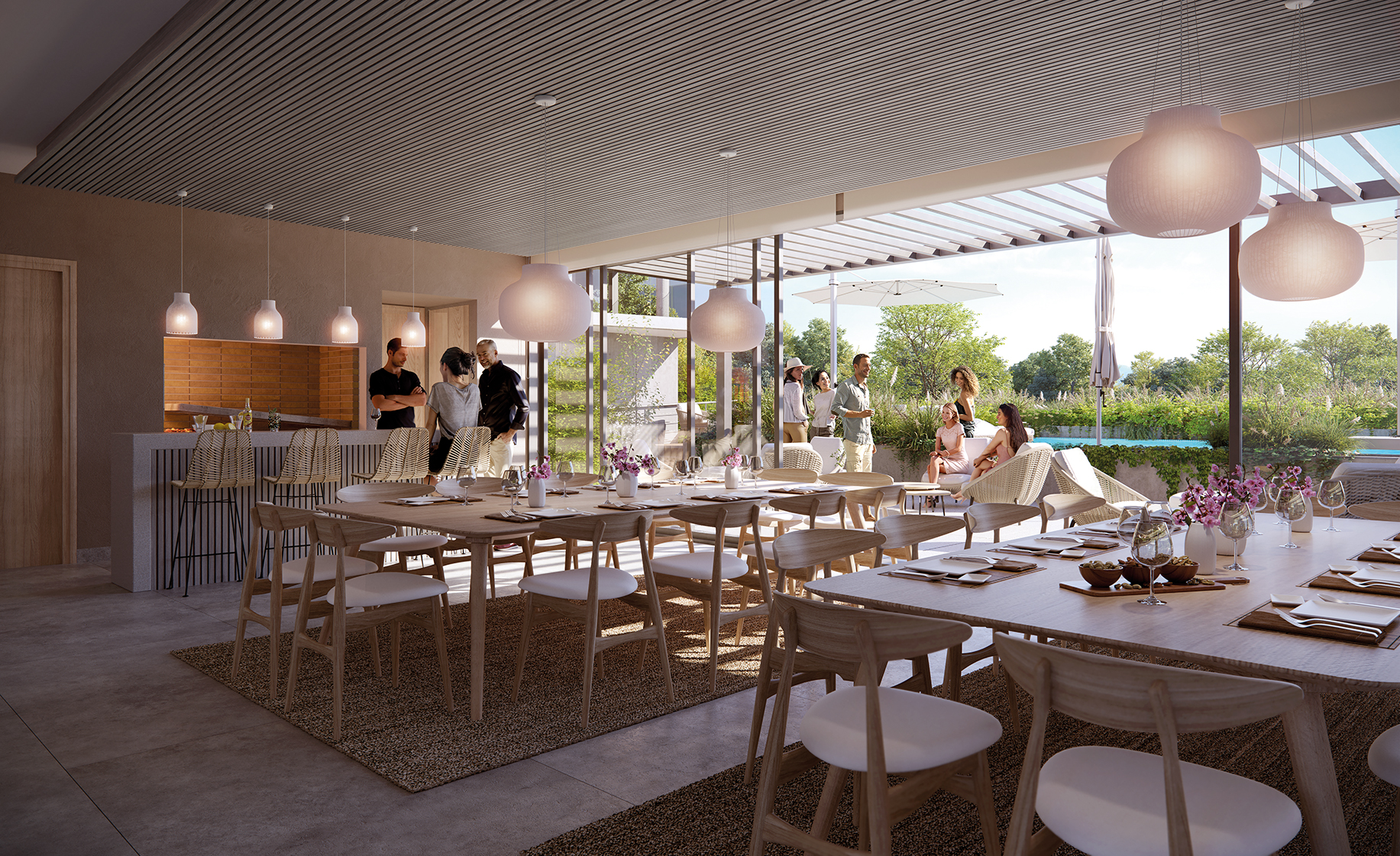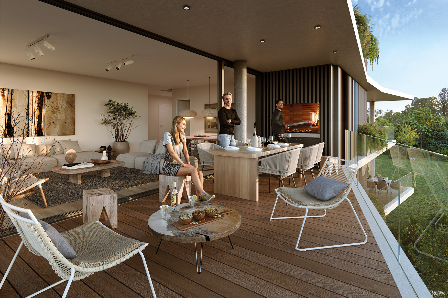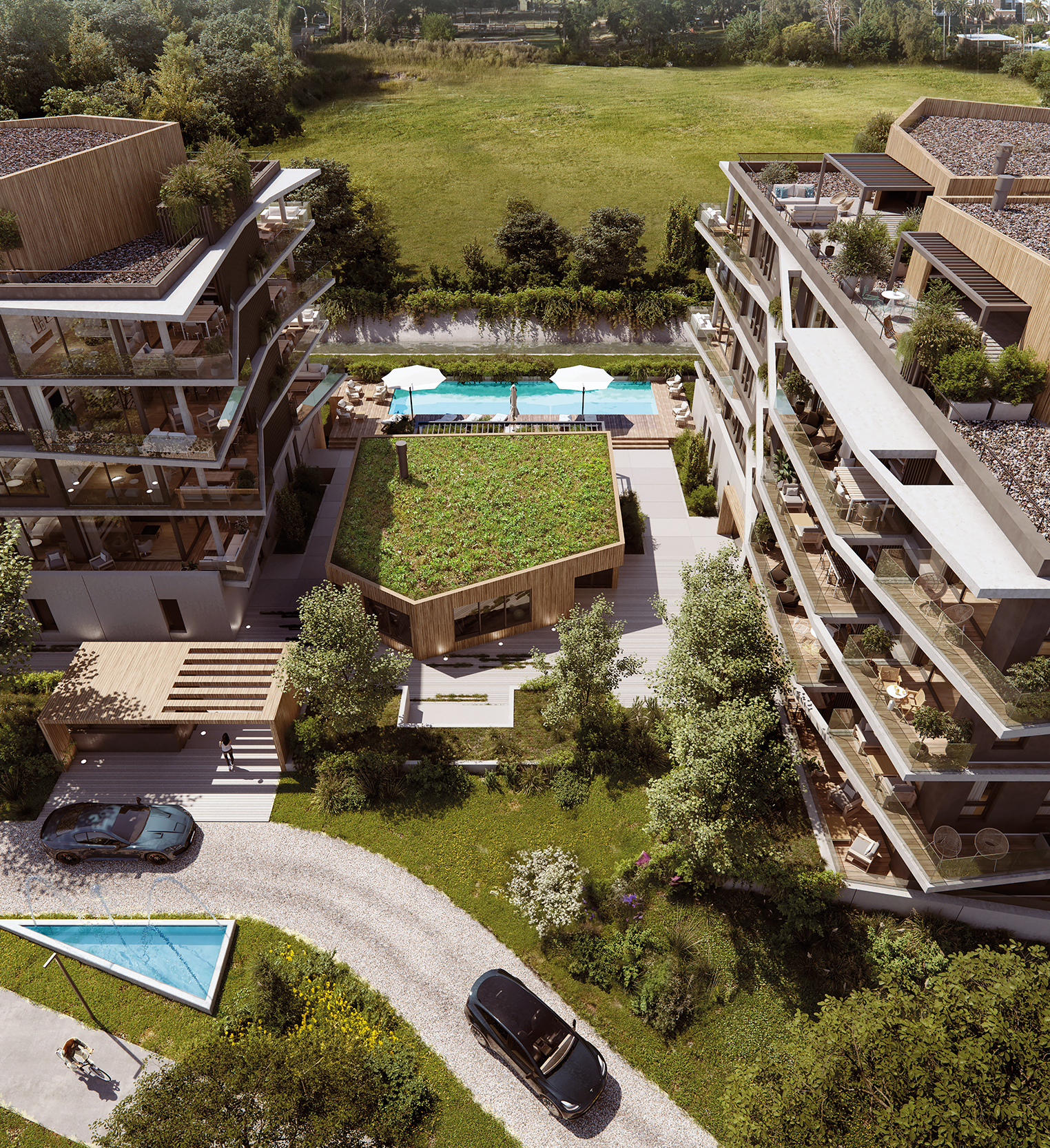 Cada unidad cuenta con amplios ventanales y terrazas generosas que recorren todo el perímetro, permitiendo una conexión continua entre interior y exterior. Los apartamentos —de 2 y 3 dormitorios— se proyectan como espacios amplios, luminosos y funcionales, con parrilleros propios y terminaciones de lujo, combinando la privacidad de un hogar con la apertura hacia el entorno verde.