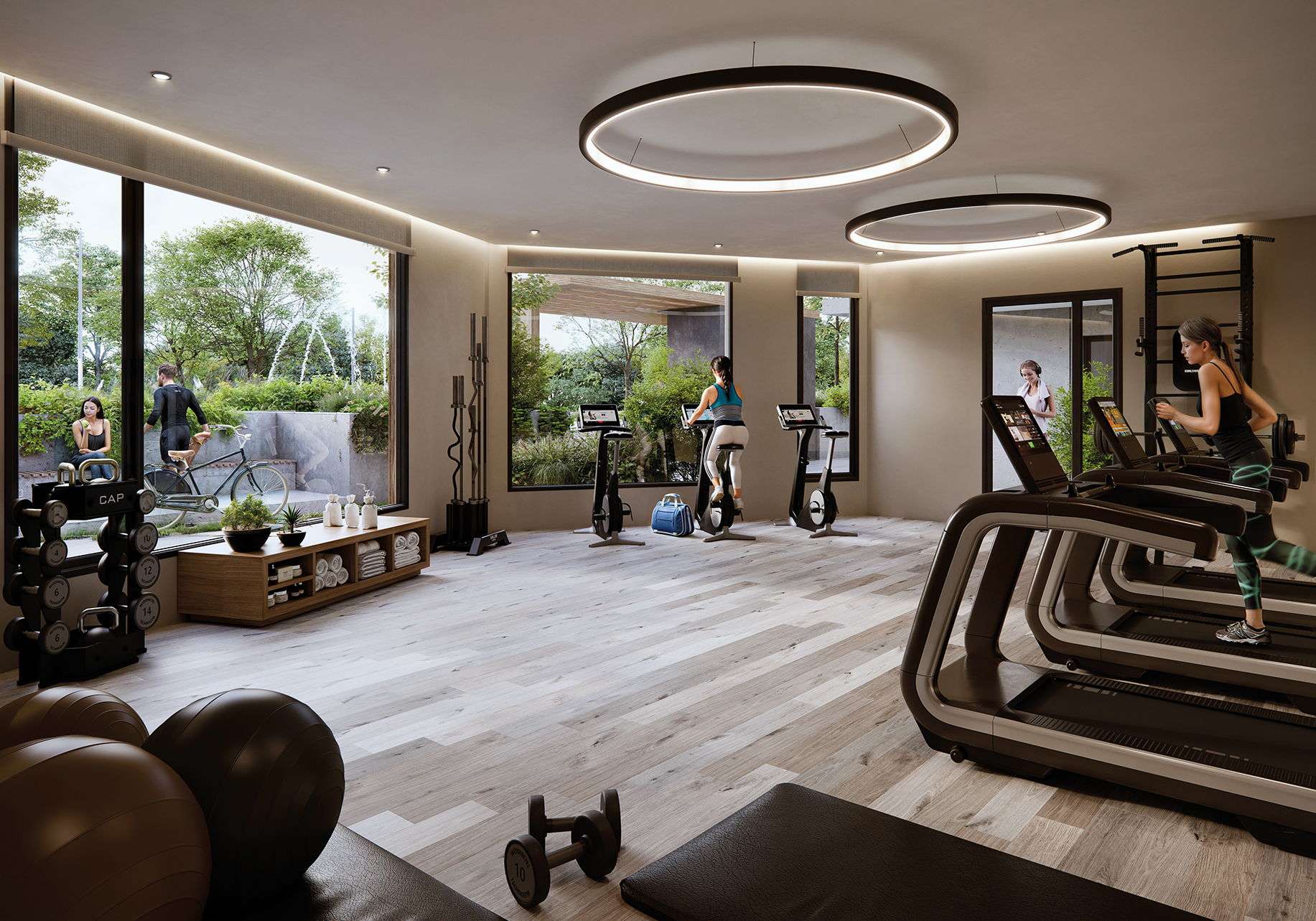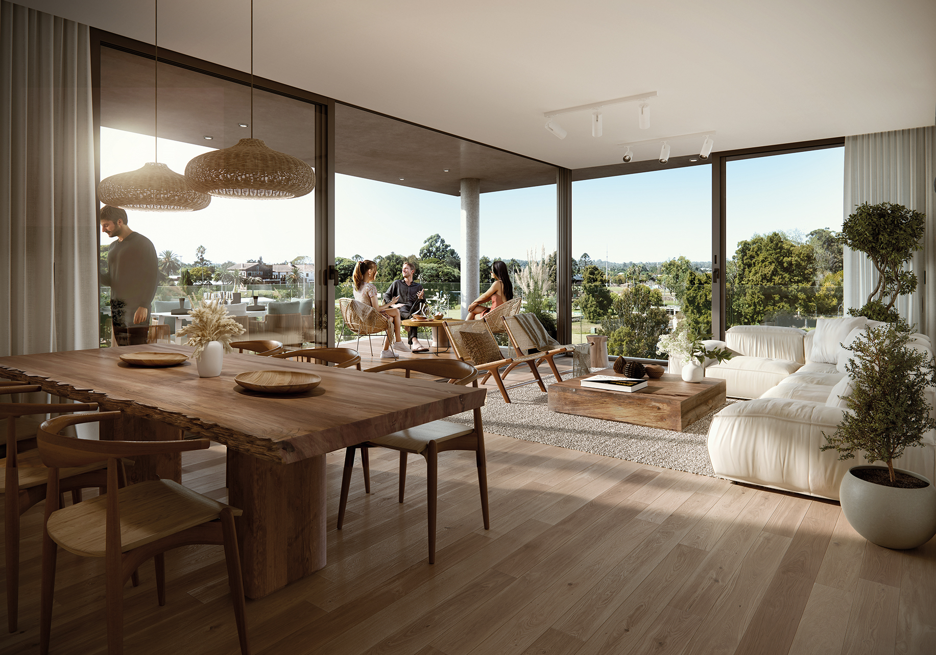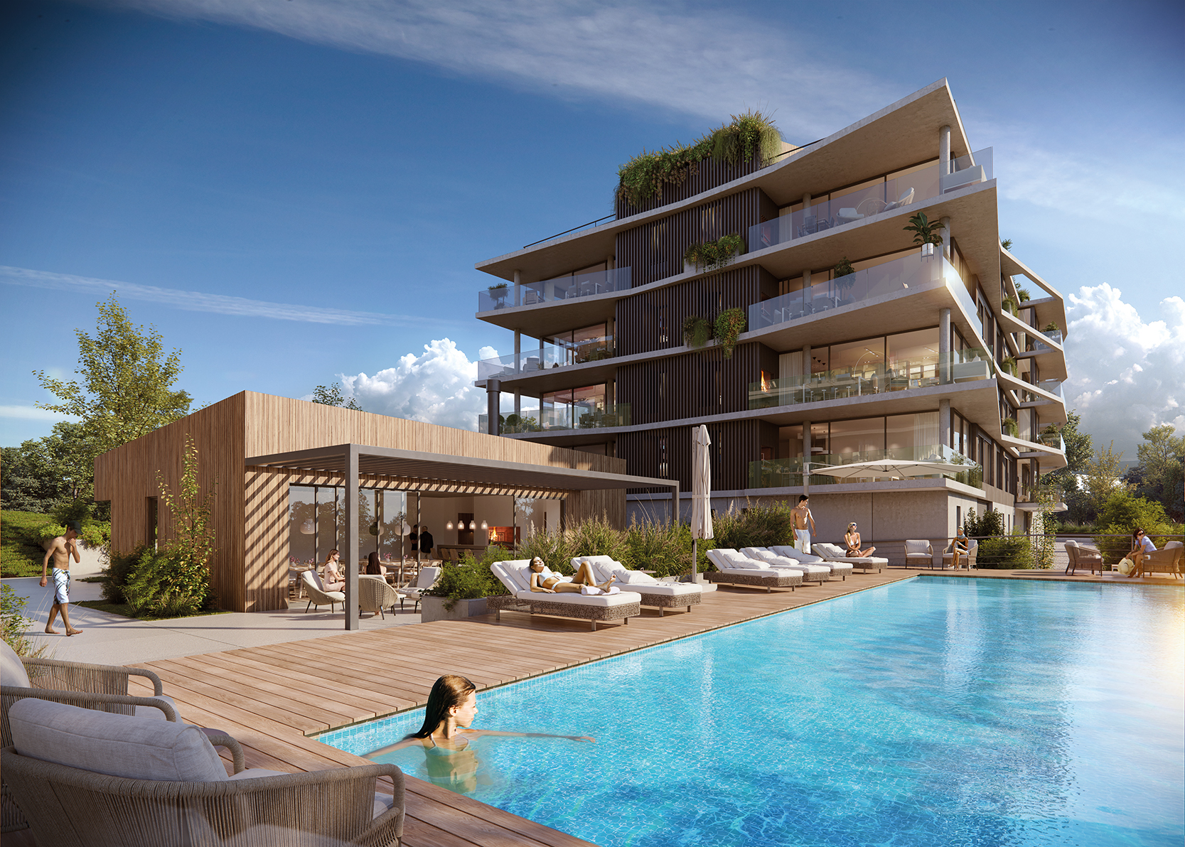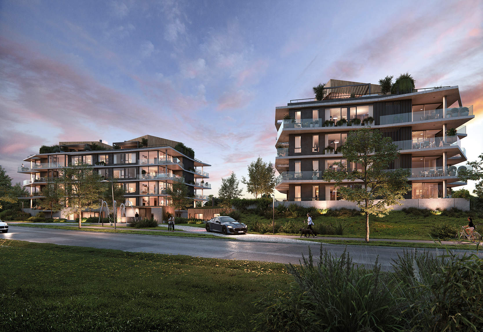 Cada unidad cuenta con amplios ventanales y terrazas generosas que recorren todo el perímetro, permitiendo una conexión continua entre interior y exterior. Los apartamentos —de 2 y 3 dormitorios— se proyectan como espacios amplios, luminosos y funcionales, con parrilleros propios y terminaciones de lujo, combinando la privacidad de un hogar con la apertura hacia el entorno verde.