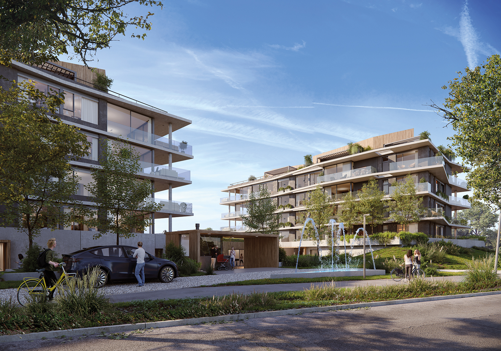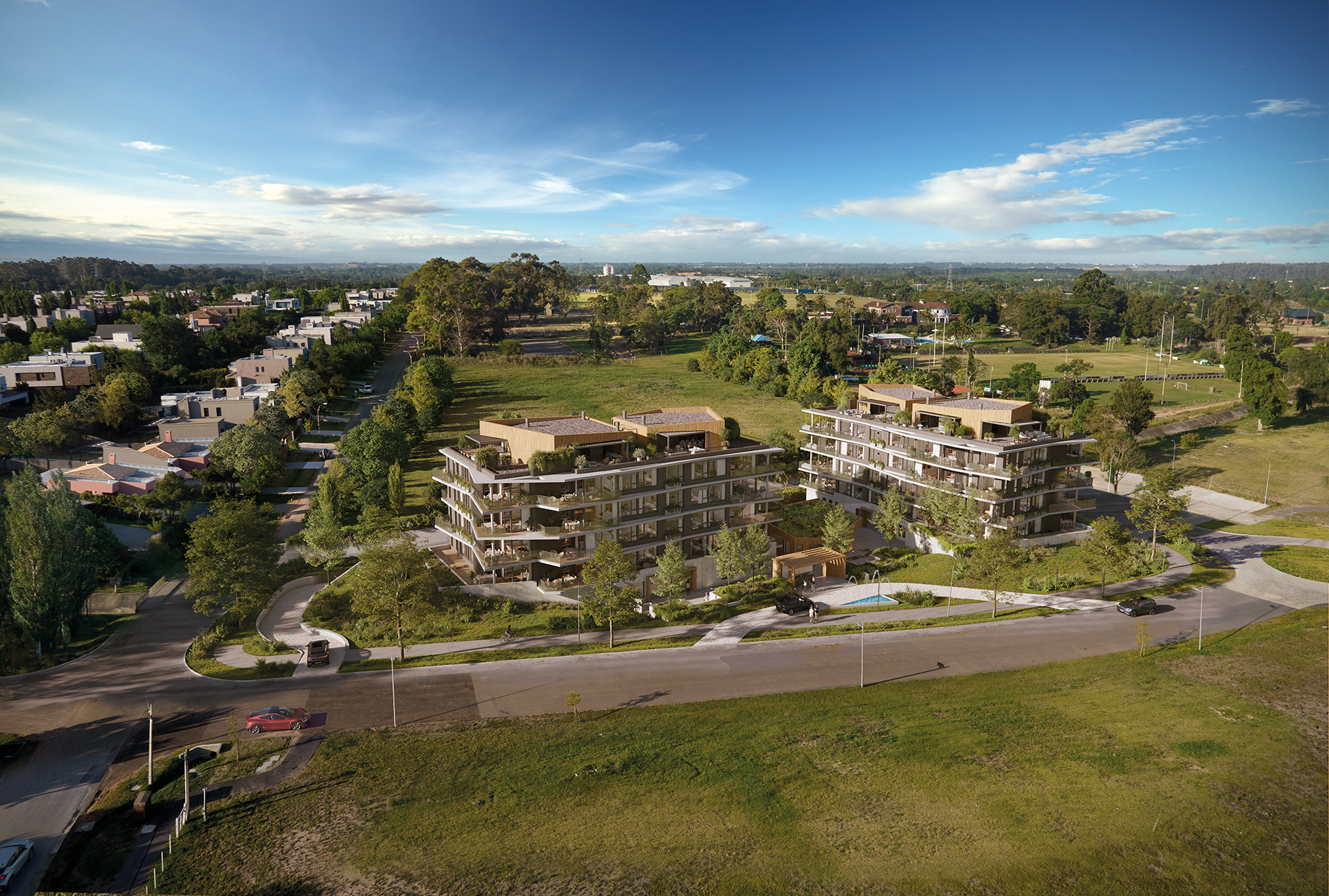 Ubicado en Barrio Parques, Montevideo, Sky Polo nace de una idea clara: integrar arquitectura contemporánea y naturaleza en un proyecto único, dinámico y de escala humana. El diseño parte de dos cuerpos arquitectónicos de dimensiones similares, implantados de manera estratégica para generar un eje central de circulación que aprovecha y potencia el gran parque natural del terreno.