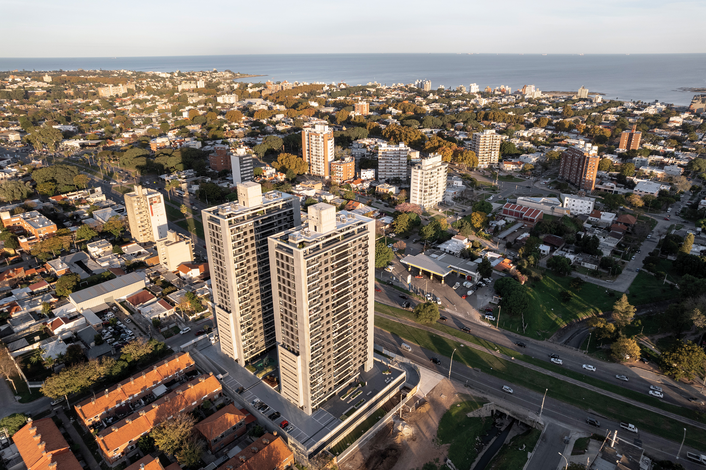 Al llegar desde el centro, la ciudad parece desplegarse como una página recién escrita: Avenida Italia corre recta y decidida hacia el Este, mientras la rambla Concepción del Uruguay, aún en proceso de consolidación, perfila una nueva costura entre el tejido urbano y el paisaje natural. En ese intersticio que Montevideo apenas empieza a narrar, emerge un proyecto con vocación de hito: dos torres que no solo se elevan, sino que articulan.