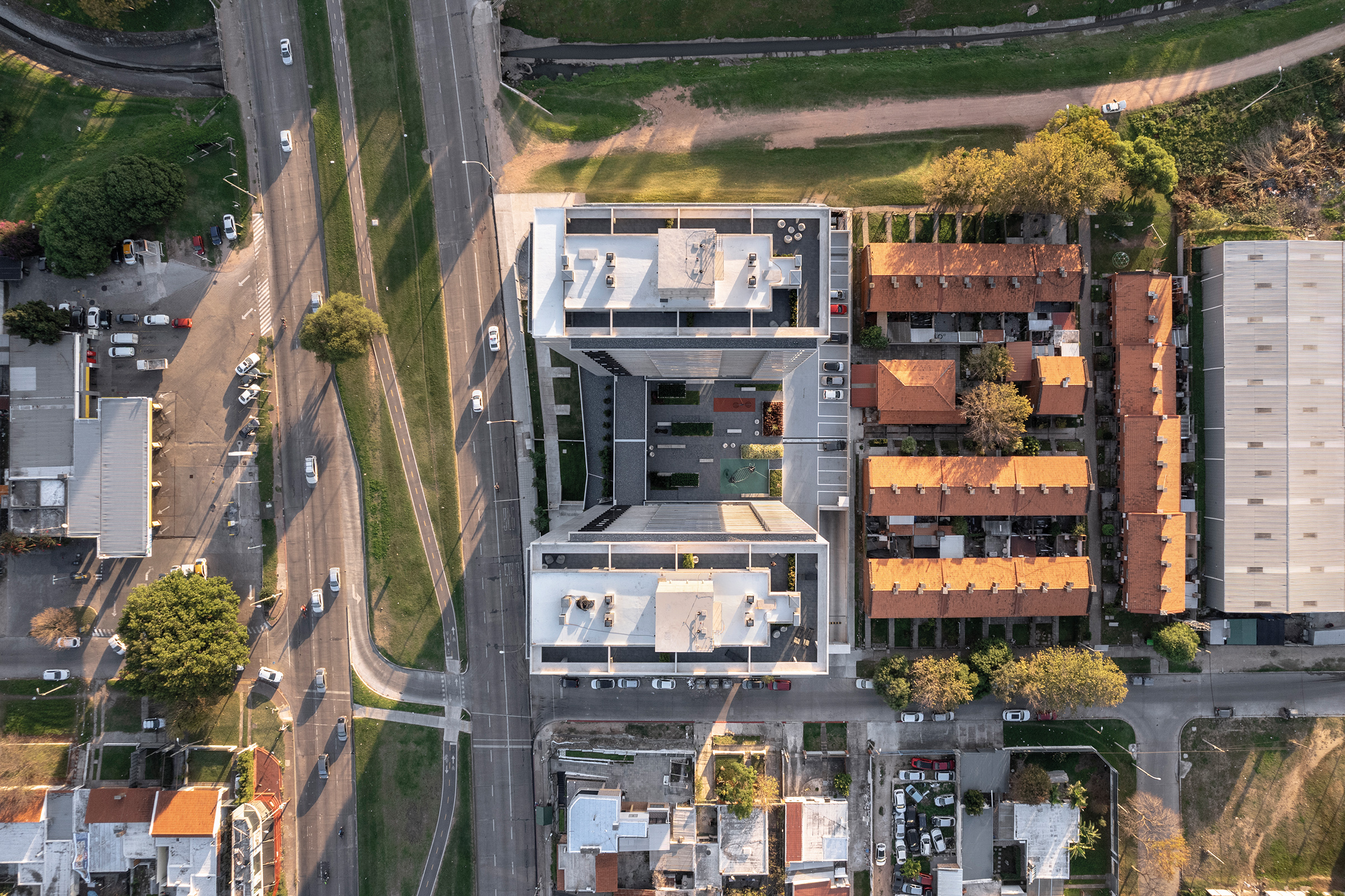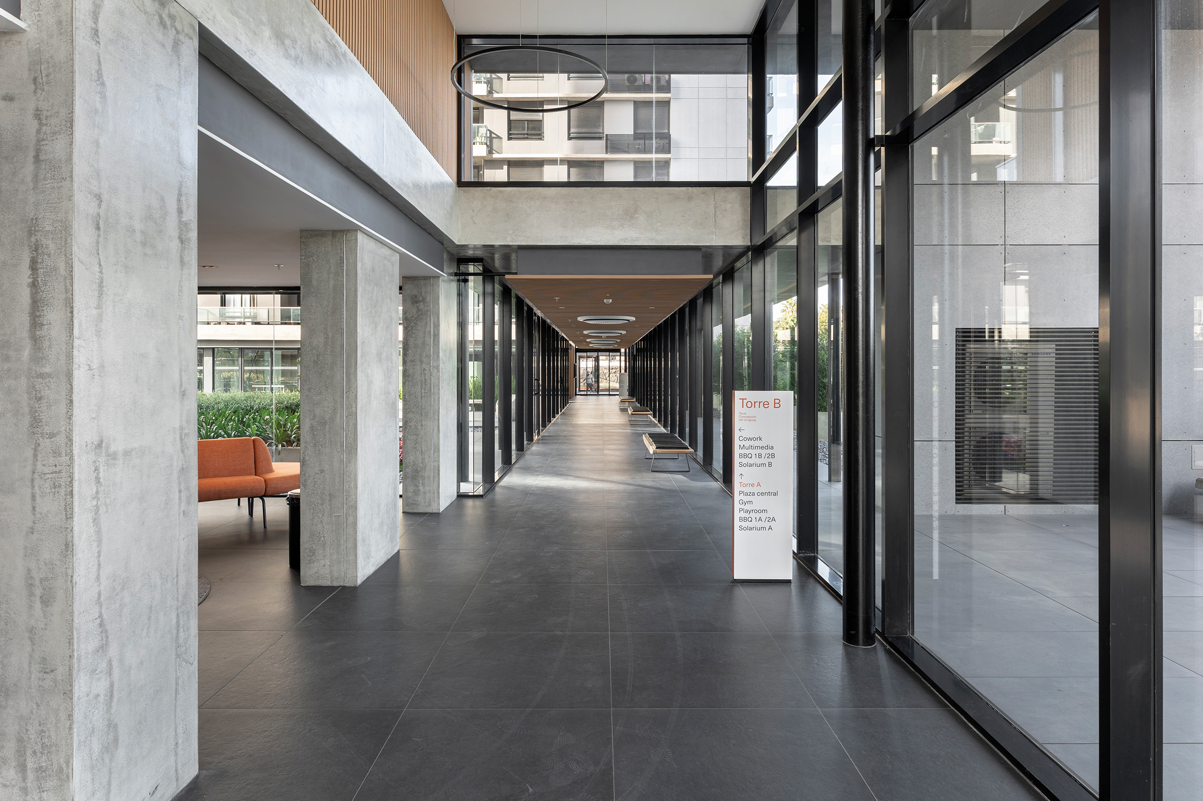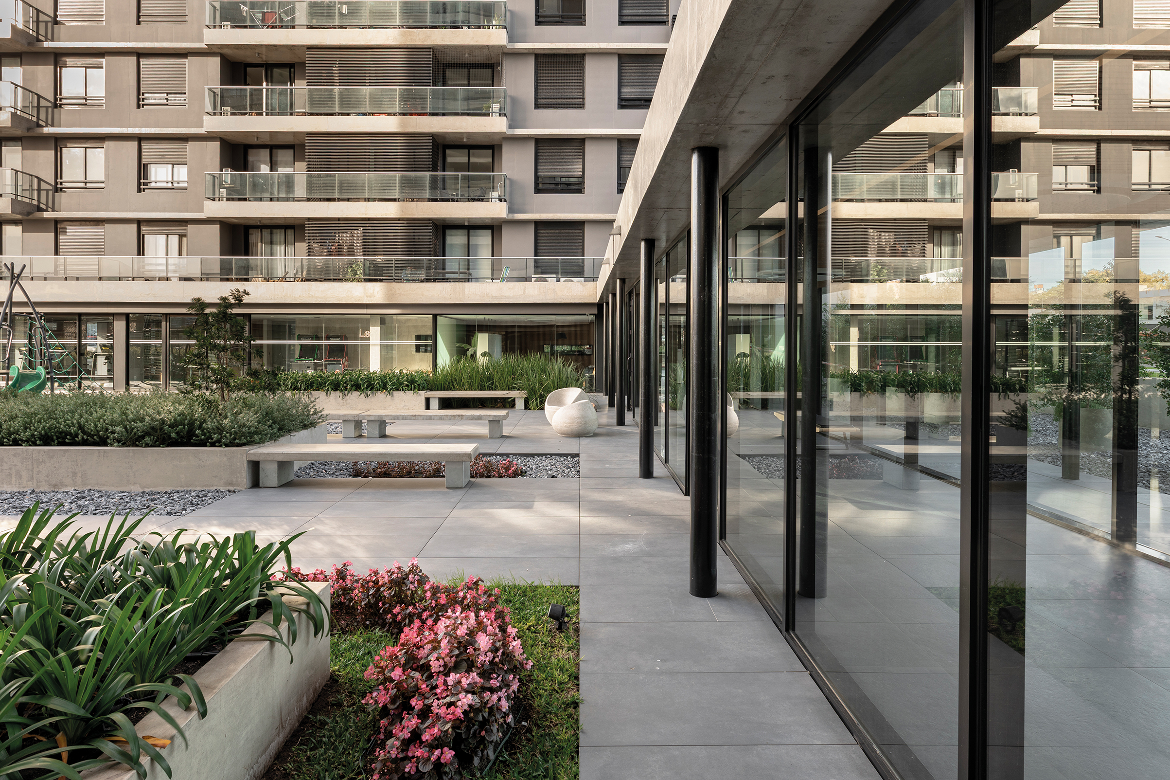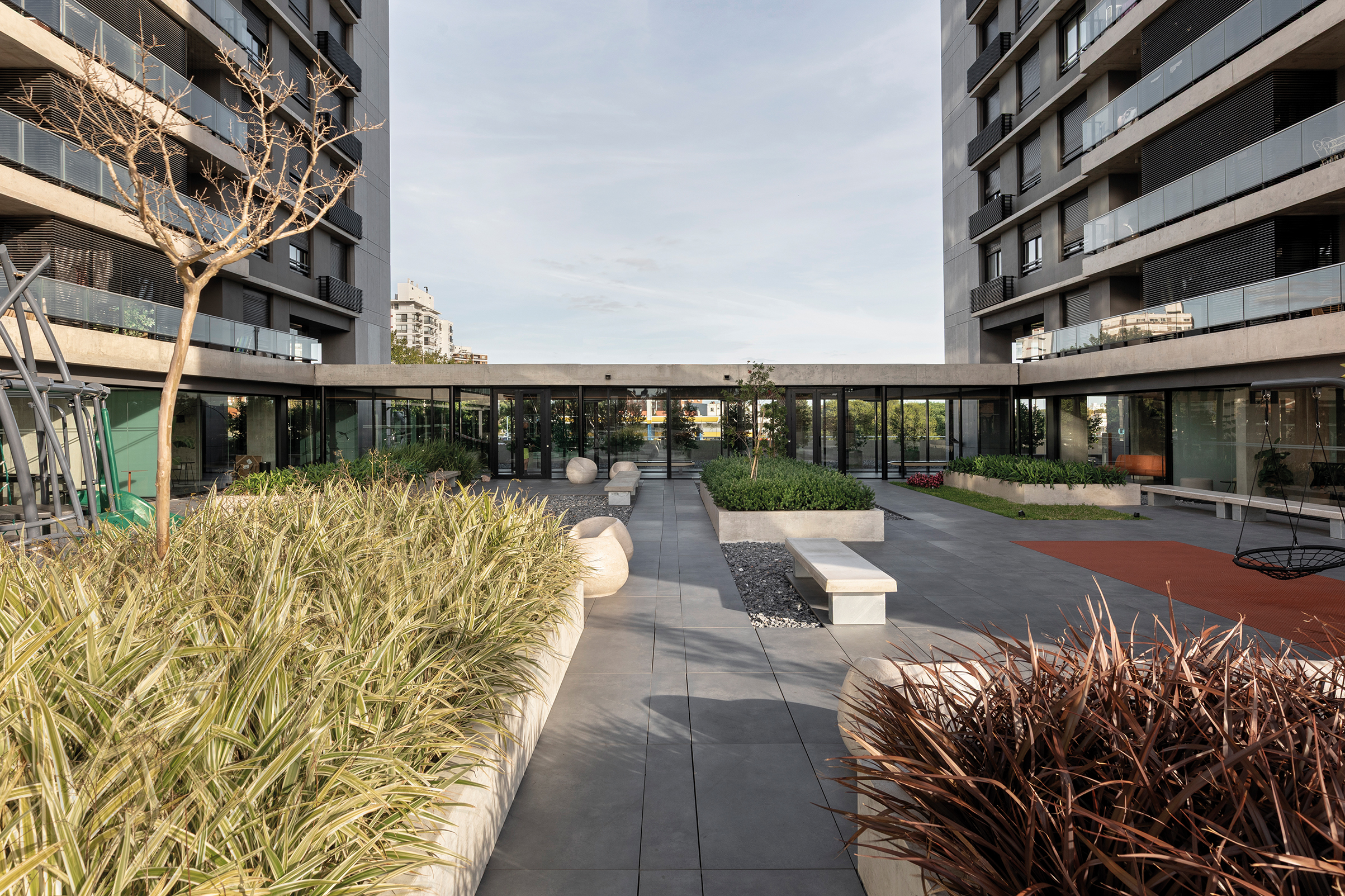 Las torres, de 55 metros de altura y orientación Este-Oeste, aseguran asoleamiento, ventilación cruzada y vistas abiertas tanto al paisaje urbano como al horizonte costero. La repetición de sus unidades no impide la expresión: cada una cuenta con terraza propia, integrando el afuera como parte del espacio doméstico. Las placas horizontales y las aristas verticales dialogan en una imagen controlada, casi tectónica, que busca orden sin rigidez. El conjunto totaliza 344 viviendas (128 de dos dormitorios, 160 de uno, 56 monoambientes), con un núcleo circulatorio de tres ascensores, escalera presurizada y palier longitudinal. Los servicios comunes en el podio (lavadero, vestuarios, salas de residuos, grupo electrógeno) refuerzan una infraestructura pensada desde la eficiencia sin perder de vista la experiencia del usuario. Pero quizás donde más se percibe la calidad de este proyecto es en su forma de pertenecer al sitio sin mimetizarse. No busca camuflarse ni imponerse. Su lenguaje es claro, sobrio, incluso didáctico. Y, sin embargo, tiene algo de enigma: hay una especie de contención poética en su regularidad, un modo de decir sin subrayar. Al caminar por la galería que une las torres, bajo el alero que filtra el sol del Este, el rumor de Avenida Italia se disuelve y aparece el murmullo verde del parque. La arquitectura actúa como mediación, como pliegue, como pausa. Y entonces, en ese interludio, uno entiende: este edificio no vino a clausurar un fragmento de ciudad, sino a abrirlo al tiempo. A sostener el futuro con sus propias terrazas, con su podio plantado como un jardín elevado, con su plaza al norte como un pequeño manifiesto de lo colectivo. No hay épica en su forma. Hay algo mejor: una ética del cuidado, una arquitectura que escucha, que observa, que espera. Una arquitectura que, como el mar cercano, no se impone, sino que permanece.