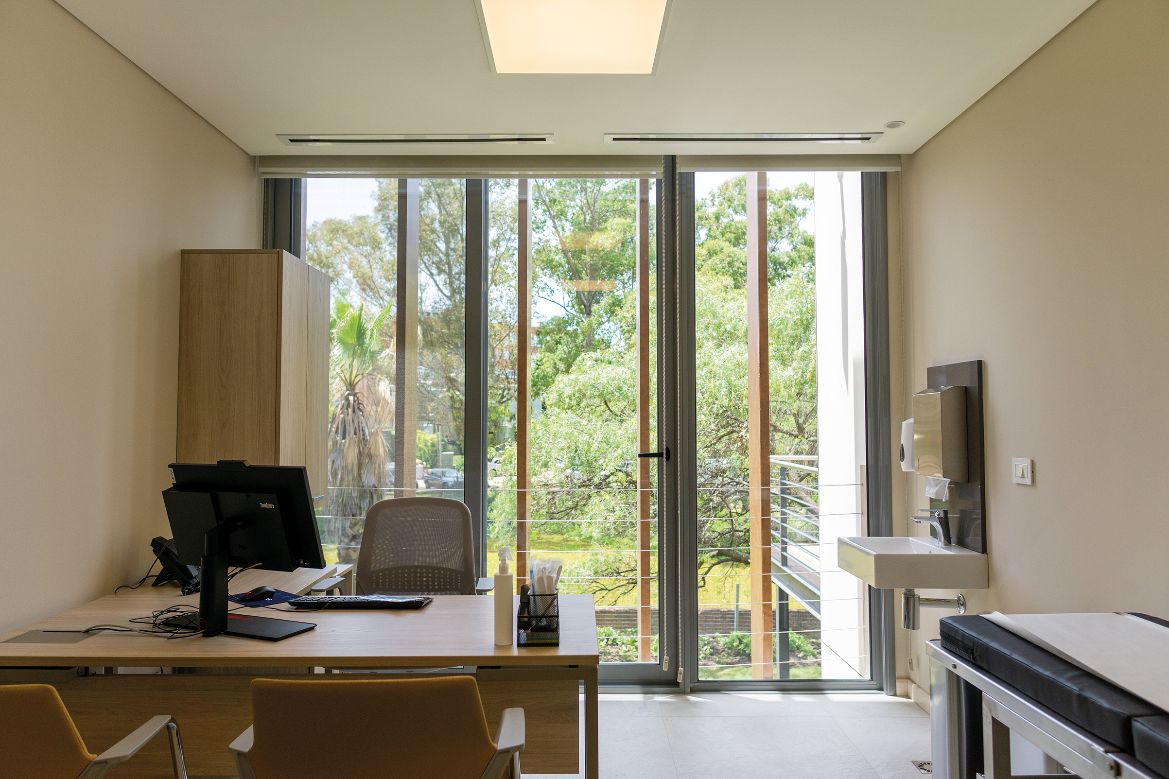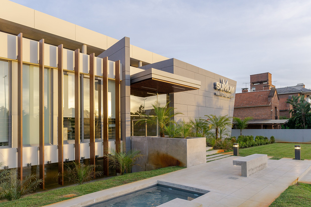 Desde sus primeras líneas de diseño, el proyecto no quiso levantar muros, sino diluirlos. Cada decisión se tomó con la premisa de habitar el límite, de volver poroso el borde entre el adentro y el afuera. Luz, jardín, agua y reflejo son parte constitutiva de su interior. Las vistas no están allí como ornamento, sino como parte activa del tratamiento. Porque aquí, la arquitectura no se limita a albergar funciones médicas: asiste, acompaña, consuela. Y lo hace sin retórica, con sobriedad y precisión. El usuario —paciente, visitante, profesional— es el centro silencioso de esta gramática arquitectónica. Todo en la clínica está pensado para su bienestar físico y emocional. La experiencia espacial se estructura con la claridad de un lenguaje que sabe ser técnico sin renunciar a lo humano. Circulaciones limpias, accesos francos, espacios flexibles: cada rincón se abre a lo posible, al cambio, a la evolución. Porque en salud, nada es estático, y la arquitectura debe saber escuchar ese movimiento.