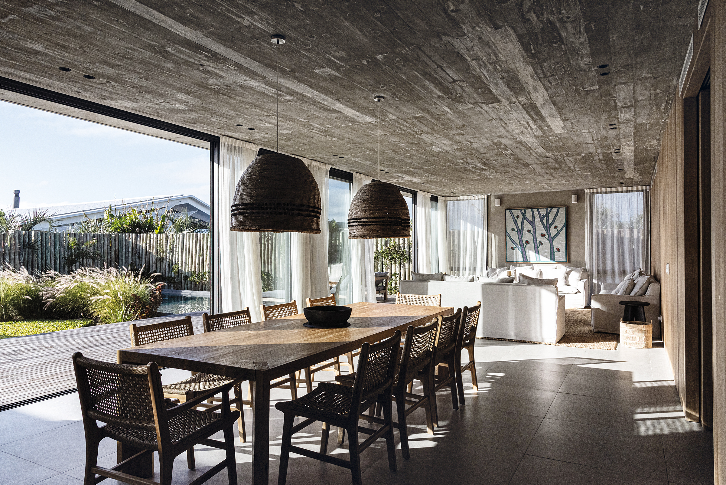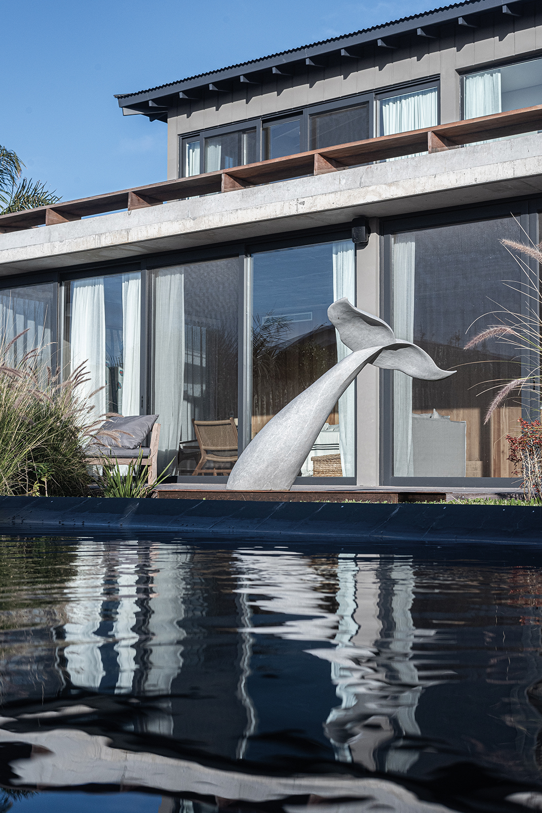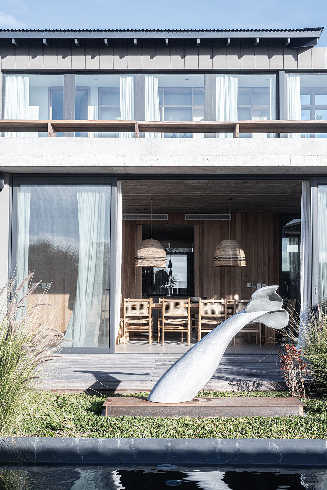 En el corazón de José Ignacio —ese paraje donde el viento salado trae recuerdos que uno nunca vivió—, se alza Casa Beluga, no como una conquista, sino como una confidencia susurrada al paisaje. No hay estridencias en su llegada, no hay fanfarrias de hormigón ni desafíos a la naturaleza. Lo que hay es respeto. Una estrategia de ocupación discreta, casi tímida, que se acomoda al terreno como lo haría un cuerpo cansado en una hamaca al atardecer. Esta obra, construida por GRUPO PLA, desde la primera mirada, descubre su voluntad de pertenencia. El trabajo conjunto con Juan y Gastón ha permitido cimentar una relación personal basada en la feliz tarea de aprender y crecer juntos en ese aprendizaje. Grupo Pla despliega sus intervenciones en rutinas de comunión, esto es de involucramiento pleno en los proyectos. La casa no impone: se insinúa. Los volúmenes se disponen con una precisión que no responde al capricho sino a la meditación. Hay un juego sutil de orientaciones, un modo de darle la espalda al mundo —a su ruido, a su vértigo— para abrirse solo al océano, al Atlántico inmenso que murmura al fondo como una voz materna. Allí, donde la vista se funde con el horizonte, la arquitectura se vuelve tenue, como si quisiera disolverse, como si su mayor ambición fuera volverse paisaje. La distribución del proyecto es una coreografía silenciosa. Un nivel se posa sobre otro, y bajo ambos, un subsuelo se deja tragar por la pendiente natural para esconder discretamente el estacionamiento, sin alardes ni cicatrices. La planta baja es un continuo de encuentros: el espacio social, el ámbito de servicio, las habitaciones para los huéspedes… todo fluye con una gracia que parece heredada del entorno. Afuera, decks, piscina, fogón y parrillero no son anexos, son extensiones del alma doméstica, formas de vivir el aire, el sol y el mar como parte de una misma 68 oración. Los patios, con sus olivos centenarios —testigos de otras eras, otras casas, quizás otros amores—, filtran la luz como se filtran los recuerdos: con ternura. Esa luz entra y modela los interiores, les da un ritmo propio, una respiración. En la planta alta, más recogida, más íntima, tres suites se asoman al paisaje como quien espía el mundo con asombro. Las aberturas, pensadas con inteligencia y poesía, establecen un diálogo continuo con el mar. Las terrazas, prolongaciones naturales del espacio interior, son lugares para pensar, para demorarse, para escuchar el silencio. La materialidad de la casa no es una elección técnica, sino un gesto de sensibilidad. Hormigón con textura pulida, madera sin afeites, cristales que no reflejan sino que enmarcan. Todo habla de una voluntad de autenticidad, de despojo elegante. Aleros profundos, galerías y espacios intermedios no son meros recursos: son respiraderos entre la arquitectura y el paisaje, umbrales entre la vida interior y el afuera perpetuo. Casa Beluga no busca protagonismo. No se exhibe. Quiere ser lo que el buen huésped es para el anfitrión: respetuosa, silenciosa, presente sin imponerse. Su forma no interrumpe el canto del viento ni la coreografía de las dunas. La vivienda se entrega al sitio como un ritual íntimo, como una carta de amor escrita en voz baja al lugar. Y así se vive: como un refugio sereno, donde el océano no solo se mira, sino que se escucha y se siente, definiendo —más allá del diseño— la verdadera experiencia de habitar.