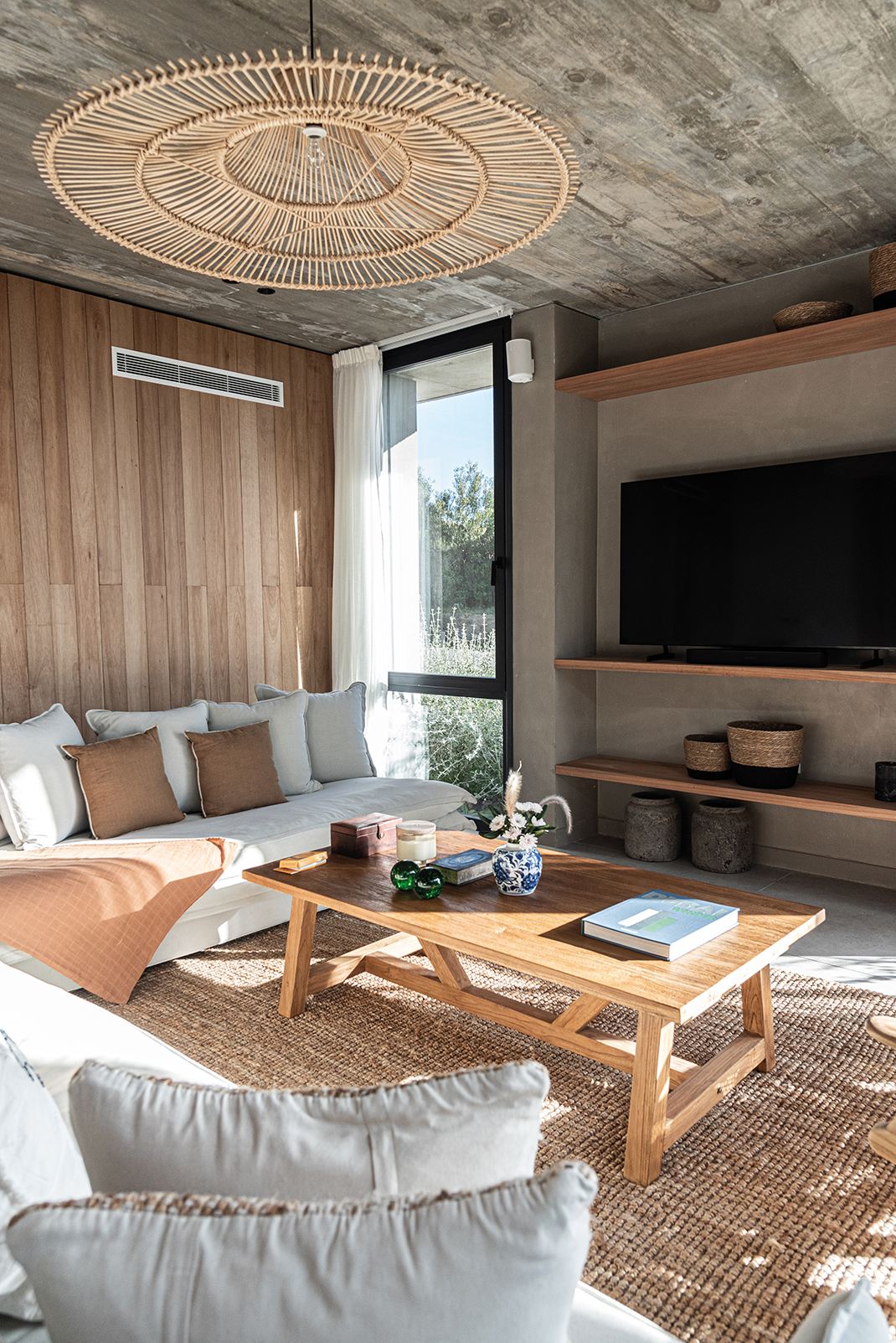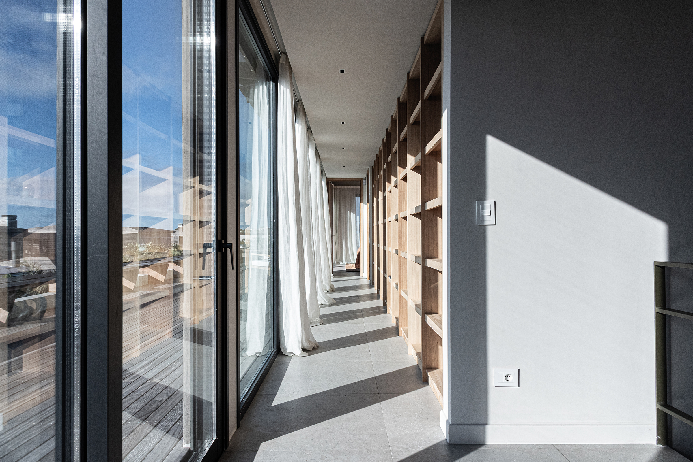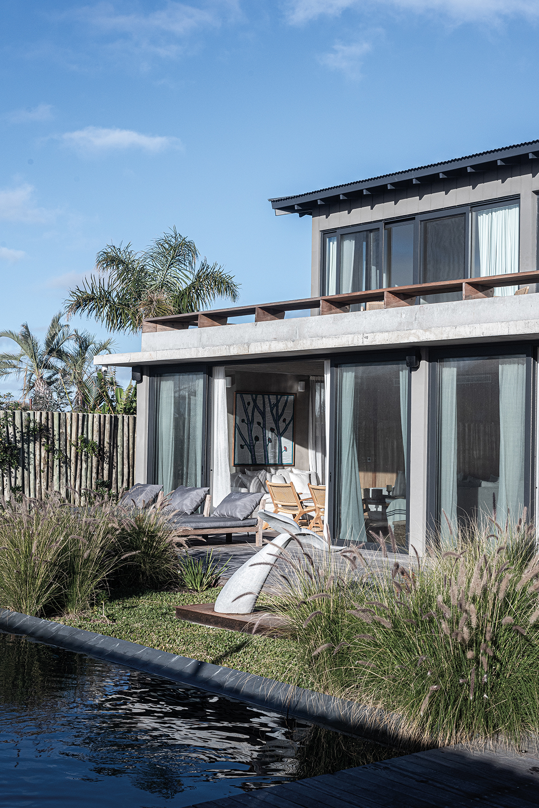 En el corazón de José Ignacio —ese paraje donde el viento salado trae recuerdos que uno nunca vivió—, se alza Casa Beluga, no como una conquista, sino como una confidencia susurrada al paisaje. No hay estridencias en su llegada, no hay fanfarrias de hormigón ni desafíos a la naturaleza. Lo que hay es respeto. Una estrategia de ocupación discreta, casi tímida, que se acomoda al terreno como lo haría un cuerpo cansado en una hamaca al atardecer. Esta obra, construida por GRUPO PLA, desde la primera mirada, descubre su voluntad de pertenencia. El trabajo conjunto con Juan y Gastón ha permitido cimentar una relación personal basada en la feliz tarea de aprender y crecer juntos en ese aprendizaje. Grupo Pla despliega sus intervenciones en rutinas de comunión, esto es de involucramiento pleno en los proyectos. La casa no impone: se insinúa. Los volúmenes se disponen con una precisión que no responde al capricho sino a la meditación. Hay un juego sutil de orientaciones, un modo de darle la espalda al mundo —a su ruido, a su vértigo— para abrirse solo al océano, al Atlántico inmenso que murmura al fondo como una voz materna. Allí, donde la vista se funde con el horizonte, la arquitectura se vuelve tenue, como si quisiera disolverse, como si su mayor ambición fuera volverse paisaje. La distribución del proyecto es una coreografía silenciosa. Un nivel se posa sobre otro, y bajo ambos, un subsuelo se deja tragar por la pendiente natural para esconder discretamente el estacionamiento, sin alardes ni cicatrices. La planta baja es un continuo de encuentros: el espacio social, el ámbito de servicio, las habitaciones para los huéspedes… todo fluye con una gracia que parece heredada del entorno. Afuera, decks, piscina, fogón y parrillero no son anexos, son extensiones del alma doméstica, formas de vivir el aire, el sol y el mar como parte de una misma 68 oración. Los patios, con sus olivos centenarios —testigos de otras eras, otras casas, quizás otros amores—, filtran la luz como se filtran los recuerdos: con ternura. Esa luz entra y modela los interiores, les da un ritmo propio, una respiración. En la planta alta, más recogida, más íntima, tres suites se asoman al paisaje como quien espía el mundo con asombro. Las aberturas, pensadas con inteligencia y poesía, establecen un diálogo continuo con el mar. Las terrazas, prolongaciones naturales del espacio interior, son lugares para pensar, para demorarse, para escuchar el silencio. La materialidad de la casa no es una elección técnica, sino un gesto de sensibilidad. Hormigón con textura pulida, madera sin afeites, cristales que no reflejan sino que enmarcan. Todo habla de una voluntad de autenticidad, de despojo elegante. Aleros profundos, galerías y espacios intermedios no son meros recursos: son respiraderos entre la arquitectura y el paisaje, umbrales entre la vida interior y el afuera perpetuo. Casa Beluga no busca protagonismo. No se exhibe. Quiere ser lo que el buen huésped es para el anfitrión: respetuosa, silenciosa, presente sin imponerse. Su forma no interrumpe el canto del viento ni la coreografía de las dunas. La vivienda se entrega al sitio como un ritual íntimo, como una carta de amor escrita en voz baja al lugar. Y así se vive: como un refugio sereno, donde el océano no solo se mira, sino que se escucha y se siente, definiendo —más allá del diseño— la verdadera experiencia de habitar.