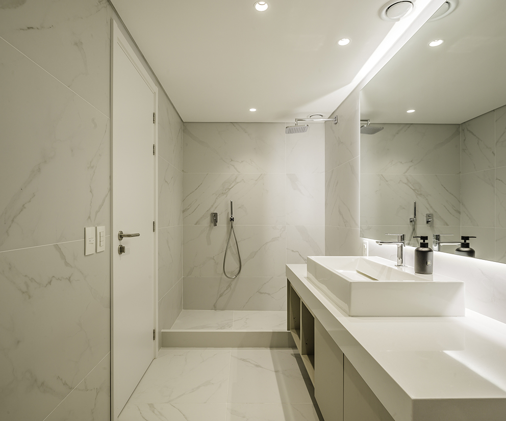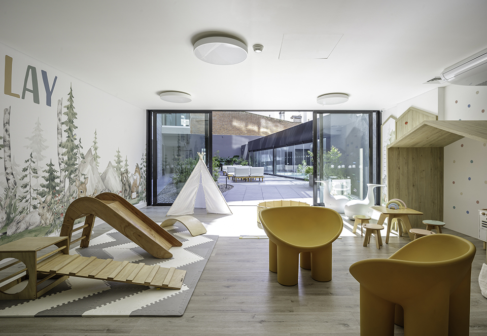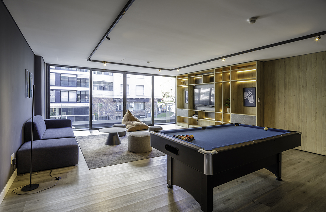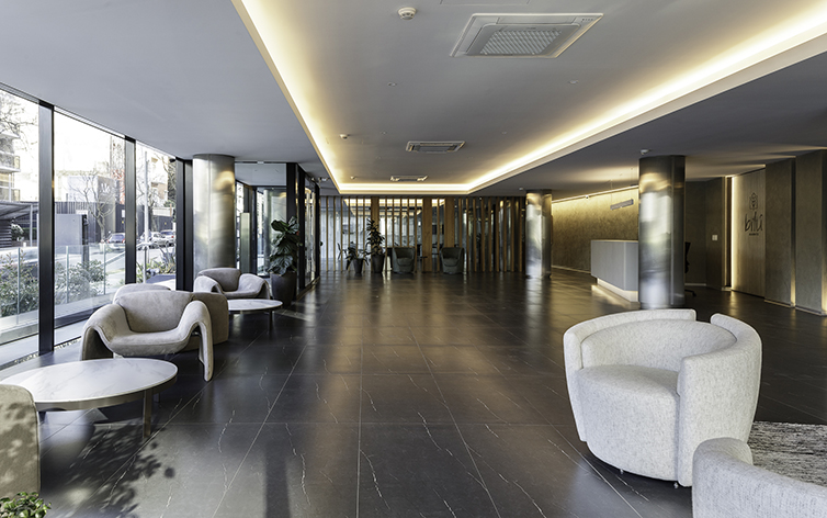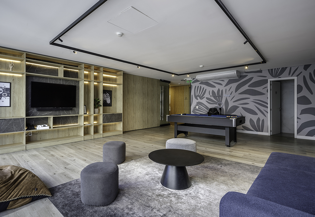 Los espacios comunes refuerzan esta filosofía de diseño. La piscina climatizada, el sauna y la sala de masajes no solo responden a una propuesta de bienestar, sino que están ambientados con una sutileza que evoca spas de alta gama. Las dos barbacoas, el playroom, el kids club y el cine han sido proyectados con una atención exquisita a la funcionalidad, sin perder la coherencia estética del conjunto. El pet spa, un detalle innovador, refleja una visión moderna de la vida en la ciudad, donde las mascotas también tienen su espacio dentro del diseño residencial de lujo.