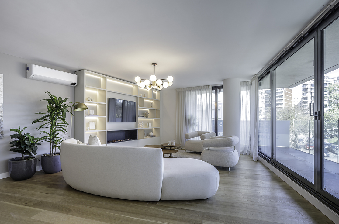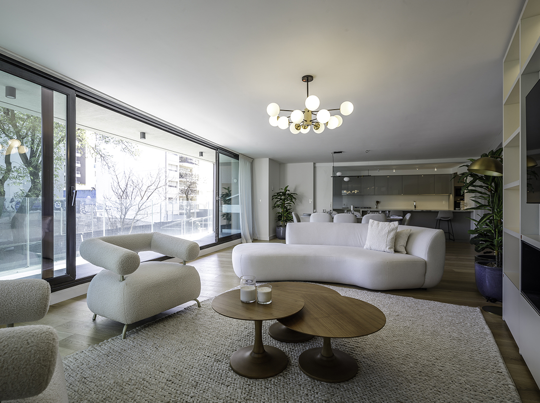 El proyecto de interiorismo de la unidad que ahora recorremos junto a ustedes, a cargo de la reconocida interiorista Vicky Baumgartner, ha sido concebido con una visión precisa que fusiona confort y estética, con una selección de materiales de la más alta calidad y un diálogo constante entre luz, texturas y volúmenes.