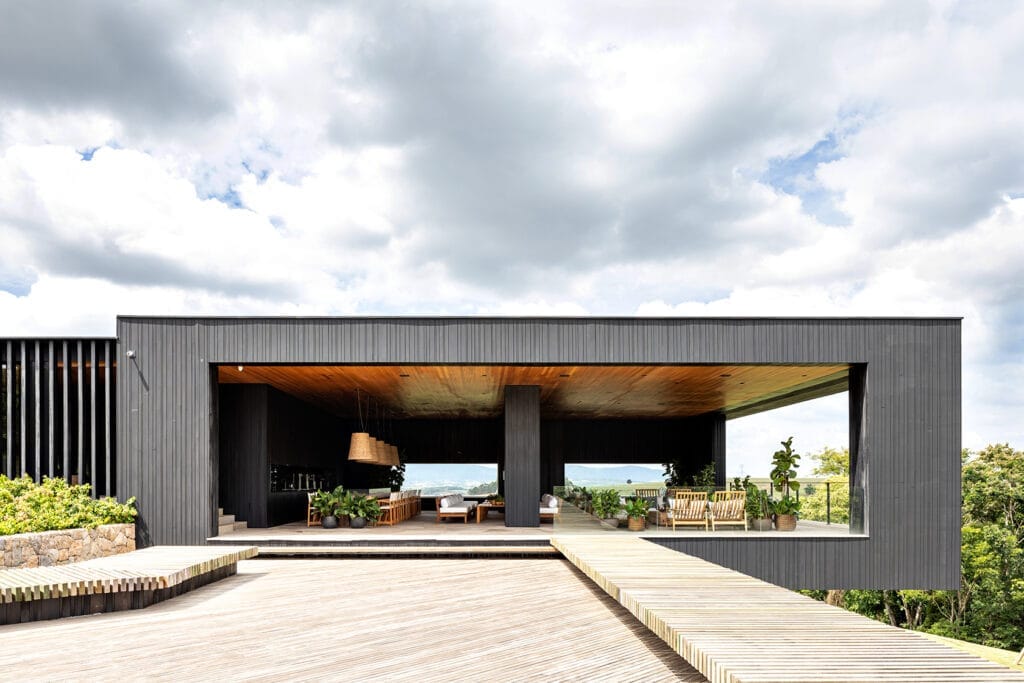 fue diseñada respetando la topografía del terreno, ubicando la estructura en altura y respetando las plantaciones existentes para conseguir privacidad y aprovechar las vistas del paisaje circundante, lo que fue la premisa fundamental a la hora de establecer el proyecto. El edificio se presenta con tres volúmenes rectangular como planta principal y un cuarto volumen a modo de gran caja que se superpone a la planta principal, moldeando la forma de una “U” por medio de la gran piscina que termina de estructurar la estructura. Todos los ambientes de la casa son espaciosos y aprovechan las grandes vistas.
