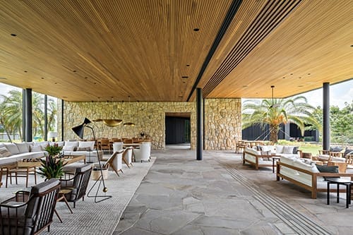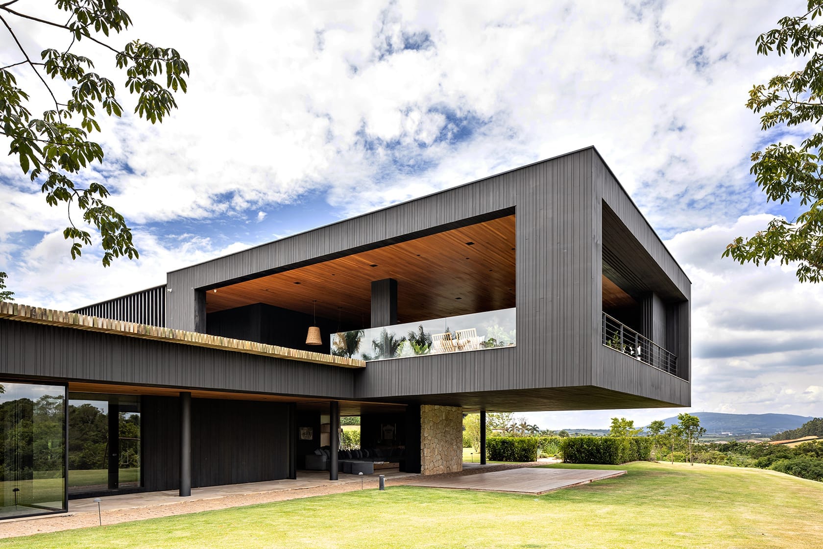 fue diseñada respetando la topografía del terreno, ubicando la estructura en altura y respetando las plantaciones existentes para conseguir privacidad y aprovechar las vistas del paisaje circundante, lo que fue la premisa fundamental a la hora de establecer el proyecto. El edificio se presenta con tres volúmenes rectangular como planta principal y un cuarto volumen a modo de gran caja que se superpone a la planta principal, moldeando la forma de una “U” por medio de la gran piscina que termina de estructurar la estructura. Todos los ambientes de la casa son espaciosos y aprovechan las grandes vistas.