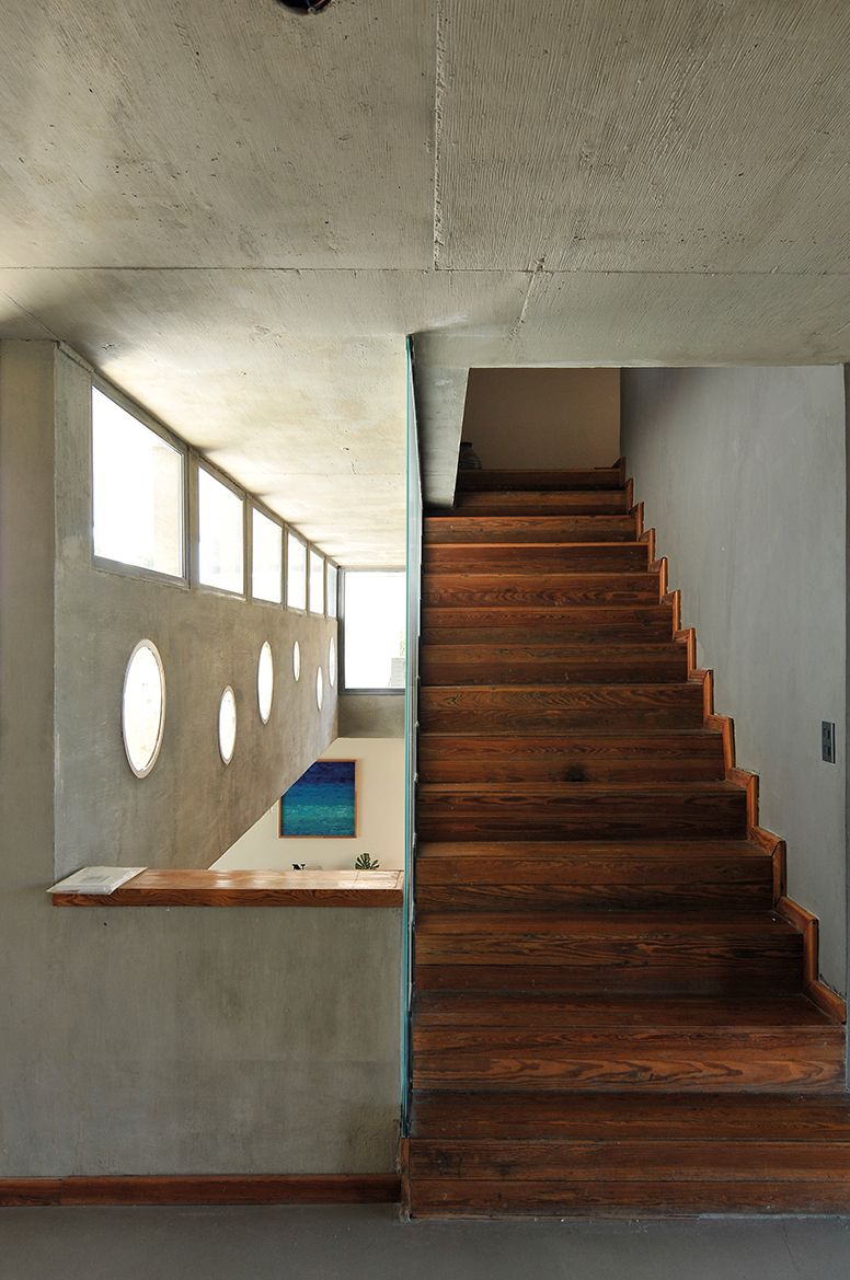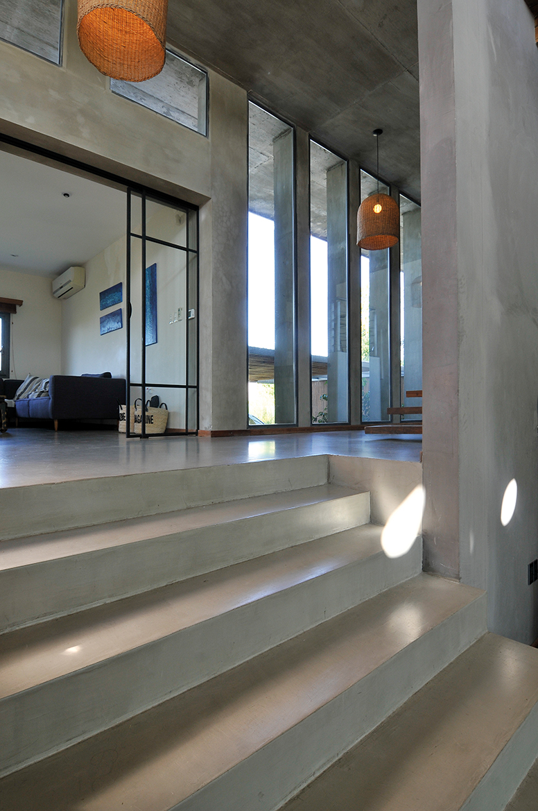 Hacia el interior los ambientes se desarrollan de forma amplia y despojada, lo que contribuye a la fluidez del espacio. Allí, el hormigón y la madera se combinan para dar una imagen limpia y serena. A través de los elementos de cerramientos, el exterior va permeando lentamente hasta lograr una vista amplia y profunda que remata en el lago. Los ambientes internos buscan así al lago como remate de la experiencia espacial. Sobre esa vista, aparecen el solarium y el parrillero abierto completando el conjunto. Una gran piscina que se diluye en estanque mantienen la referencia constante al lago enfatizando la presencia del agua. Otro de gesto típico de Alejandro Schweizer. Por todos sus detalles la Casa Lagos resulta diferente. Se trata de una arquitectura que explora y propone, una arquitectura que se constituye en una pieza actual y expresiva. Esto hace que logre ir más allá de ser un simple refugio y se convierta en una propuesta de importante valor estético.