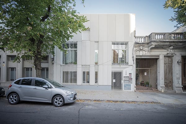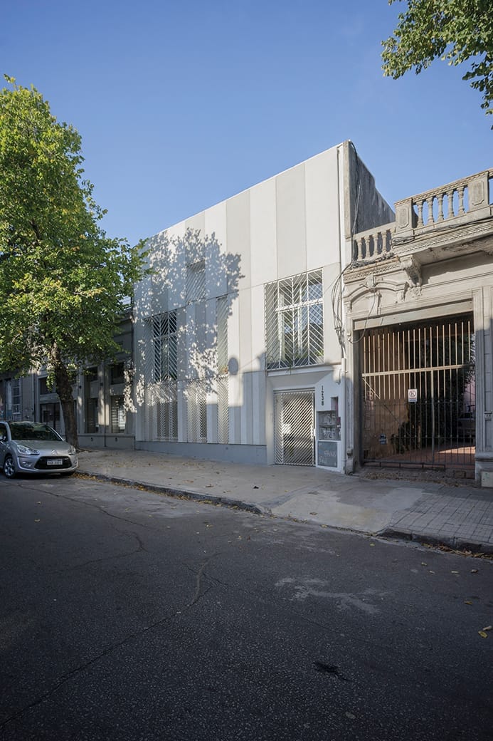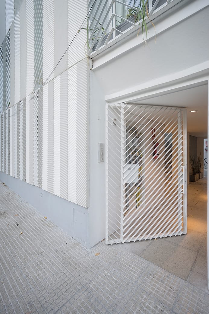 En la fachada se propone un revestimiento con la placa de GRC, con una trama de rayas a 45, generando un ritmo con su despiezo, que se recupera con las rejas de protección. El aporte al paisaje construido en la cuadra se integra naturalmente a situaciones similares y propone un dialogo muy rico con antecedentes originales que se mantienen.