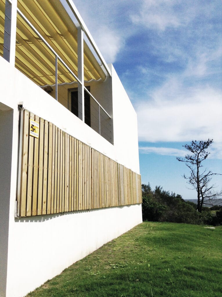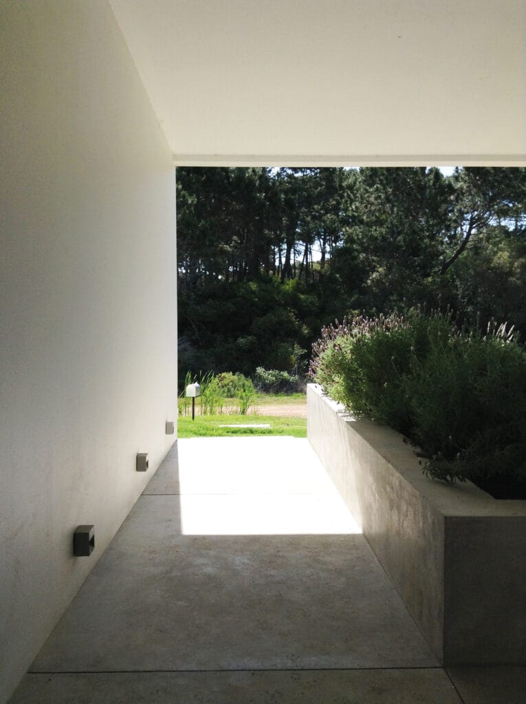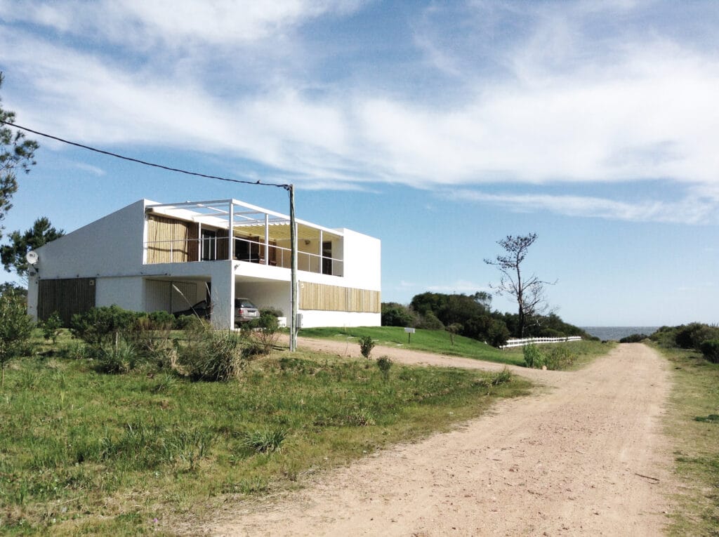 Se trata de una vivienda cerca del mar, pero que será habitada durante todo el año. El encargo pedía que el living comedor tuviera el techo en doble altura y una buhardilla que balconee a este espacio, una cocina integrada al espacio social, cuatro dormitorios iguales (uno para cada hijo) y en la planta alta la suite principal. El terreno es amplio y ofrece distintos paisajes en cada orientación: al este el fondo y un bosque de pinos marítimos; al norte el reparo del viento marino y el sol; al frente el oeste, una cañada-bosque público, y al sur el mar. A partir de esta oferta del sitio, el proyecto busca que la casa se abra a los cuatro lados, con la intención de que todos los espacios de la casa capturen alguna de estas características. Así, el espacio de comedor se conecta con el parrillero y se abren al fondo, apropiándoselo. Estar adentro es como estar afuera. El living se abre al norte, para capturar el sol desde el lugar de estar. Los dormitorios, dan al frente, pero mantienen la privacidad con una serie de ventanas colocadas a noventa centímetros de altura desde el piso, que permiten que una persona acostada pueda mirar los árboles que enmarcan la cañada, sin ser vista desde la calle. El dormitorio principal, separado del resto, en la planta alta, mira al mar. Mientras una terraza amplia de uso común extiende la buhardilla, transformándola en el lugar ideal para disfrutar el atardecer. Los amplios ventanales se cierran con postigos de tablas de pino. La separación entre tablas permite ventilar la casa en las noches de verano, aun cuando los postigos están cerrados. El pino, que se mantiene rústico, sin pintar, hace de contrapunto para las paredes blancas y las líneas rectas de la casa.