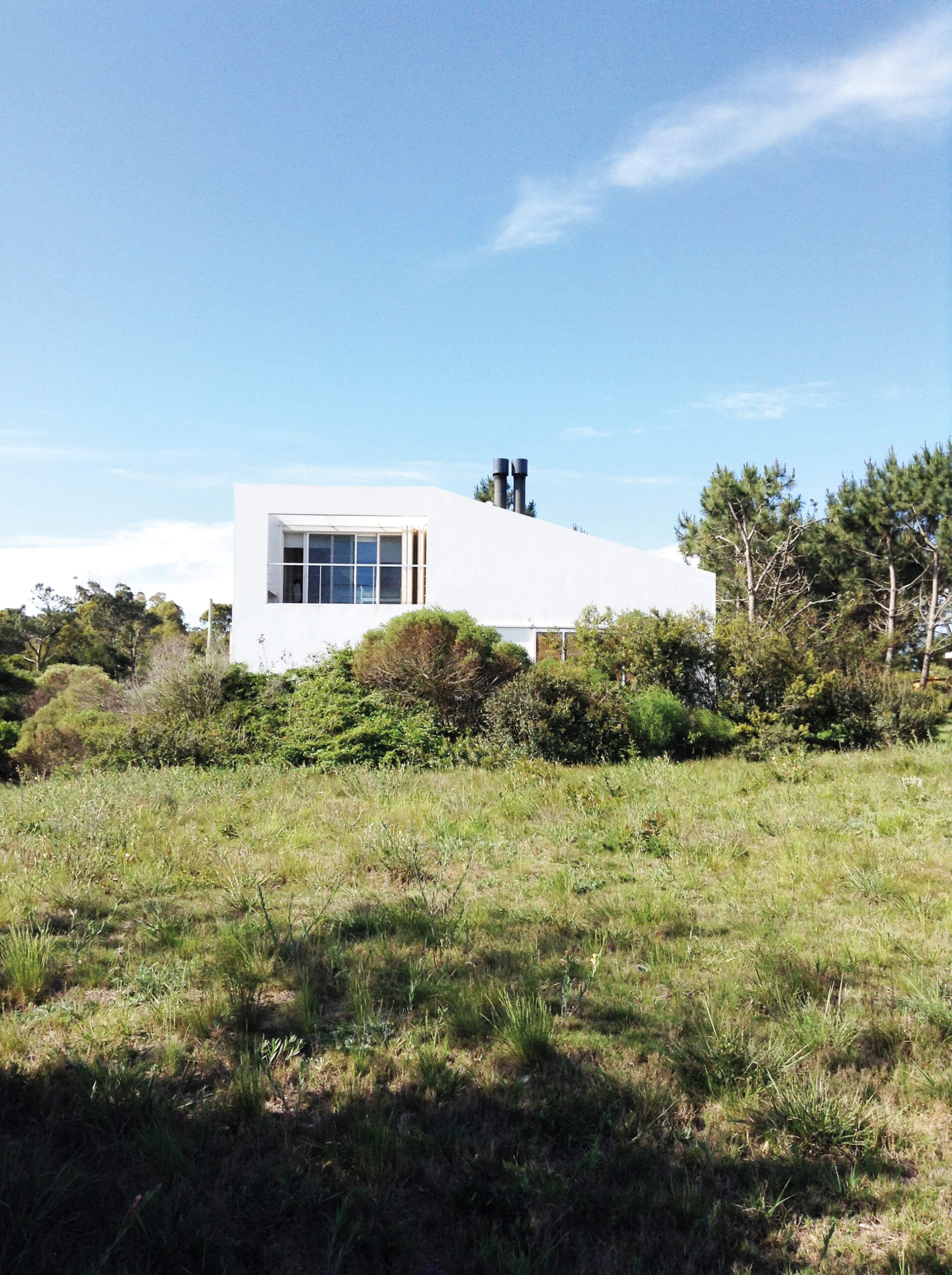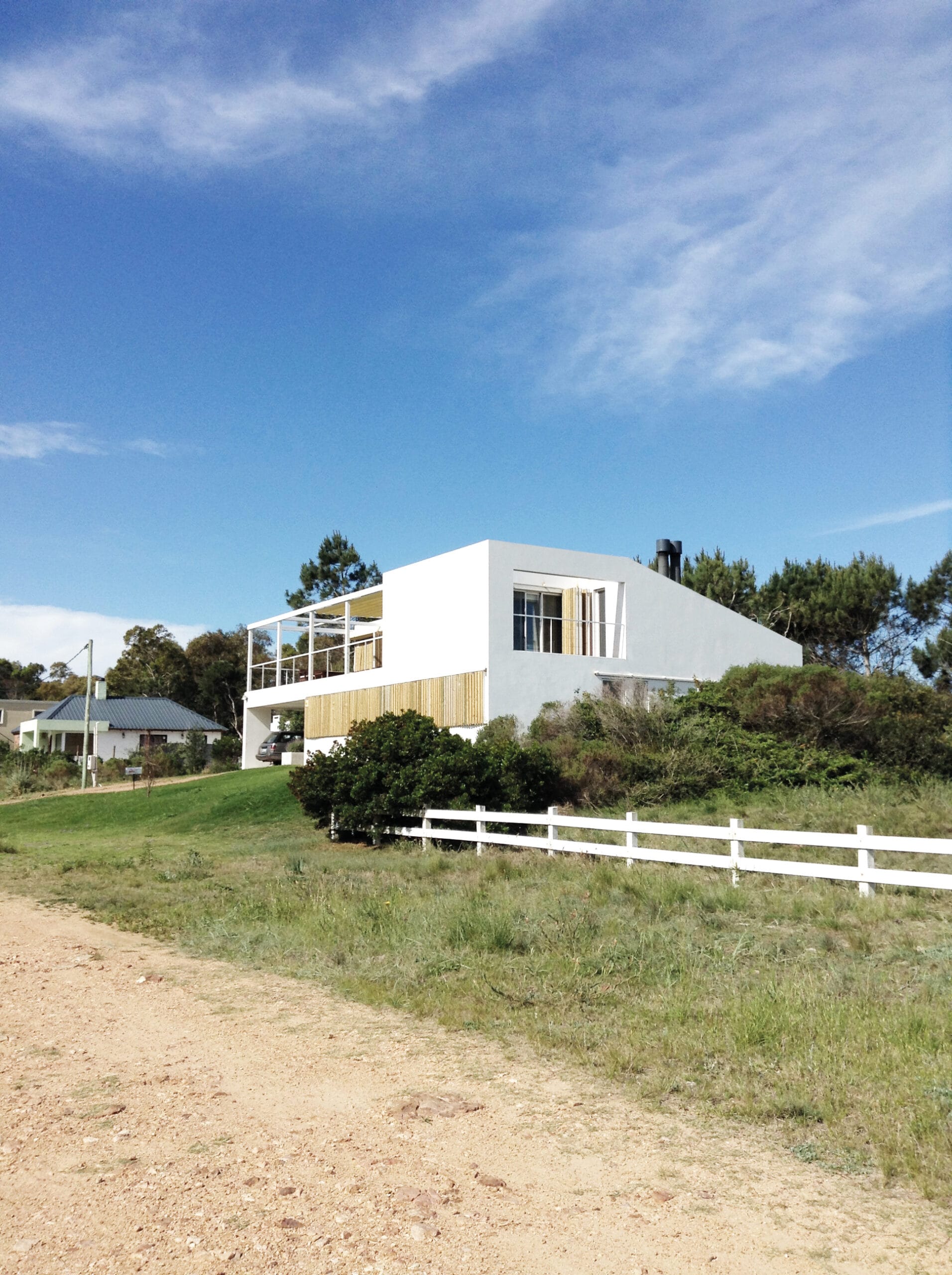 Se trata de una vivienda cerca del mar, pero que será habitada durante todo el año. El encargo pedía que el living comedor tuviera el techo en doble altura y una buhardilla que balconee a este espacio, una cocina integrada al espacio social, cuatro dormitorios iguales (uno para cada hijo) y en la planta alta la suite principal. El terreno es amplio y ofrece distintos paisajes en cada orientación: al este el fondo y un bosque de pinos marítimos; al norte el reparo del viento marino y el sol; al frente el oeste, una cañada-bosque público, y al sur el mar. A partir de esta oferta del sitio, el proyecto busca que la casa se abra a los cuatro lados, con la intención de que todos los espacios de la casa capturen alguna de estas características. Así, el espacio de comedor se conecta con el parrillero y se abren al fondo, apropiándoselo. Estar adentro es como estar afuera. El living se abre al norte, para capturar el sol desde el lugar de estar. Los dormitorios, dan al frente, pero mantienen la privacidad con una serie de ventanas colocadas a noventa centímetros de altura desde el piso, que permiten que una persona acostada pueda mirar los árboles que enmarcan la cañada, sin ser vista desde la calle. El dormitorio principal, separado del resto, en la planta alta, mira al mar. Mientras una terraza amplia de uso común extiende la buhardilla, transformándola en el lugar ideal para disfrutar el atardecer. Los amplios ventanales se cierran con postigos de tablas de pino. La separación entre tablas permite ventilar la casa en las noches de verano, aun cuando los postigos están cerrados. El pino, que se mantiene rústico, sin pintar, hace de contrapunto para las paredes blancas y las líneas rectas de la casa.