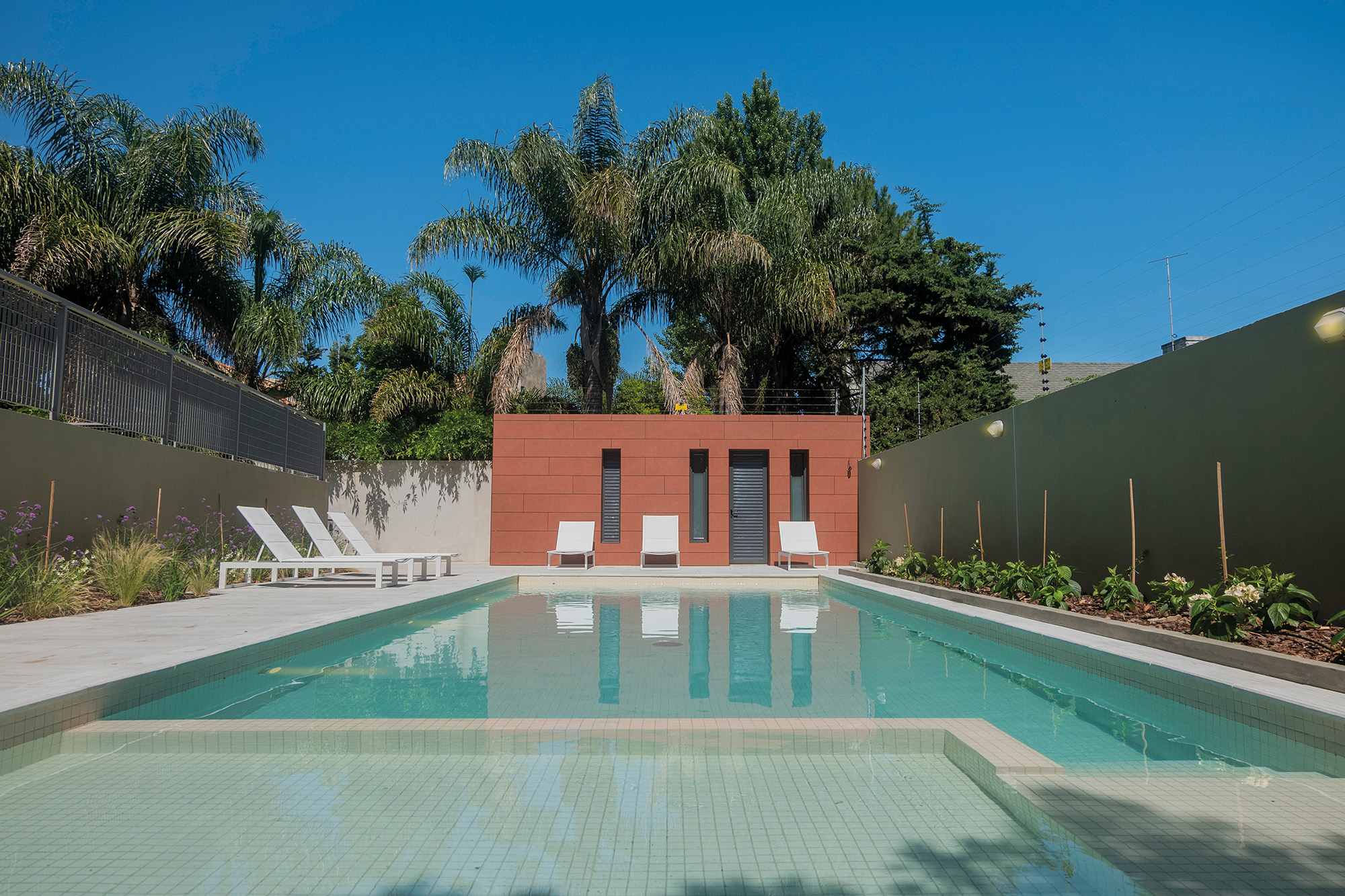 En el jardín posterior se ubica una amplia Barbacoa integrada al jardín con espacios interiores y exteriores integrables, cocina, baño y un parrillero exterior con barra. Al otro lado del jardín se ubica la Piscina Climatizada con Solárium, y sector de niños.