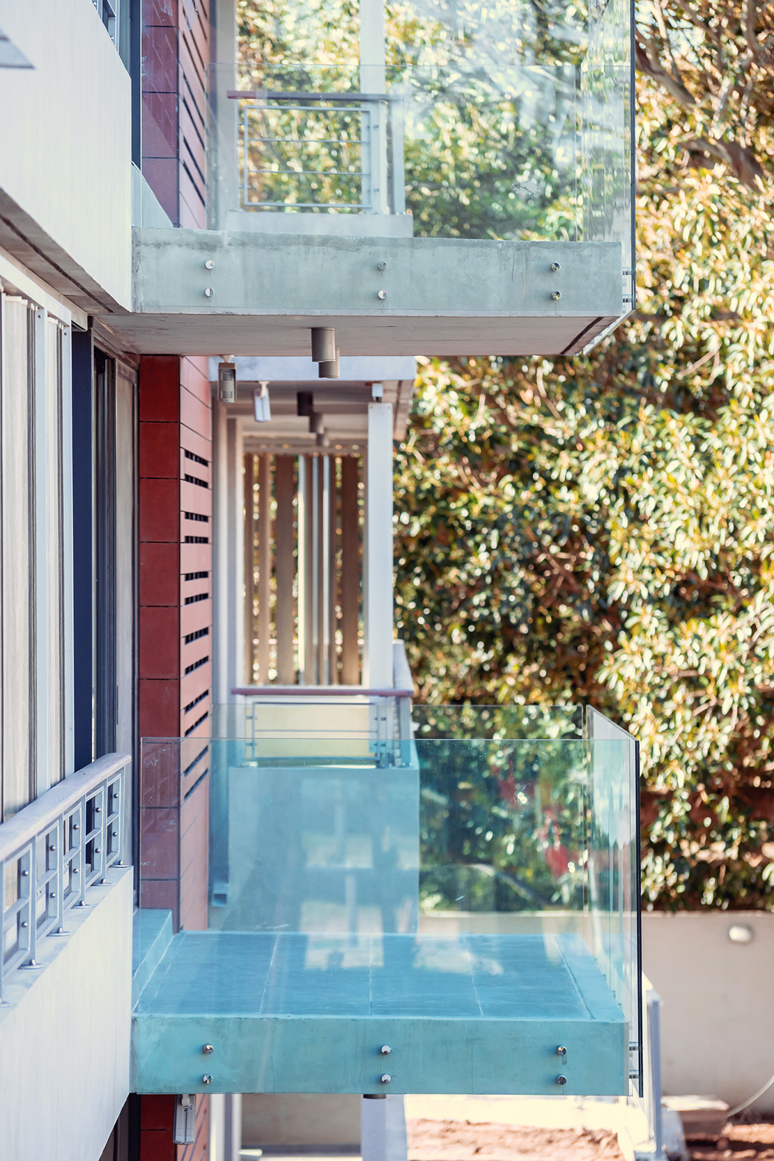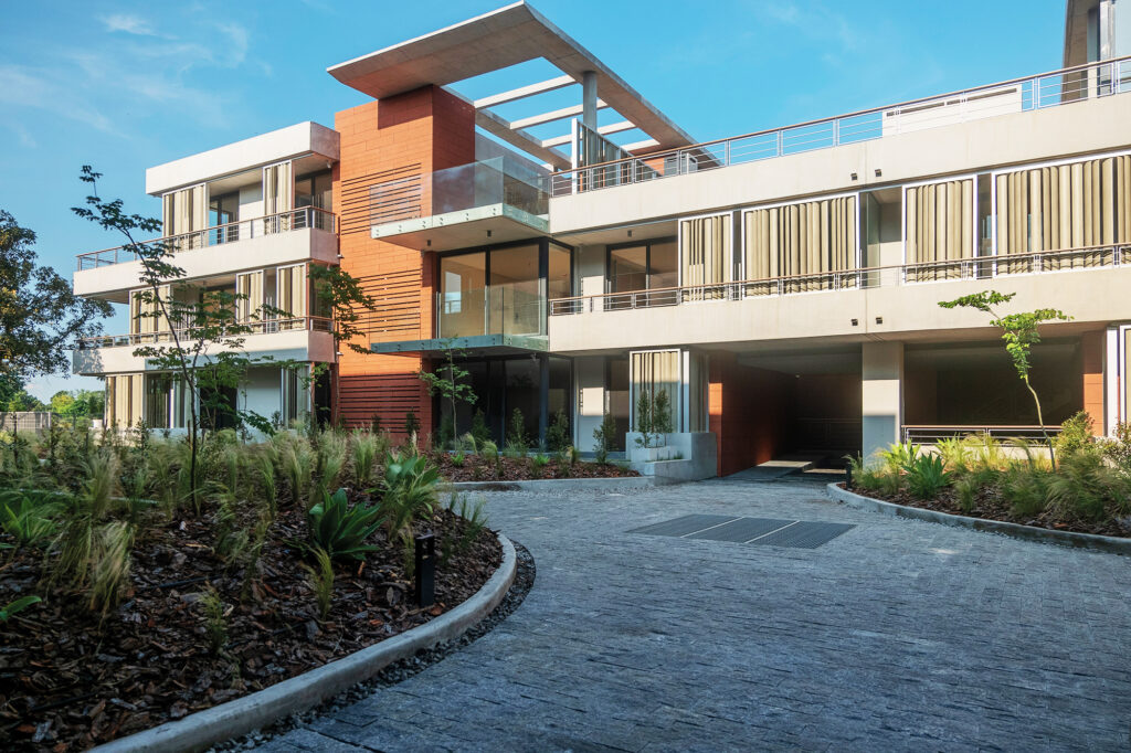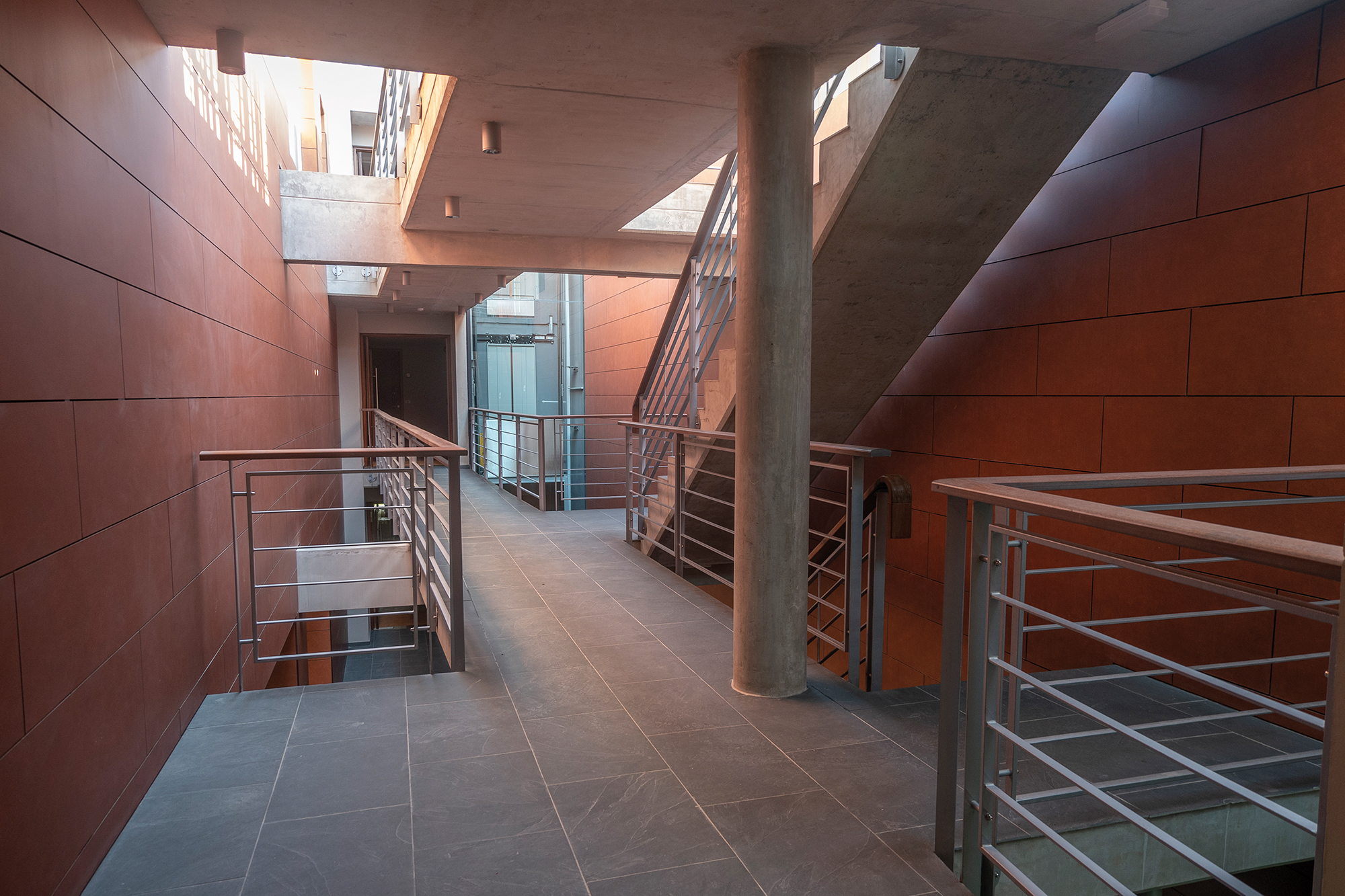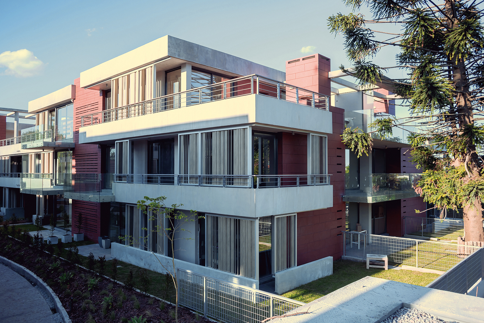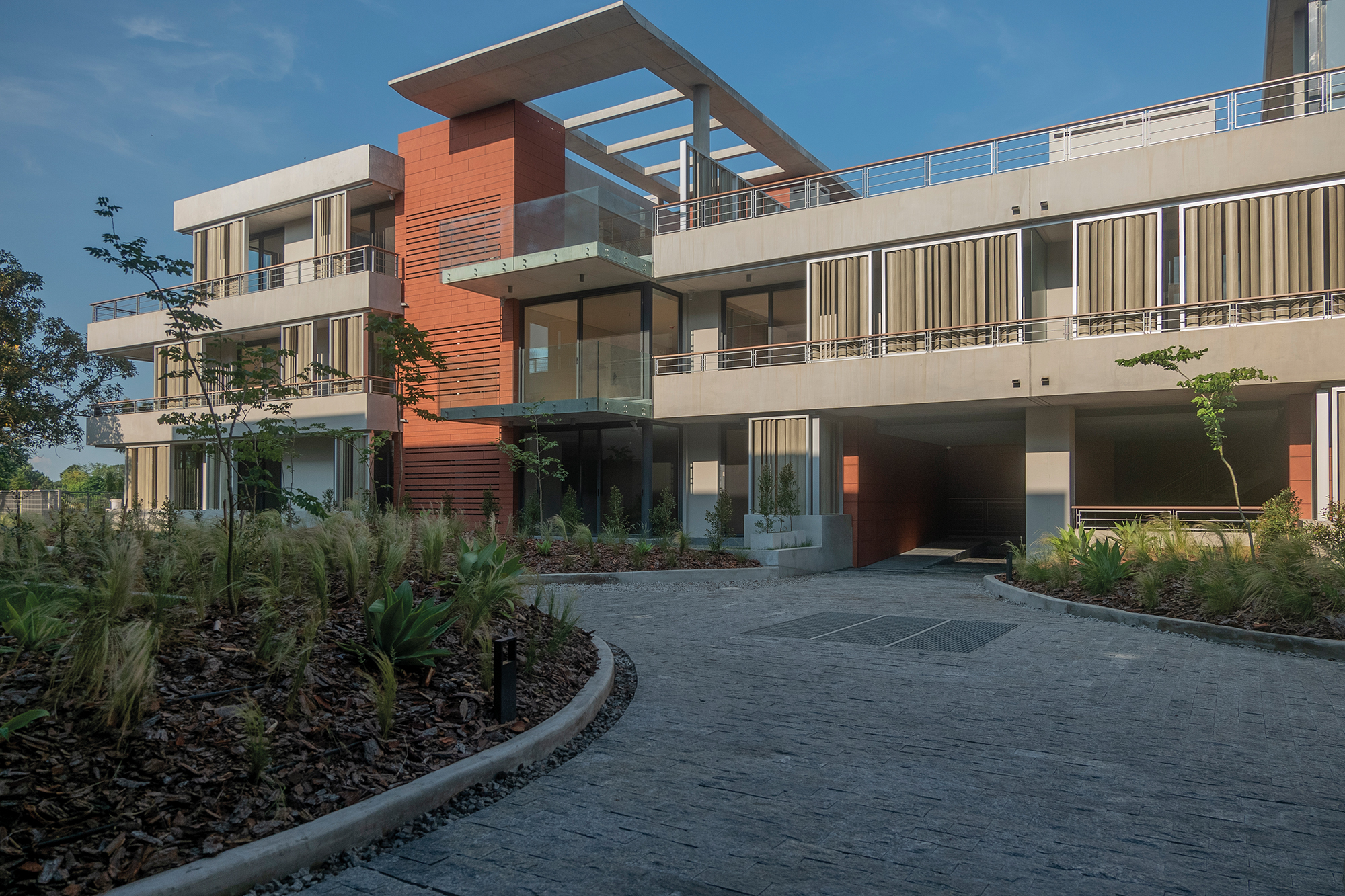 La fachada de los edificios y espacios centrales de circulación se resuelven con una fachada ventilada TRESPA, especialmente definida y diseñada para este proyecto. Tanto el color, la textura como el despiezo seleccionado le aportan al edificio un clásico color terracota combinado en una moderna fachada que resuelve en forma envolvente los volúmenes. Este tipo de fachada es de alta prestación y le aporta al conjunto un realce volumétrico en contrapunto con los parasoles Hunter Douglas que tamizan las visuales y generan un efecto dinámico a todo el conjunto.