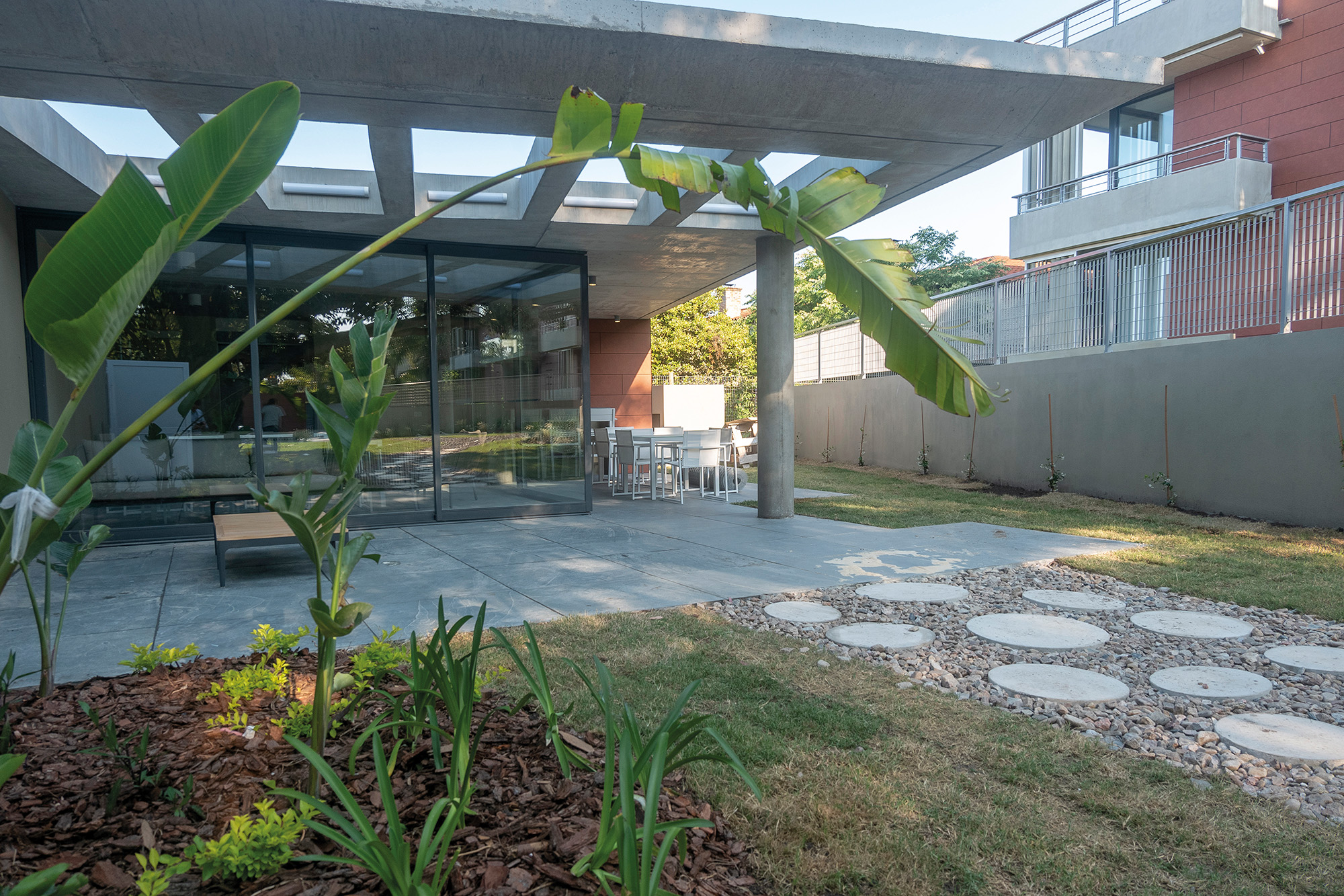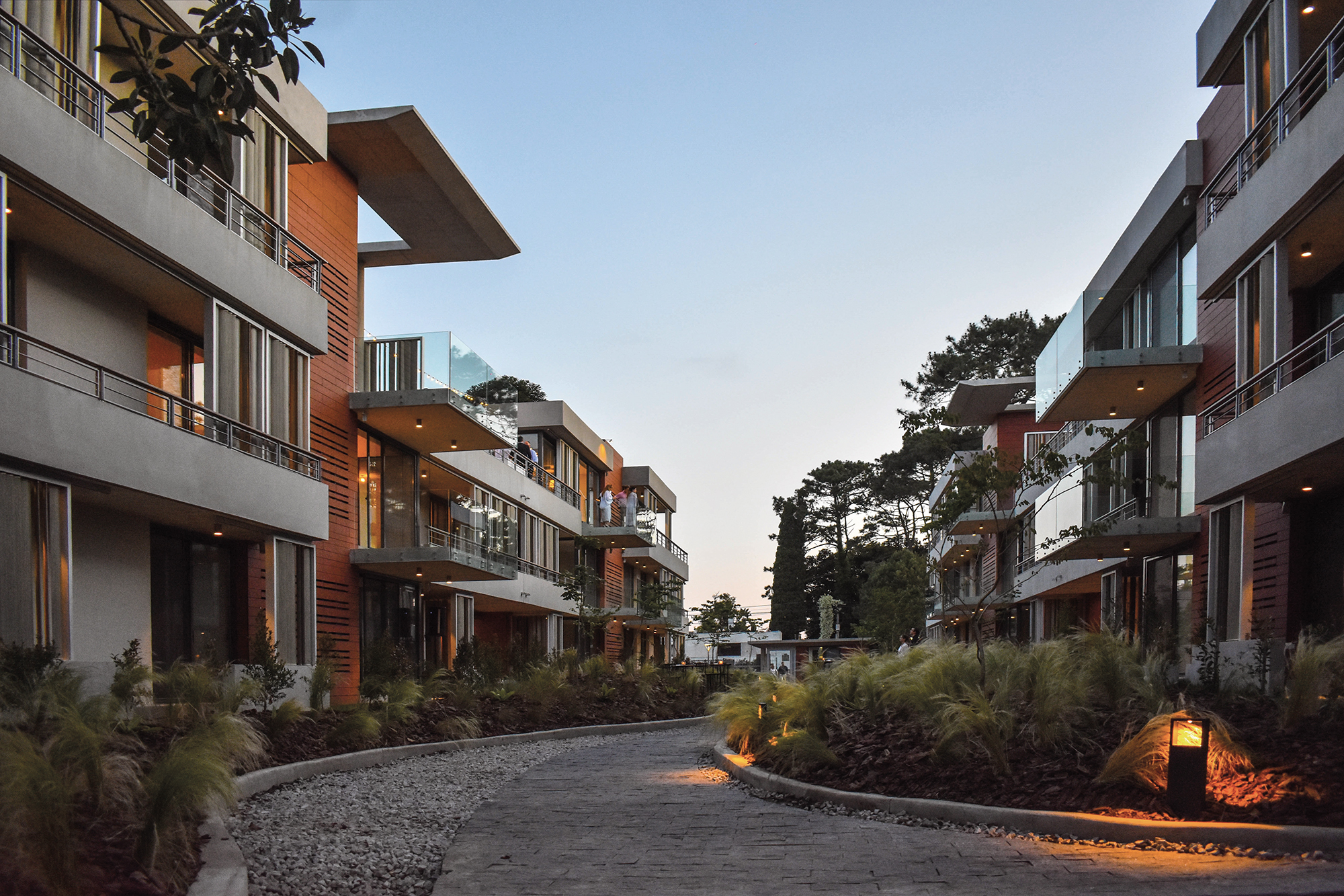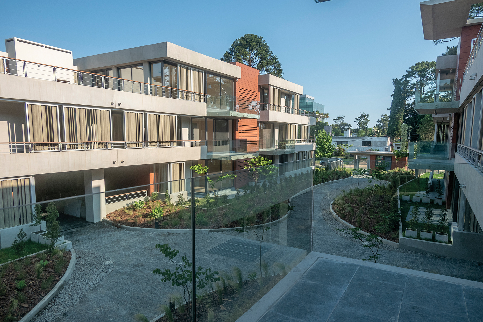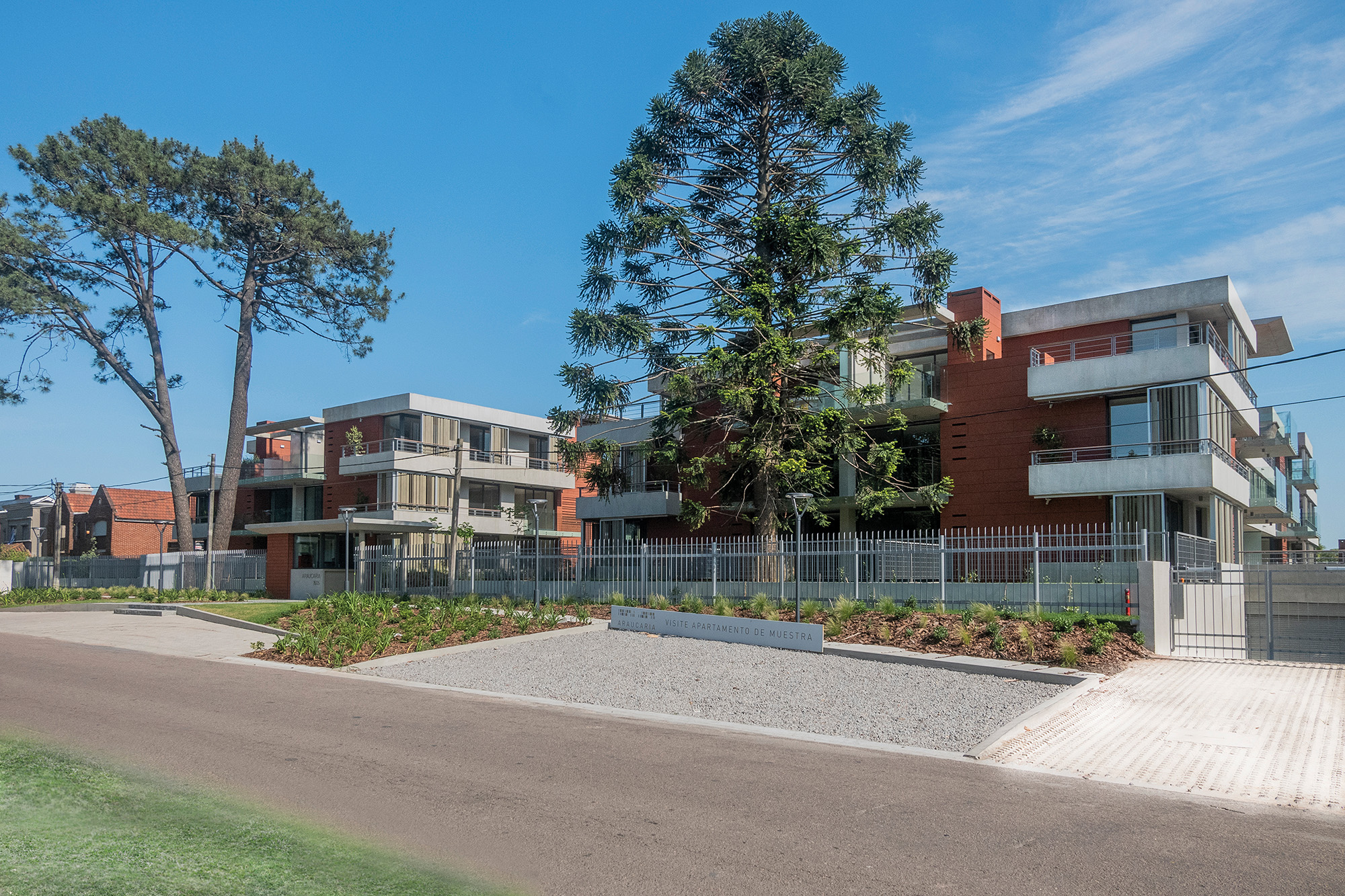 Araucaria propone un recorrido, una experiencia nueva desde cualquiera de sus puntos de acceso, peatonales y vehiculares. Este recorrido empieza desde el espacio público ya que la vereda ha sido tratada de la misma forma que el resto del proyecto con la incorporación de áreas enjardinadas, luminarias y espacios de estacionamiento de cortesía. Todo esto tiene más que ver con las sensaciones de una casa suburbana típica del barrio de Carrasco, que con un edificio.