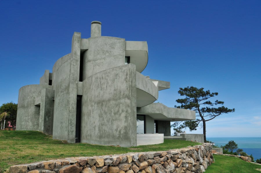El proyecto de esta casa suponía un gran desafío. El terreno, ubicado en la ladera de la bahía de la Solana del Mar, Punta Ballena, linda con la ruta 10. La topografía es caprichosa y en este solar ofrecía dificultades de todo tipo, pendientes inexplicables, accesos singulares. Pero la vista y el profundo conocimiento del lugar y el paisaje del lugar permitieron que el Arquitecto Samuel Flores Flores lograra no solo el mejor partido posible, sino además una suerte de “opus” en su larga obra de arquitectura orgánica. En esta casa se resumen todos los conceptos e ideas que sobre la casa el reconocido profesional ha venido desplegando a lo largo de los últimos veinte años. La escala humana del edificio, la poesía de sus formas que exhibe la total ausencia de líneas rectas, señala a esta casa como a uno de los mayores exponente de la Arquitectura Orgánica en la región. La formalización señala hacia un concepto que la aleja de las construcciones convencionales y estereotipadas. La armonía espacial se logra con el equilibrio de las partes, que conforman el todo y no con la repetición simétrica de las mismas. Al mismo tiempo se agrega la línea curva en la proyección. La espacialidad atrapada es dinámica y energizante y el resultado bastante se asemeja a una escultura de gran porte. A una escultura habitable.