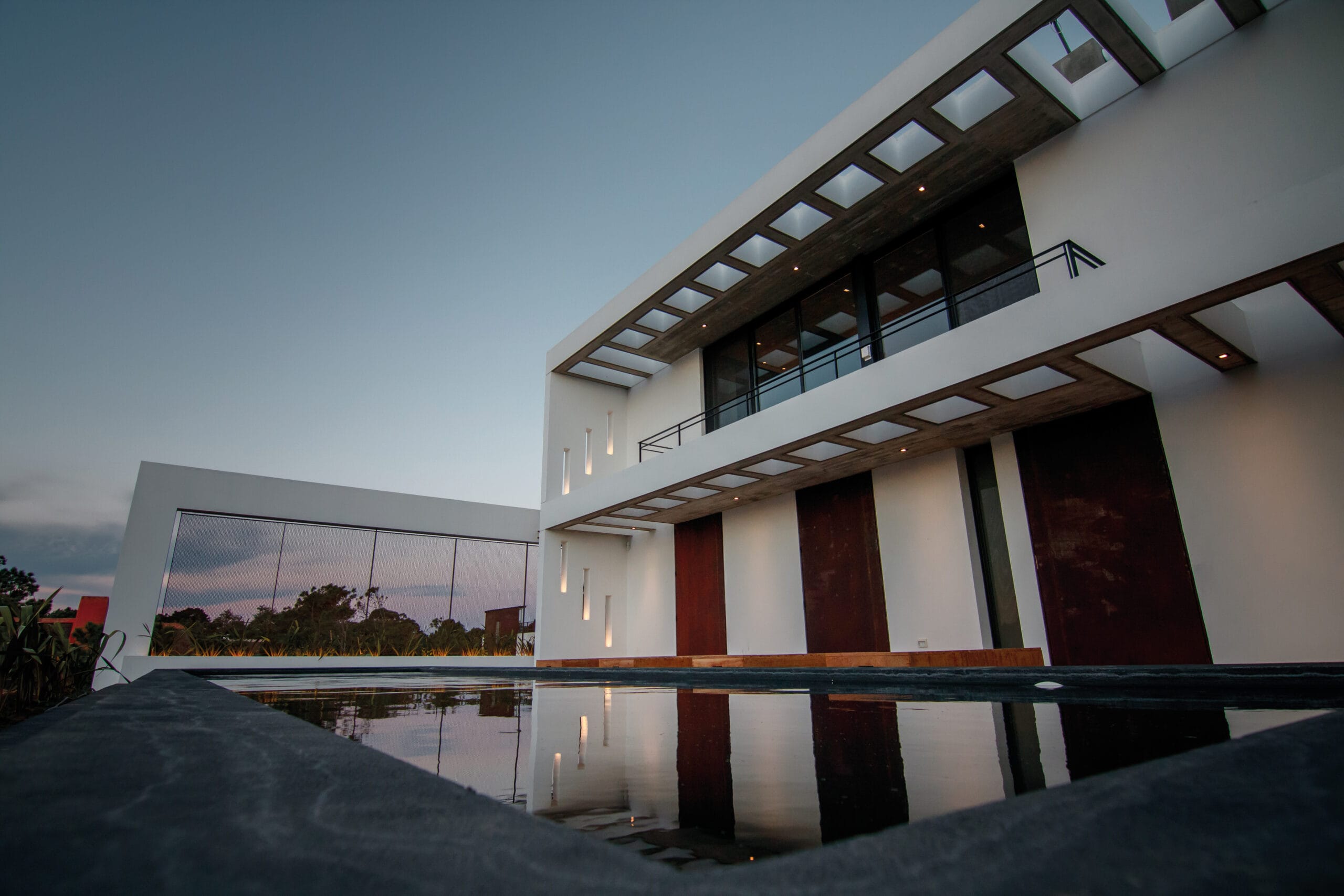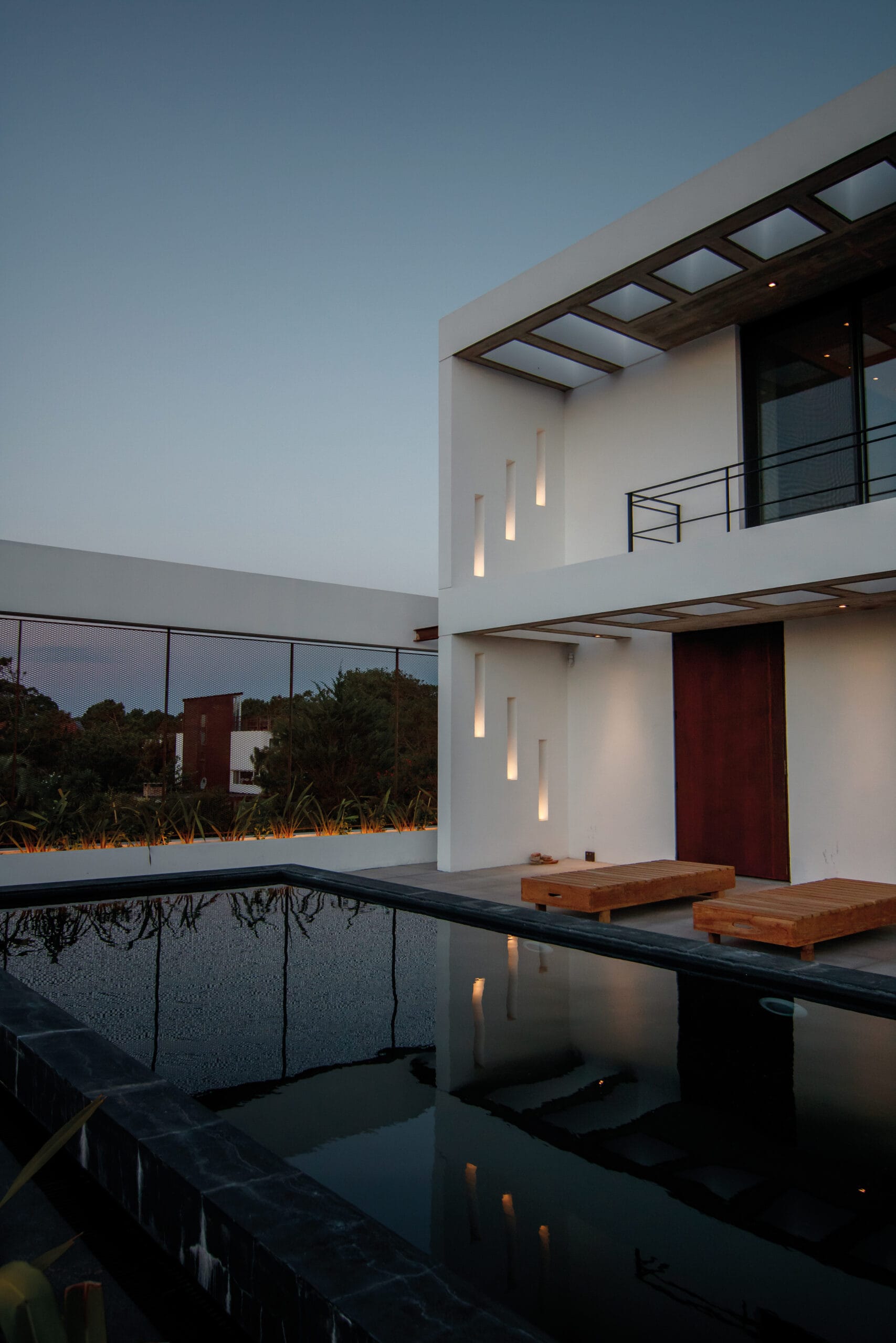 La planta baja con una amplia zona de estar y parrilla, un patio abierto al norte con la piscina, que como un espejo totalmente elevado del piso, es el centro de la casa.