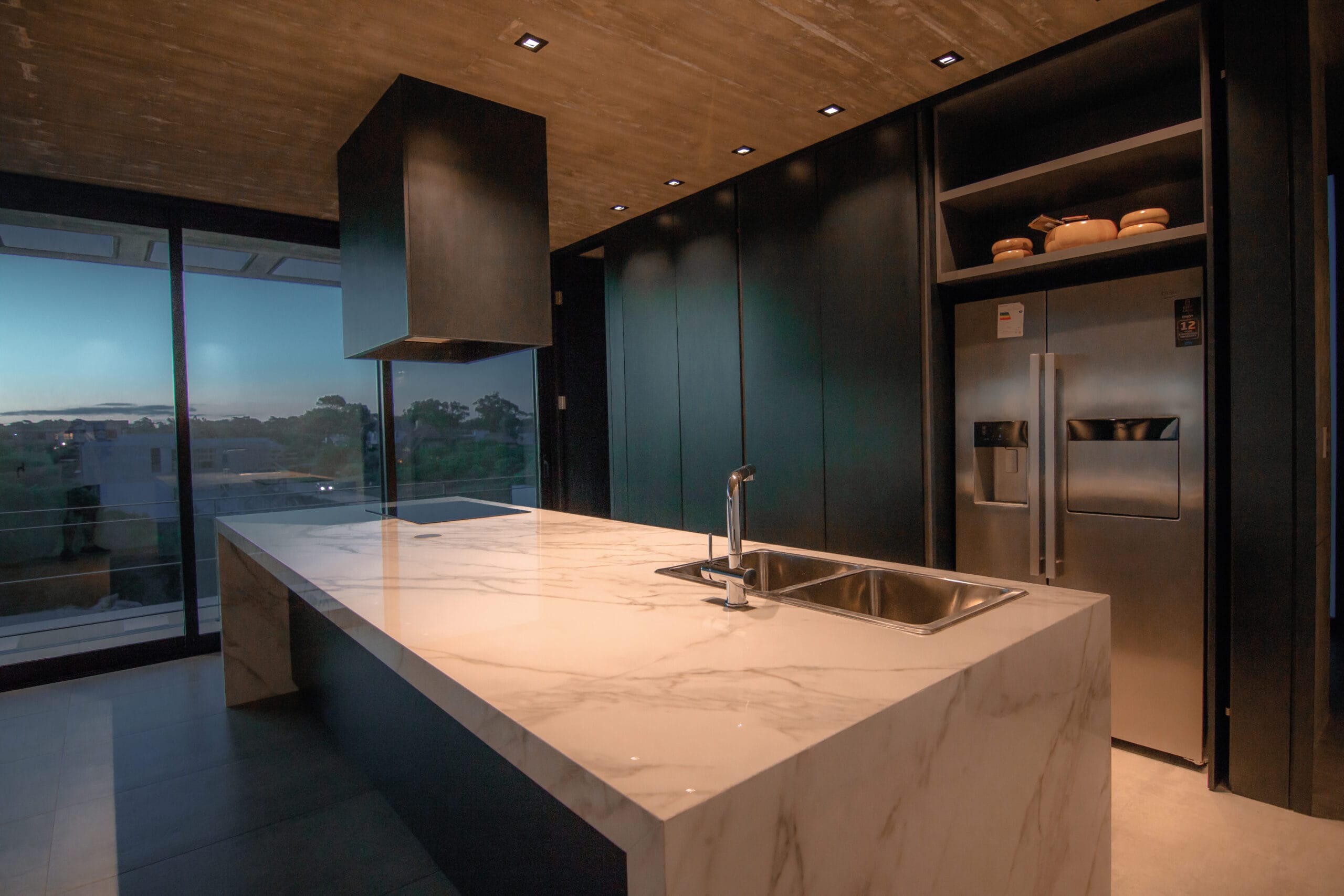 Los tonos de grises, de las losas de hormigón visto, los pisos en grandes placas color cemento, la carpintería de madera en gris oscuro con una laca perfecta se destacan, al igual que el mesón de la cocina y detalles de herrería en negro.