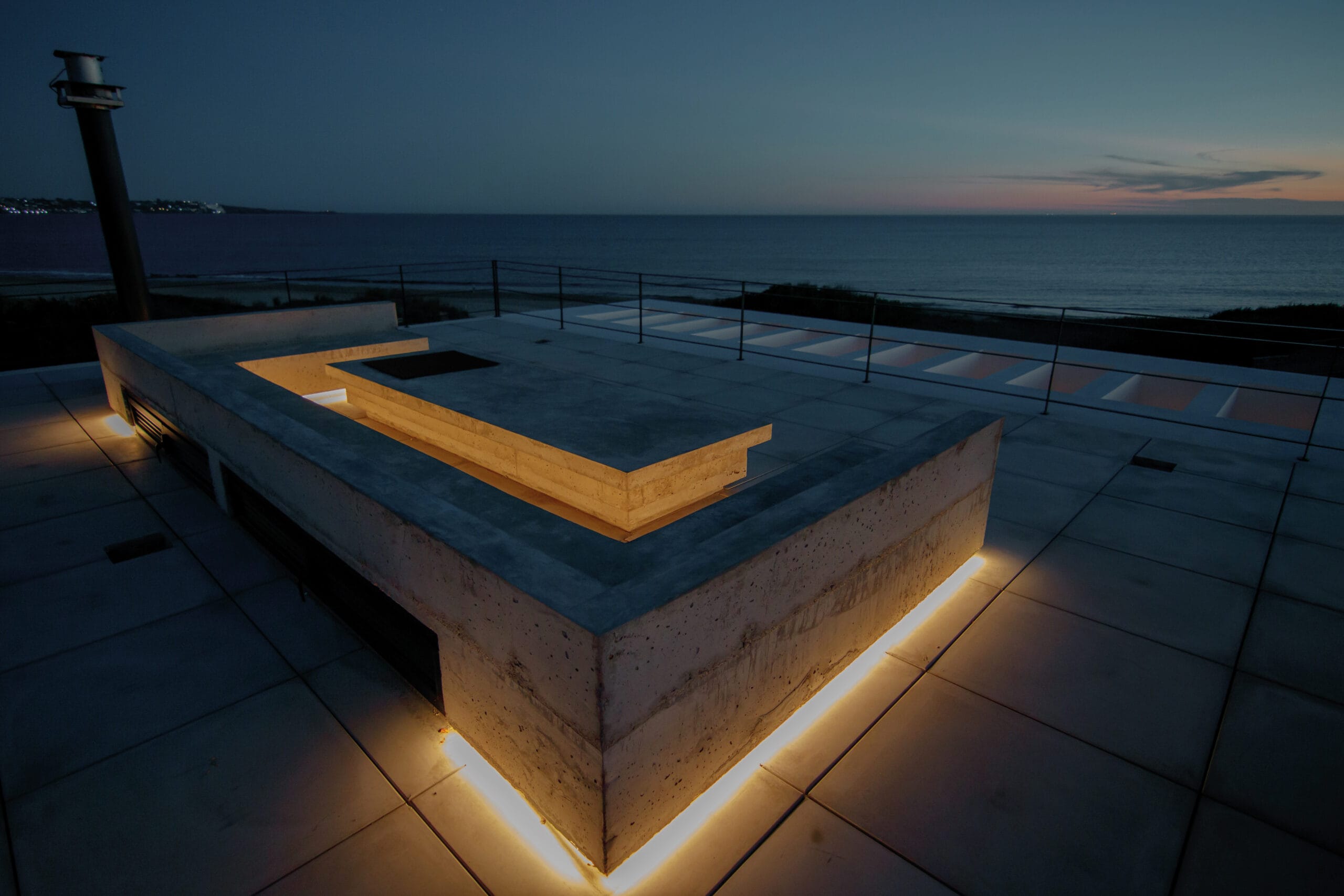 La mejor vista de la casa, es desde la terraza, que armada con un gran banco en U de hormigón visto, rodeada de plantas, se cierra sobre un fogón, armando un espacio ideal para disfrutar tanto de día como de noche.