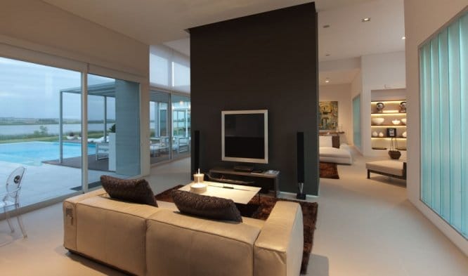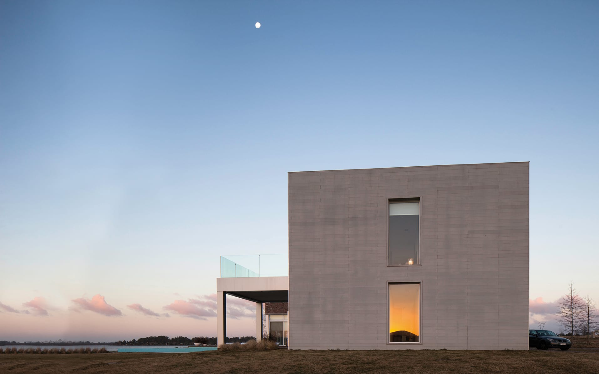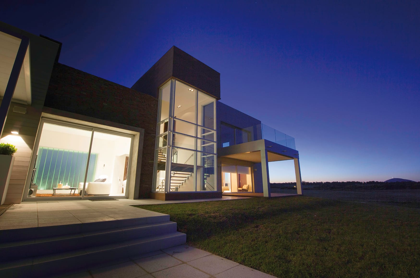 Este proyecto apela a los contrastes, y al impacto de la escala. Grandes muros casi ciegos se contrarrestan con volúmenes vidriados que se conectan con el exterior y se funden con el paisaje. La zona exterior está resuelta en torno a una piscina que es el eje de este espacio abierto. Las diferentes escenografías se logran a partir de la iluminación, es una casa distinta con la luz del amanecer, del día, del atardecer y la luz especialmente diseñada para la noche. Este proyecto es atractivo en todo momento, pero varía su percepción gracias a un minucioso estudio lumínico.