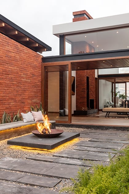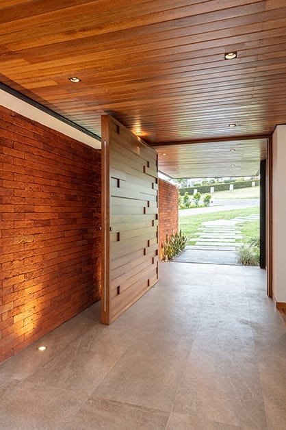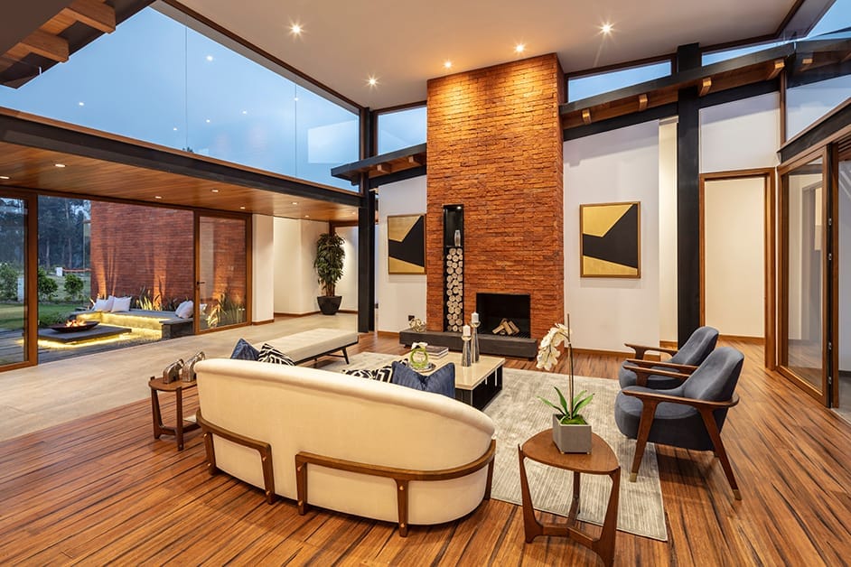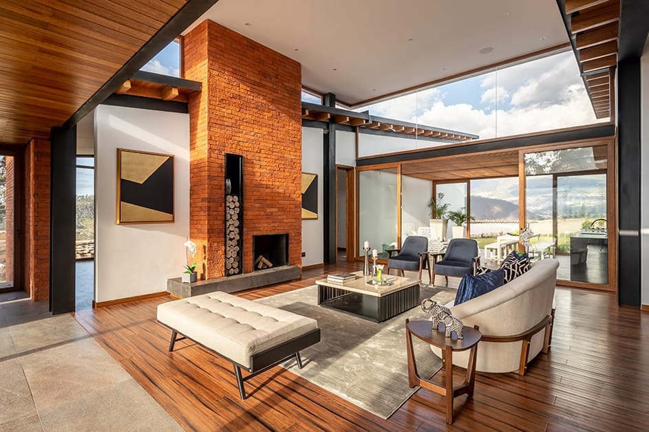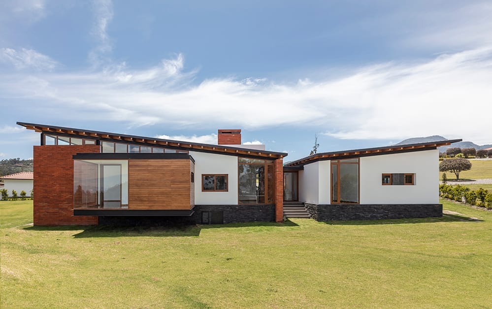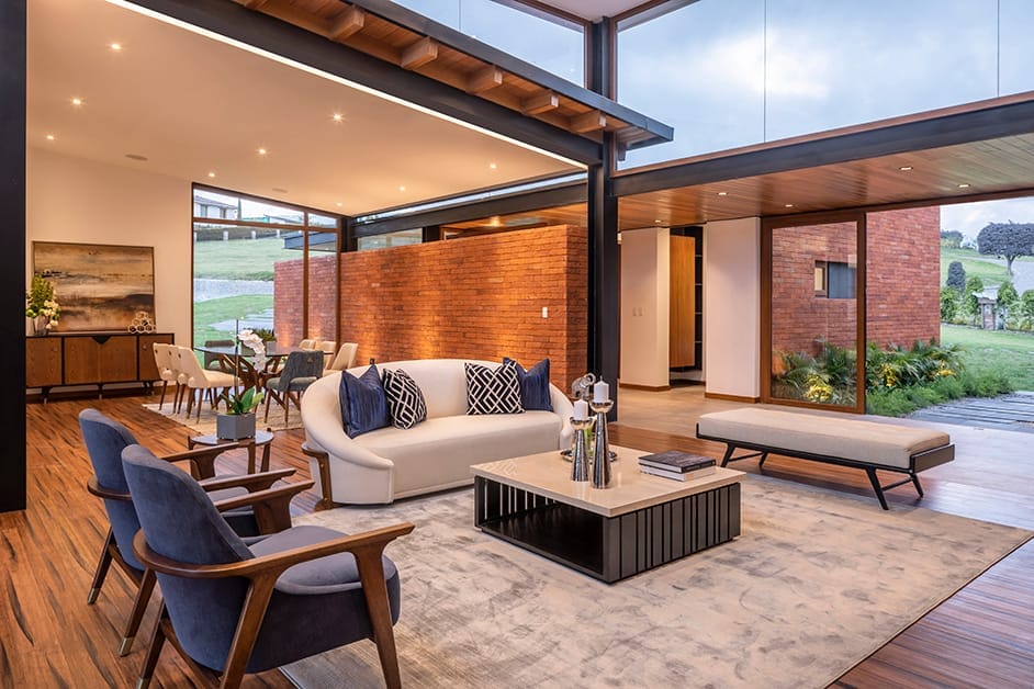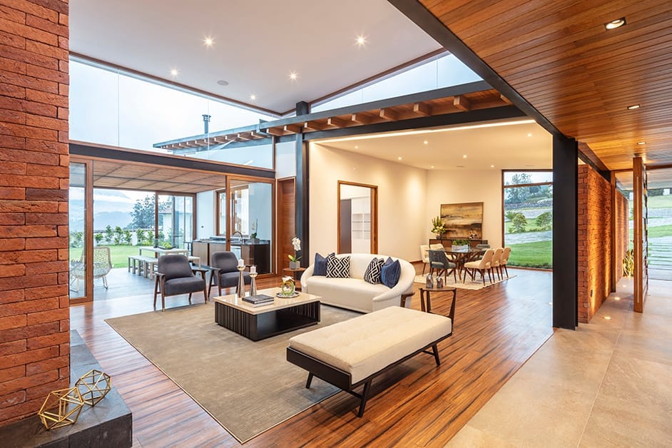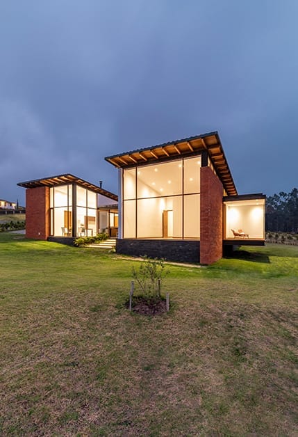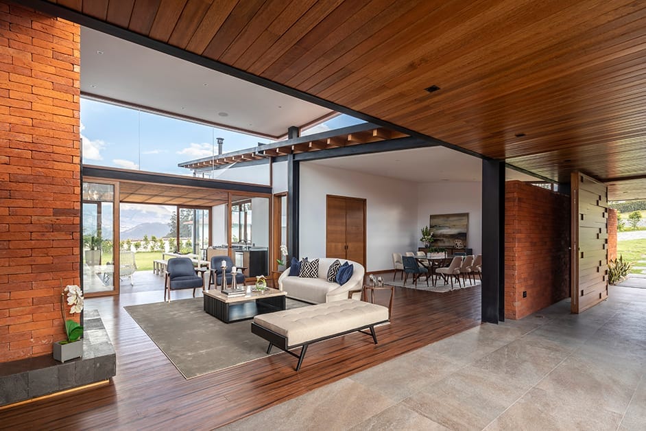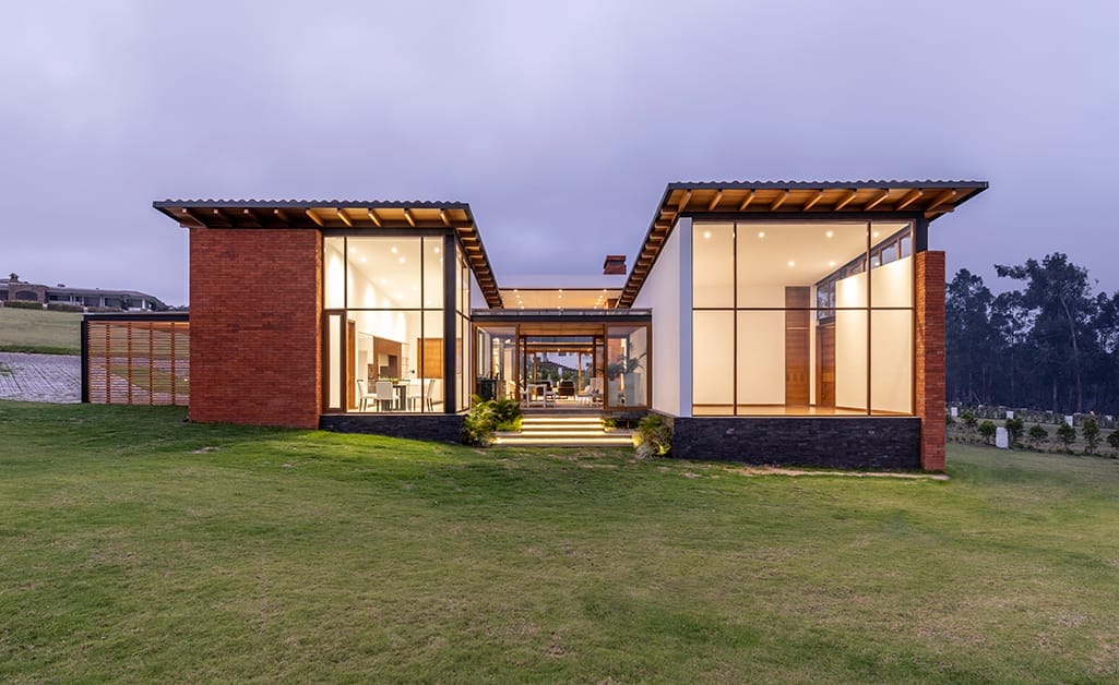Dos ejes en perpendicular atraviesan los volúmenes actuando como conexión entre los espacios de servicio, sociales y privados. El primero marca el ingreso, y se convierte en la circulación principal de la vivienda, actuando como una galería que descubre de sur a norte los espacios interiores de la casa. Esta disposición volumétrica conforma como núcleo programático el área social, la cual se potencia con una altura de piso y medio y mantiene una relación directa a todos sus lados con la posibilidad de expandirse al exterior y relacionarse con el entorno. La utilización de materiales como piedra, ladrillo y teja busca enraizar la arquitectura con su entorno y mantener armonía con las casas aledañas. Los grandes ventanales de vidrio nos permiten relacionarnos con el contexto y bañar con abundante luz los espacios interiores. El complemento de la estructura vista de acero y las paredes blancas mantienen la armonía entre tradición y actualidad.