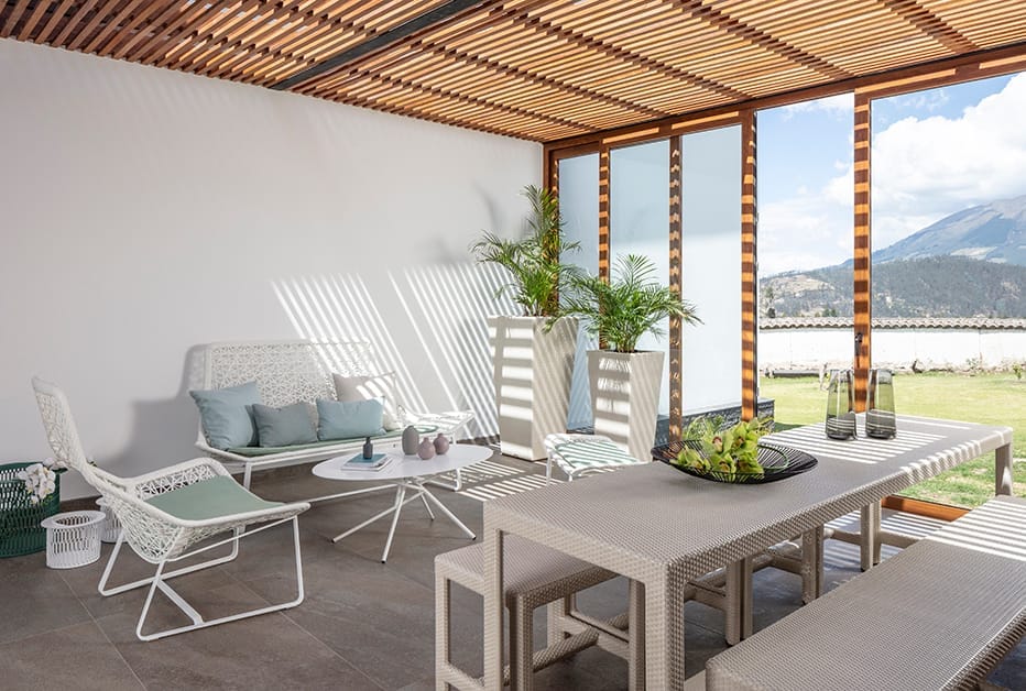 De igual manera nos encontramos con fuertes vientos provenientes del norte que se prolongan durante todo el año, al igual que el frío característico del sector. Partiendo de estas condicionantes, se define la orientación de la vivienda, la cual proveerá de una agradable sensación térmica dentro del proyecto. La propuesta volumétrica contempla dos volúmenes en paralelo sobre un zócalo de piedra, con una rotación sobre el lote que permite alinearlos con el sol naciente del este y la cumbre del Imbabura. Esta rotación a su vez permite que los vientos provenientes del norte choquen contra la construcción e impidan el paso de polvo y frío dentro de la vivienda.