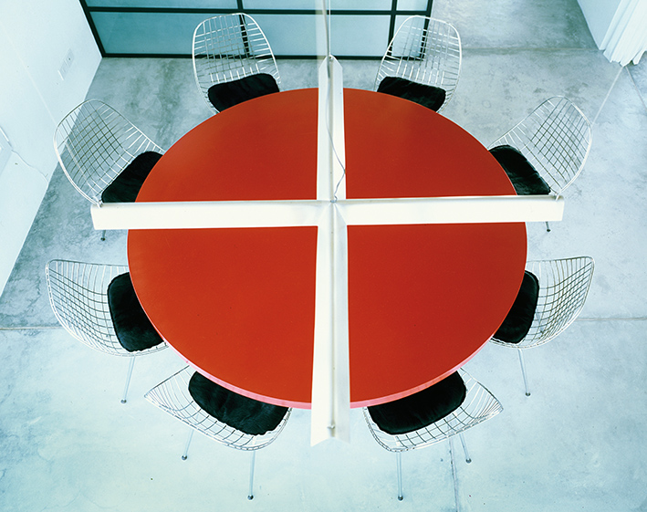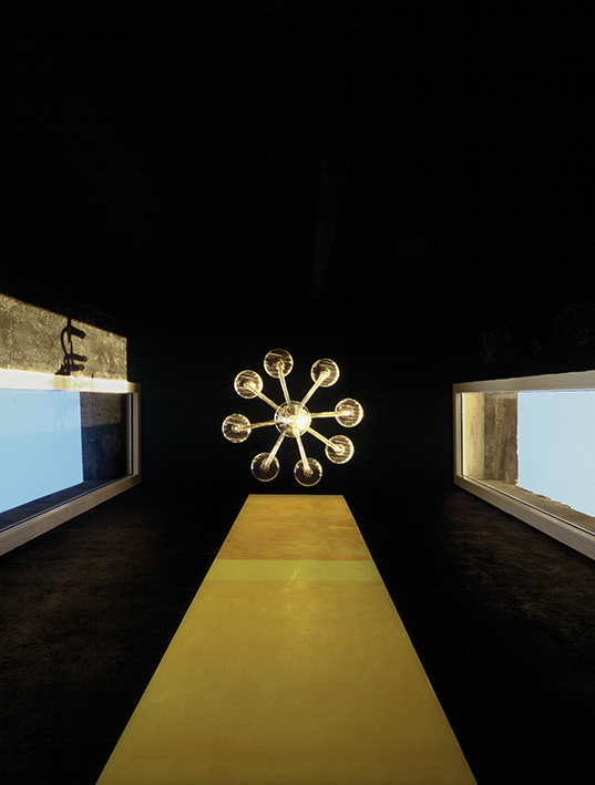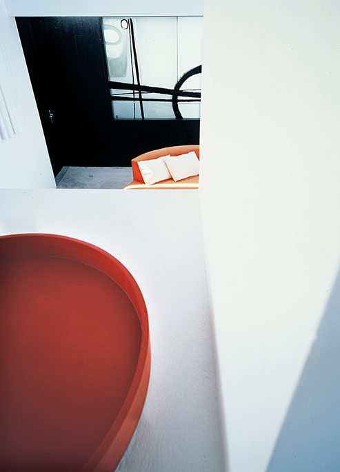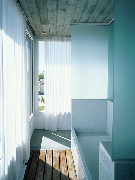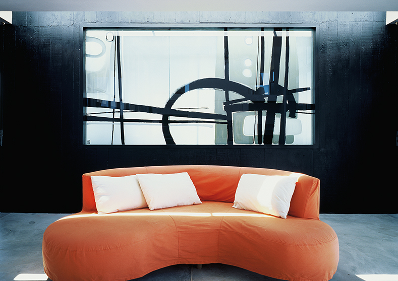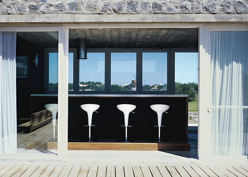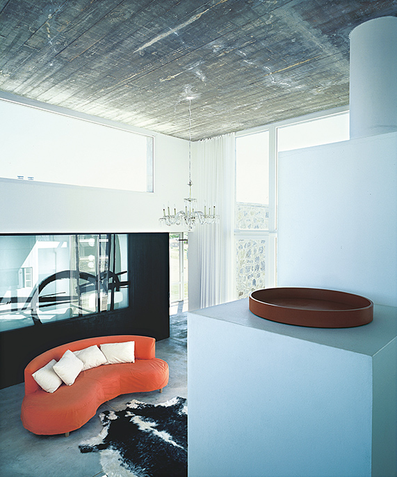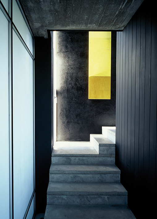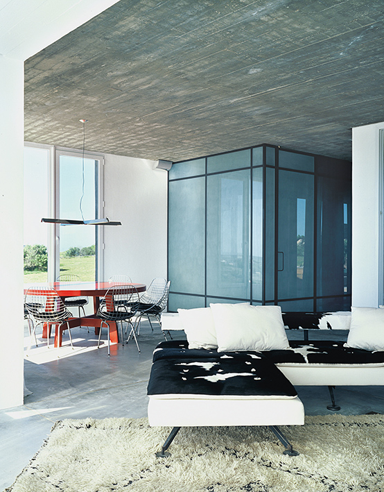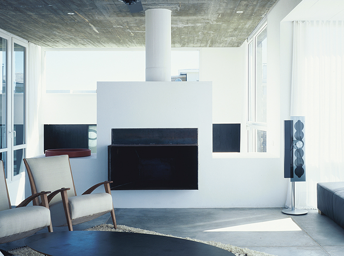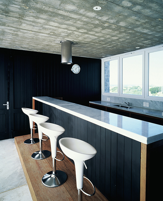 El diseño de los ambientes posee la misma fuerza, la misma cohesión que presenta su apariencia. Superficies oscuras otorgan dramatismo a la escalera o la cocina; toques de color en objetos seleccionados realza la paleta monocromática de las superficies lisas, hormigonadas. Una residencia que equilibra la serenidad propia de una casa de playa con una cuota de marcada personalidad.