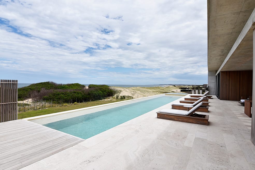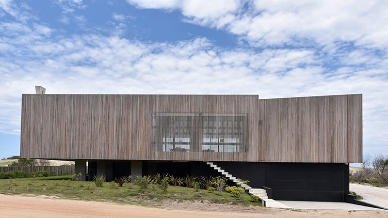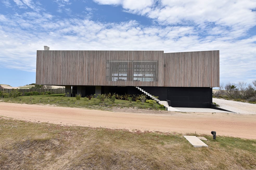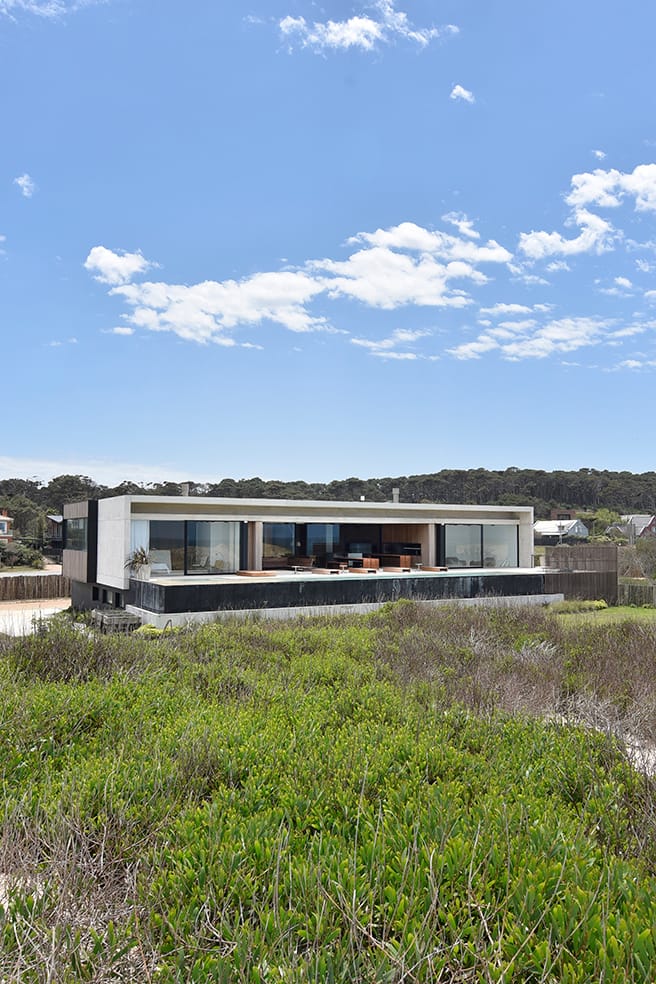 El proyecto surge desafiante desde que la ubicación del terreno propuesto es única, sobre la playa en la playa la Juanita, en la urbanización El Tesoro. El predio cuenta con un frente de cuarenta metros sobre la playa, de la cual lo separa las dunas naturales. La vista oceánica, hacia José Ignacio por un lado y hacia Punta del Este por el otro, comprometía la implantación en la necesidad de capturar la mejor visual. El partido tomado por los Arquitectos es claro, la fachada principal, orientada hacia la ruta, niega las visuales a partir de un tratamiento basado en reglas de lapacho colgada de una estructura metálica que generan una piel en parte opaca, en parte traslucida. La fachada posterior se abre totalmente hacia la playa con grandes transparencias, una gran galería y una importante piscina que recorre en buen tramo el ancho de la edificación. Los laterales se abren parcialmente, siempre bajo la protección de las reglas de lapacho que además, identifican al volumen. Dada la ubicación la elección de los materiales constituyó un aspecto vital del proyecto, se trataba de concebir una estructura con bajo mantenimiento que permitiera formas modernas con detalles contemporáneos. La estructura es de hormigón a la vista, los sectores de la fachada donde se utilizó madera fueron revestidas con lapacho, que deviene en color gris y las aberturas son de aluminio color negro. La volumetría de la casa fue definida en una “U” semi abierta para que la vista se orientara hacia hacia el océano. En el interior se mantuvo un ala central donde se ubicó el área social, living, comedor, cocina integrada y toilette, se generó una ala derecha que contiene la master suite y una suite mas pequeña y hacia el sector opuesto se concibió una tercera ala con dos dormitorios en suite y un playroom.