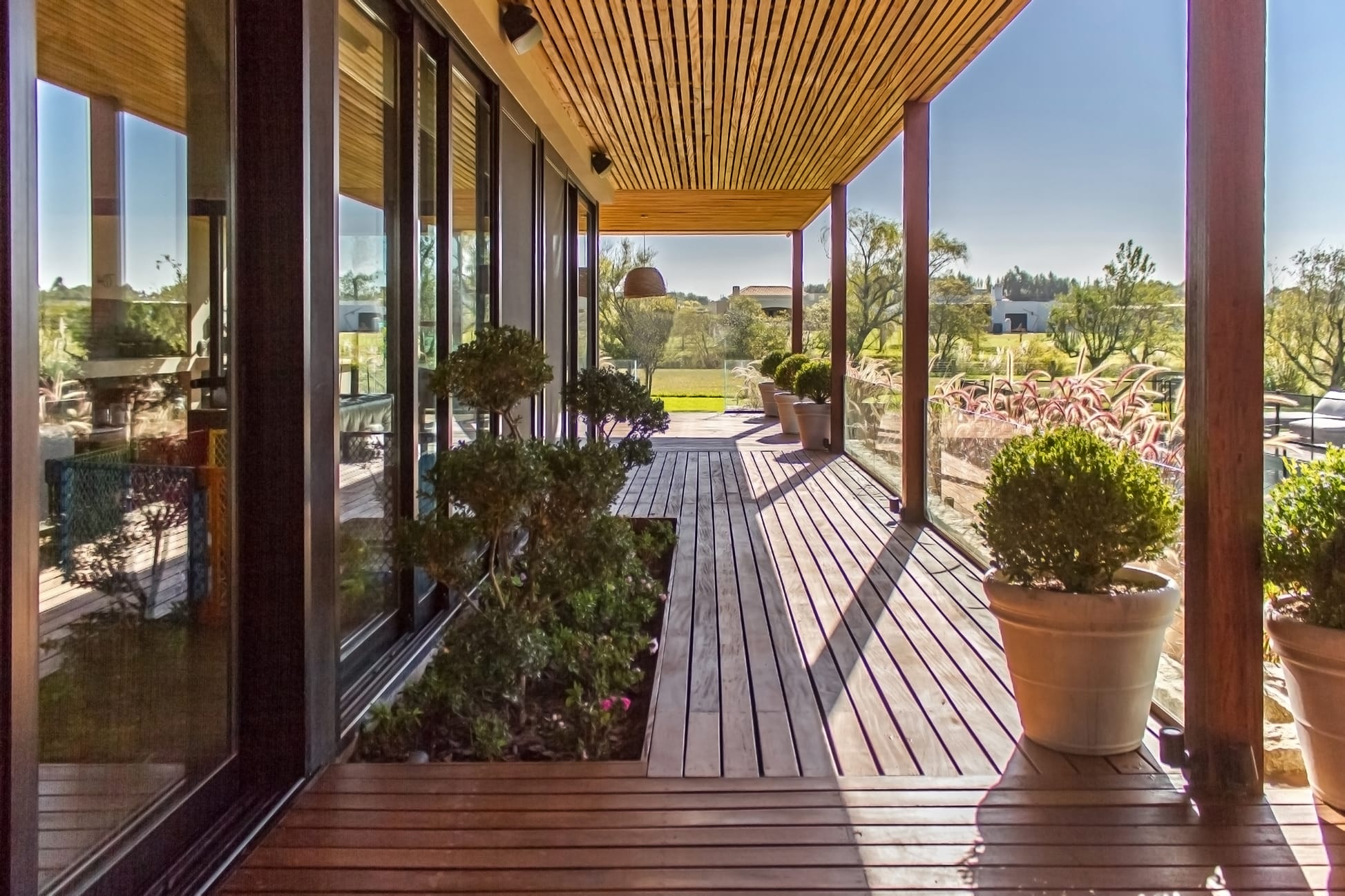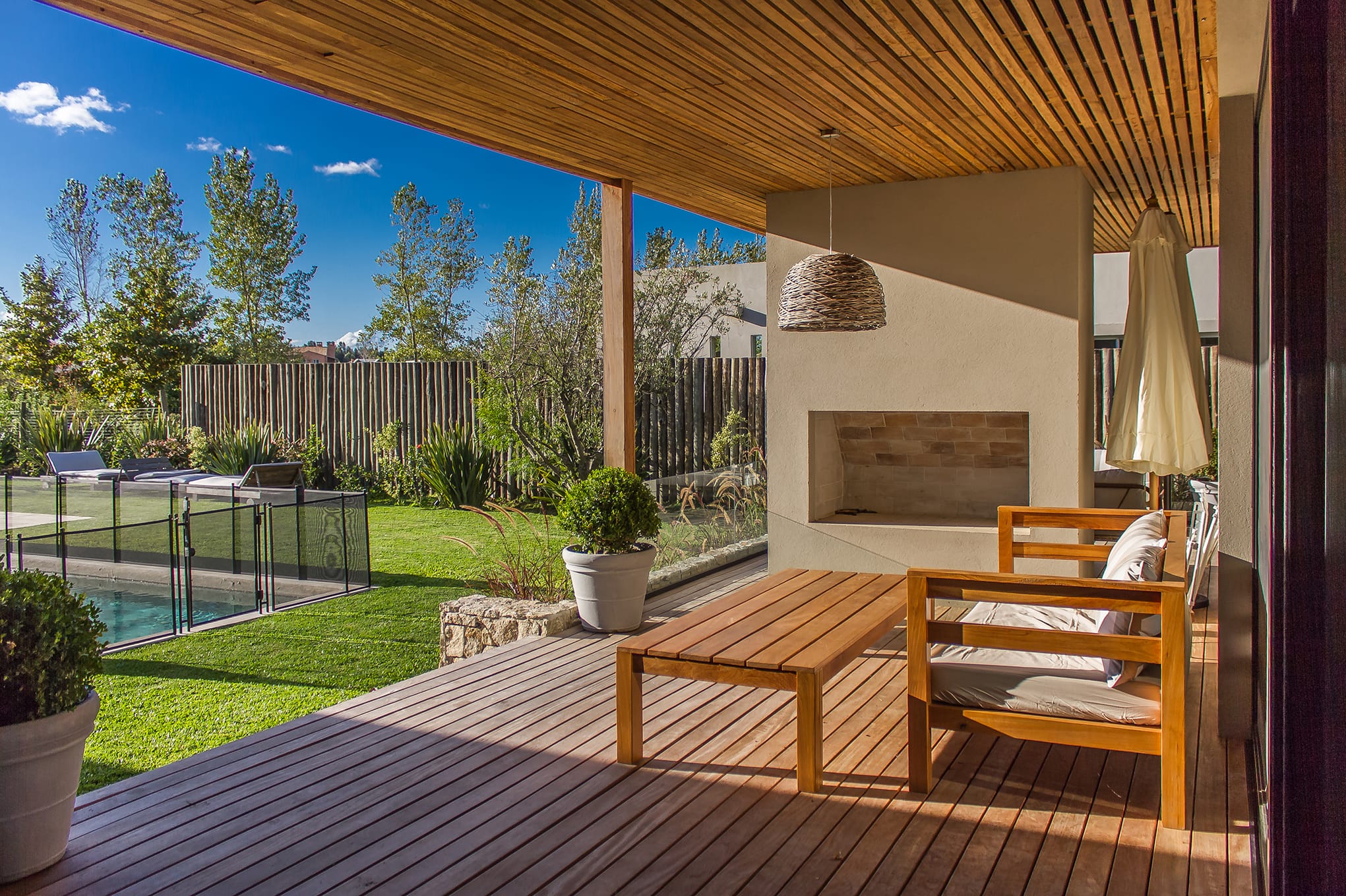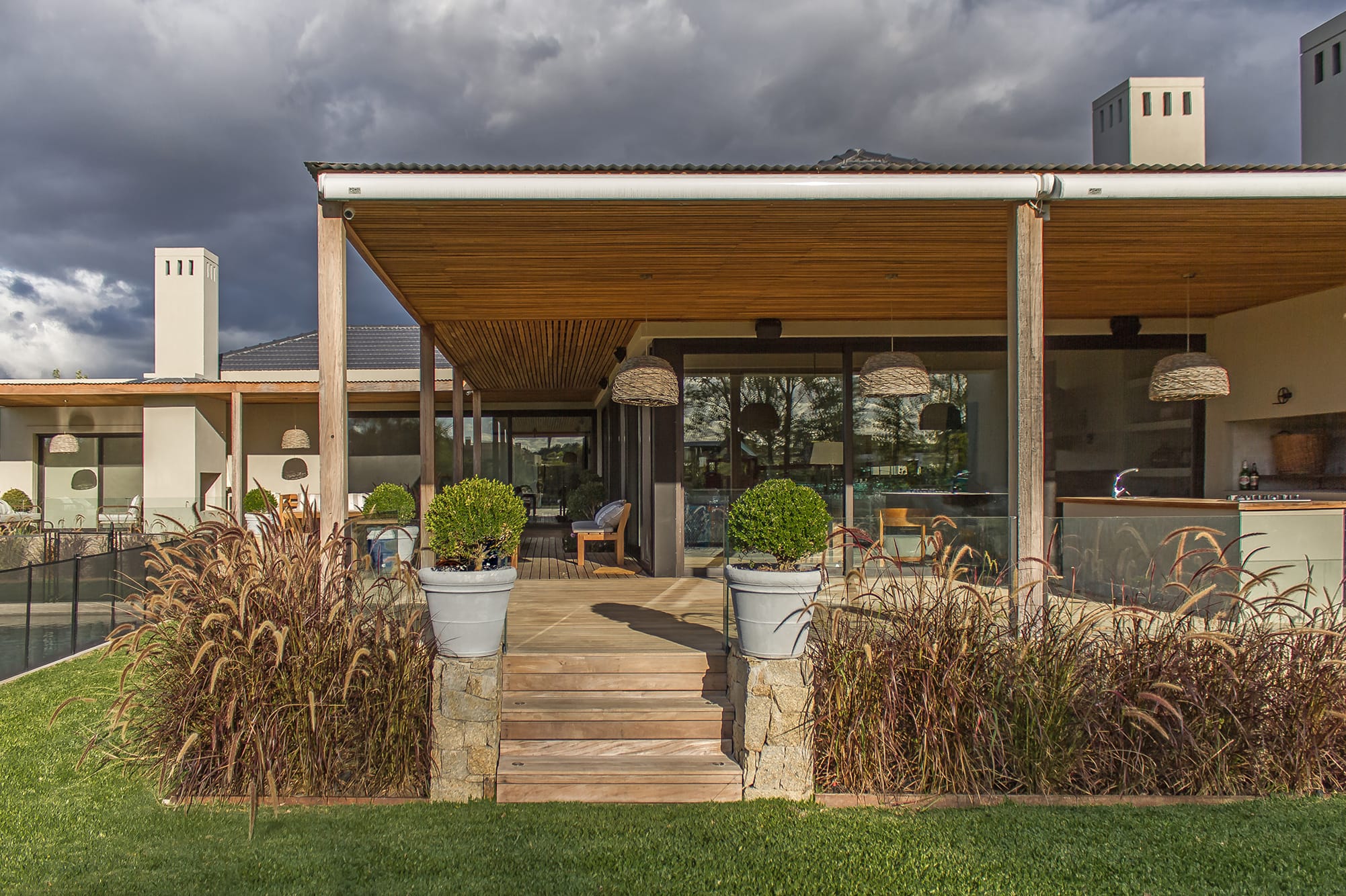 Formalmente destaca la integración de los techos que tanto se inclinan a cuatro aguas como se desarrollan rectos y planos, promoviendo un juego de alto rendimiento plástico que juega con la idea básica del proyecto, la interacción con el paisaje circundante, dato que se subraya con la importante galería que rodea a la casa.