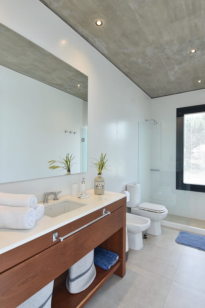 La casa se proyectó para ser construida en uno de los terrenos altos de la urbanización. La diferencia de alturas propuesta por el solar permitió a Arquitecto Casaux Alsina jugar con los desniveles y generar una estructura en dos niveles, consagrando el superior para desplegar en un mismo nivel el área habitable. En el nivel inferior se ubicaron la cochera cerrada y las salas de máquinas y mantenimiento. En este proyecto se trabajó desde un inicio bajo los conceptos originales que impone la casa patio, apoyando la distribución de la planta en la versión moderna del viejo concepto que establece que todos los espacios se alimenten de ese gran centro articulador. Una gran piscina, un deck de madera, pérgolas, espacios para vegetación y algunos muebles son el centro focal de todos los ambientes de la casa. Y a partir de ahí es que configura el diseño en planta donde los interiores se nutren del interior y viceversa. La casa diseñada por el Arquitecto Matias Casaux Alsina fue concebida en función de una segunda casa, esto es un espacio para ser habitado en los meses del verano. Tiene en consecuencia como impronta fundamental la necesidad de generar esa sensación de un fuerte vínculo con el paisaje y sus ambientes son abiertos hacia ese entorno verde.