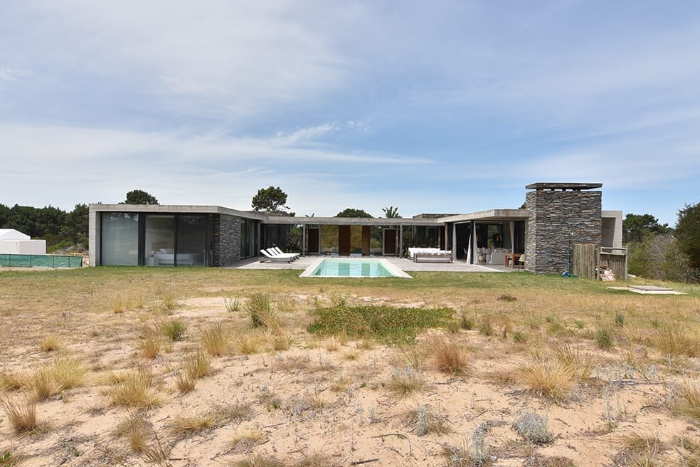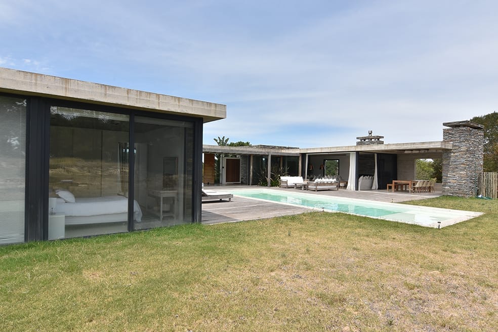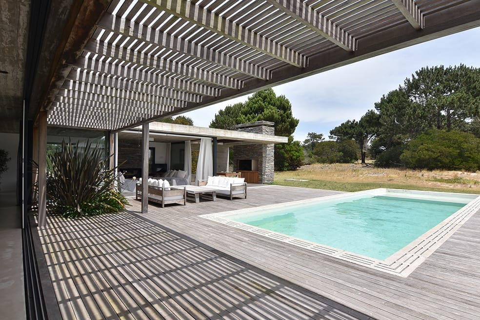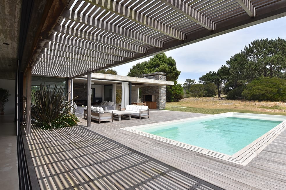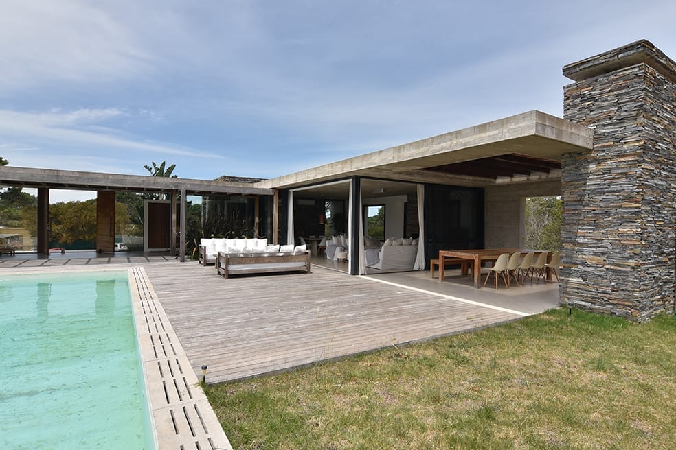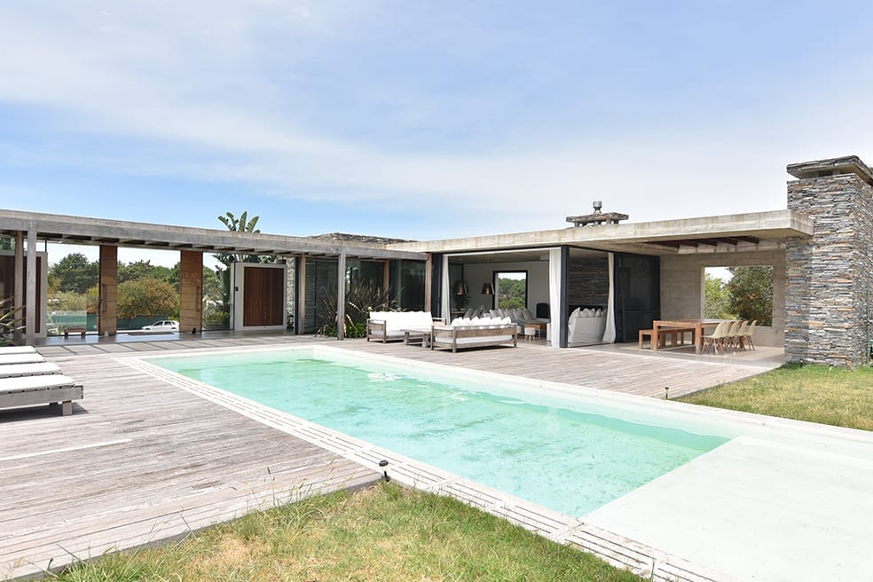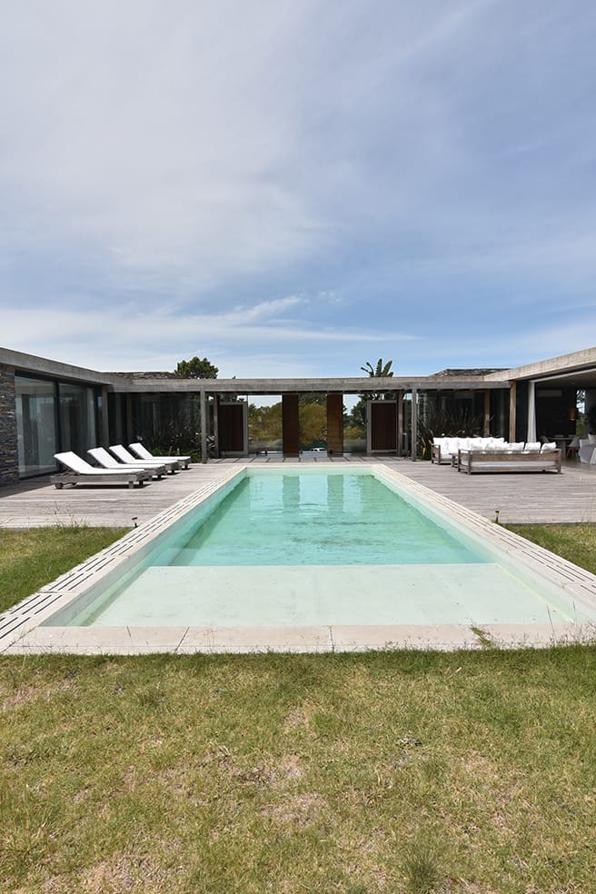 La casa se proyectó para ser construida en uno de los terrenos altos de la urbanización. La diferencia de alturas propuesta por el solar permitió a Arquitecto Casaux Alsina jugar con los desniveles y generar una estructura en dos niveles, consagrando el superior para desplegar en un mismo nivel el área habitable. En el nivel inferior se ubicaron la cochera cerrada y las salas de máquinas y mantenimiento. En este proyecto se trabajó desde un inicio bajo los conceptos originales que impone la casa patio, apoyando la distribución de la planta en la versión moderna del viejo concepto que establece que todos los espacios se alimenten de ese gran centro articulador. Una gran piscina, un deck de madera, pérgolas, espacios para vegetación y algunos muebles son el centro focal de todos los ambientes de la casa. Y a partir de ahí es que configura el diseño en planta donde los interiores se nutren del interior y viceversa. La casa diseñada por el Arquitecto Matias Casaux Alsina fue concebida en función de una segunda casa, esto es un espacio para ser habitado en los meses del verano. Tiene en consecuencia como impronta fundamental la necesidad de generar esa sensación de un fuerte vínculo con el paisaje y sus ambientes son abiertos hacia ese entorno verde.