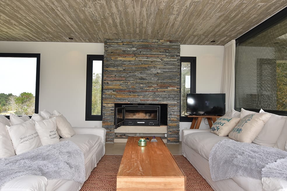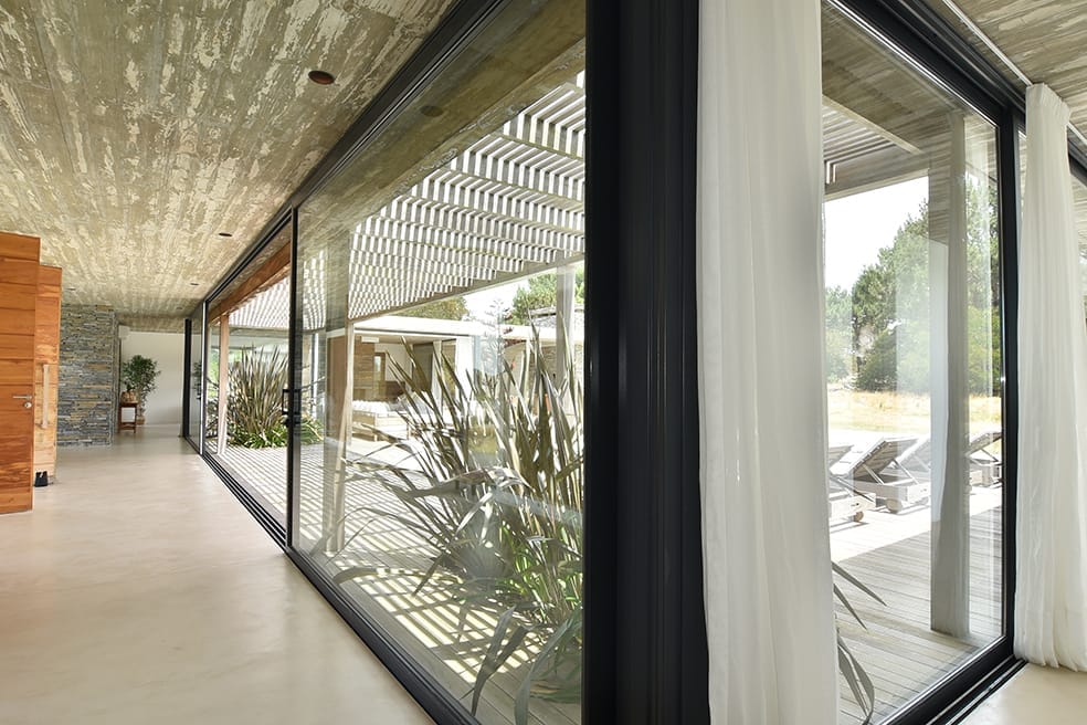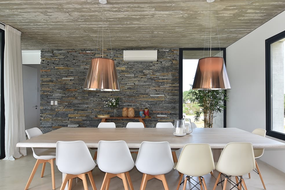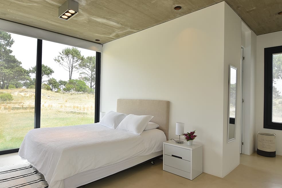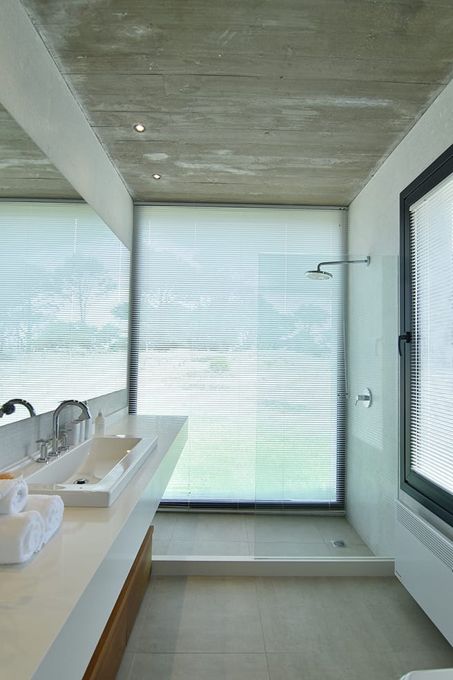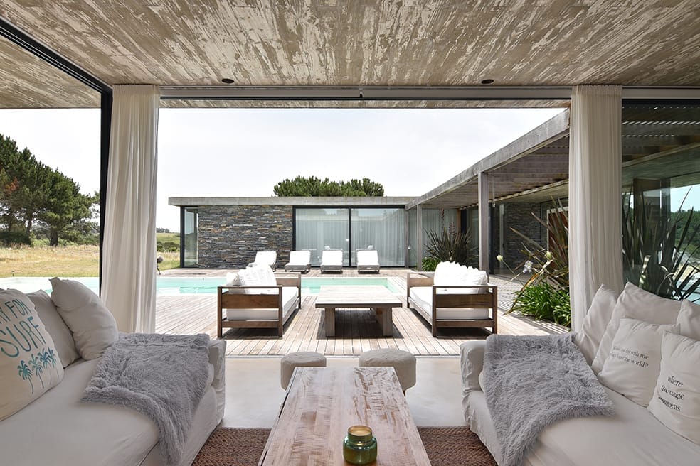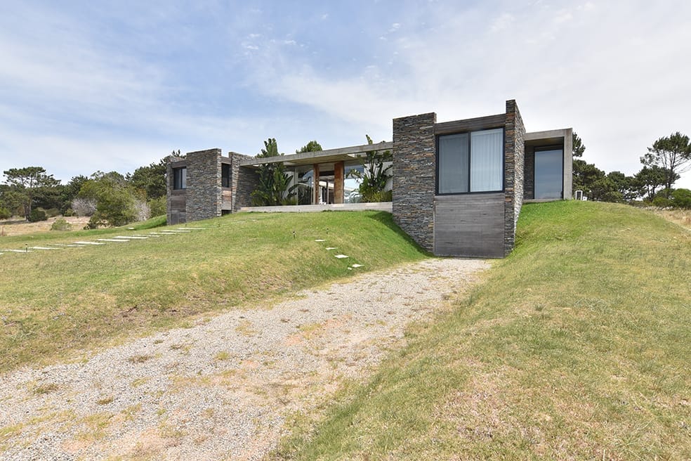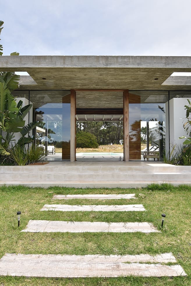 La casa se proyectó para ser construida en uno de los terrenos altos de la urbanización. La diferencia de alturas propuesta por el solar permitió a Arquitecto Casaux Alsina jugar con los desniveles y generar una estructura en dos niveles, consagrando el superior para desplegar en un mismo nivel el área habitable. En el nivel inferior se ubicaron la cochera cerrada y las salas de máquinas y mantenimiento. En este proyecto se trabajó desde un inicio bajo los conceptos originales que impone la casa patio, apoyando la distribución de la planta en la versión moderna del viejo concepto que establece que todos los espacios se alimenten de ese gran centro articulador. Una gran piscina, un deck de madera, pérgolas, espacios para vegetación y algunos muebles son el centro focal de todos los ambientes de la casa. Y a partir de ahí es que configura el diseño en planta donde los interiores se nutren del interior y viceversa. La casa diseñada por el Arquitecto Matias Casaux Alsina fue concebida en función de una segunda casa, esto es un espacio para ser habitado en los meses del verano. Tiene en consecuencia como impronta fundamental la necesidad de generar esa sensación de un fuerte vínculo con el paisaje y sus ambientes son abiertos hacia ese entorno verde.