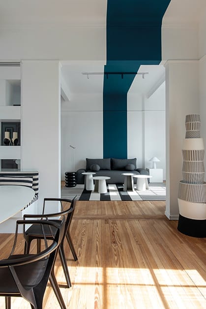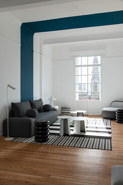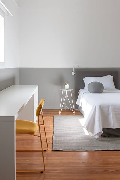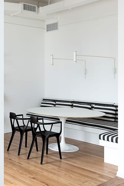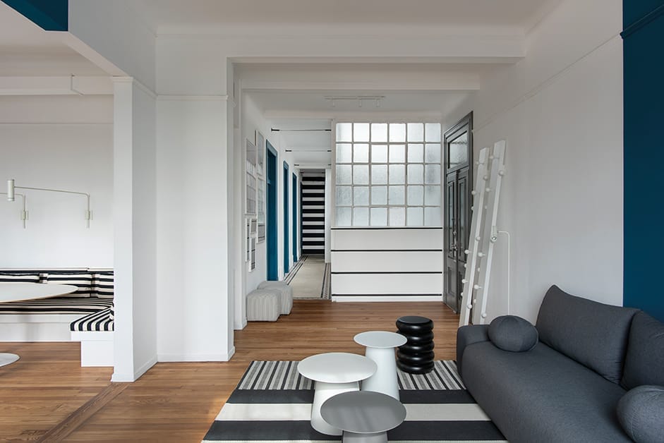 …como punto de partida del proyecto tomamos las premisas que nos pasó el Moderno en cuanto a la funcionalidad de los espacios. Por un lado generar espacios amplios y dinámicos que se adaptasen a distintas situaciones. Principalmente espacios para la vida cotidiana de los residentes de turno y espacio para que puedan trabajar en sus proyectos. Al mismo tiempo otros espacios que se adaptasen para recibir a un grupo de visitantes para una presentación o charla. En cuanto a la estética buscamos lograr un leguaje joven y moderno que a su vez dialogue con la esencia original de la casa del artista. Mantuvimos elementos decorativos originales de la casa, como molduras, pisos calcáreos, azulejos y herrajes y generamos un juego de rayas como hilo conductor que se repite en distintas materialidades y diseños a lo largo de todo el departamento, en paredes, iluminación y objetos que le dan una impronta joven y moderna. Una armoniosa convivencia de lo de antes con lo de ahora, Además, como la casa va a albergar a artistas no solo de la Argentina, sino que de todo el mundo, nos pareció un guiño especial mostrar diseño argentino. Fue así que incorporamos varios elementos de diseño argentino, entre iluminación, mobiliario y objetos. Como protagonistas, Casa Heredia tiene el lujo de contar con el sillón Pipe diseñado por Cristian Mohaded y las sillas Eutopía de Gómez Paz, ganadoras del Compasso D ́oro. La reforma de arquitectura estuvo a cargo del estudio de Arquitectura Azcuy y el Interiorismo a cargo de Estudio de Interiorismo Joanne Cattarossi Estudio. La puesta en valor de la casa taller del artista Alberto Heredia que generosamente la donó al Museo Moderno, es un gran hito para la cultura Argentina. Es la primera residencia de artistas de un museo público argentino que permitirá un intercambio enriquecedor entre entidades y artistas de todas partes del mundo… nos comenta orgullosa Joanne Cattarossi al tiempo que nos conduce por las instalaciones de este magnífico espacio recuperado.