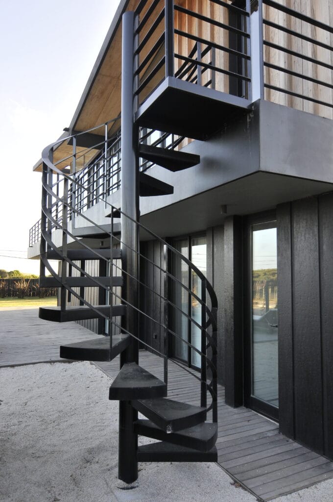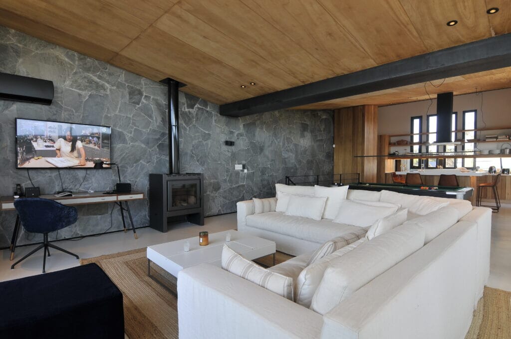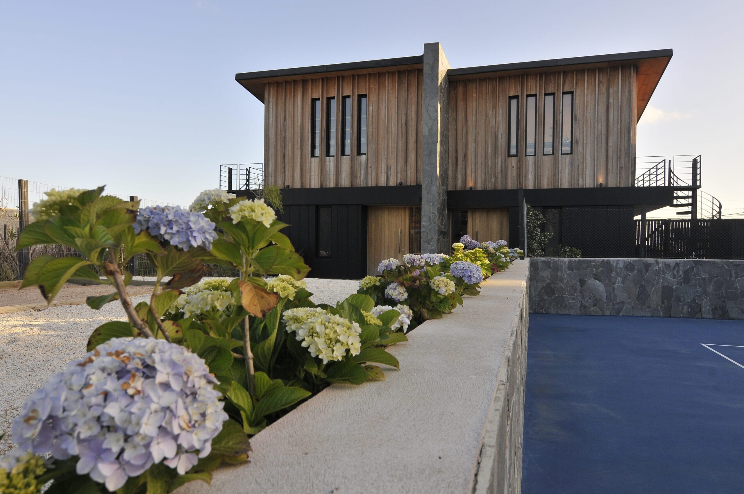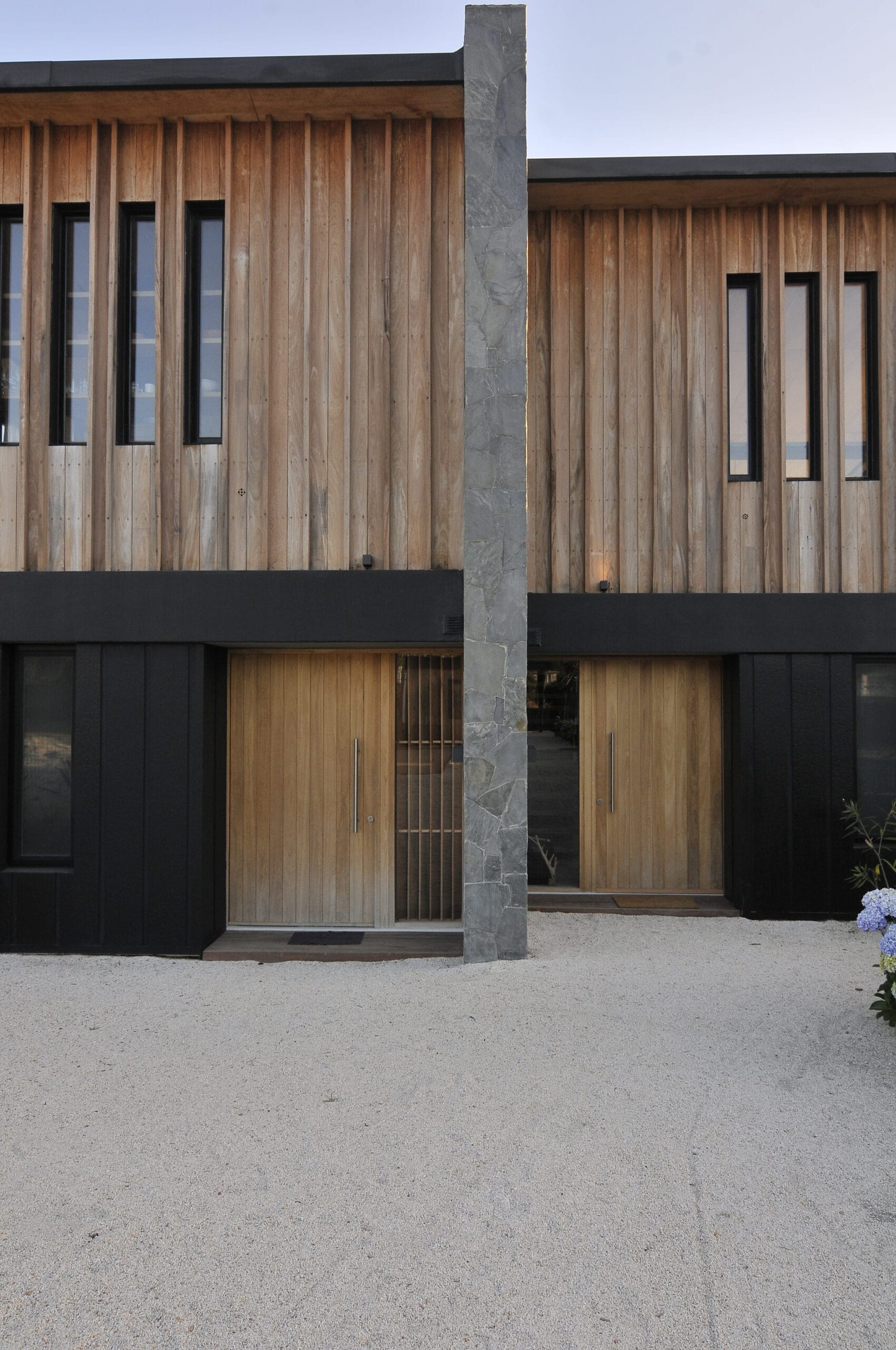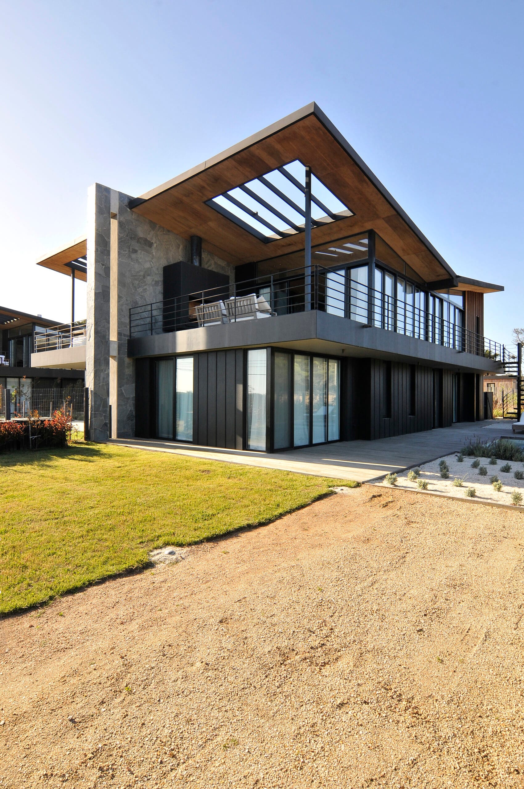 Dispuestas de dos en dos, cada vivienda guarda cuidadosamente su privacidad con altos muros de piedra medianeros, calados con franjas verticales abiertas que aseguran que no se pierdan las vistas al mar.